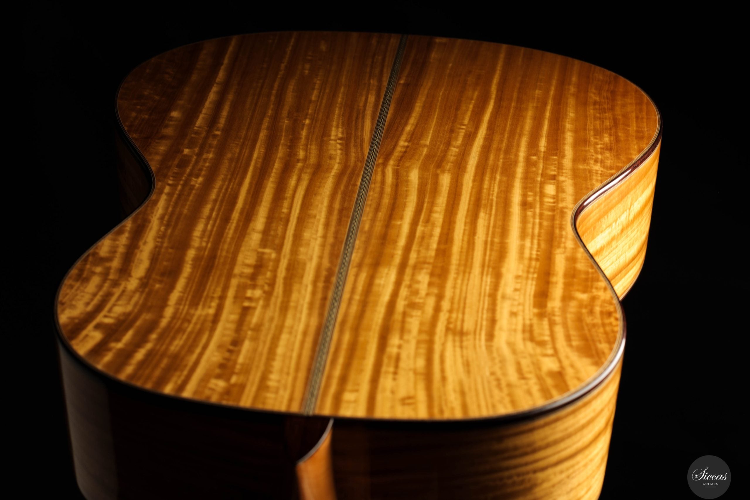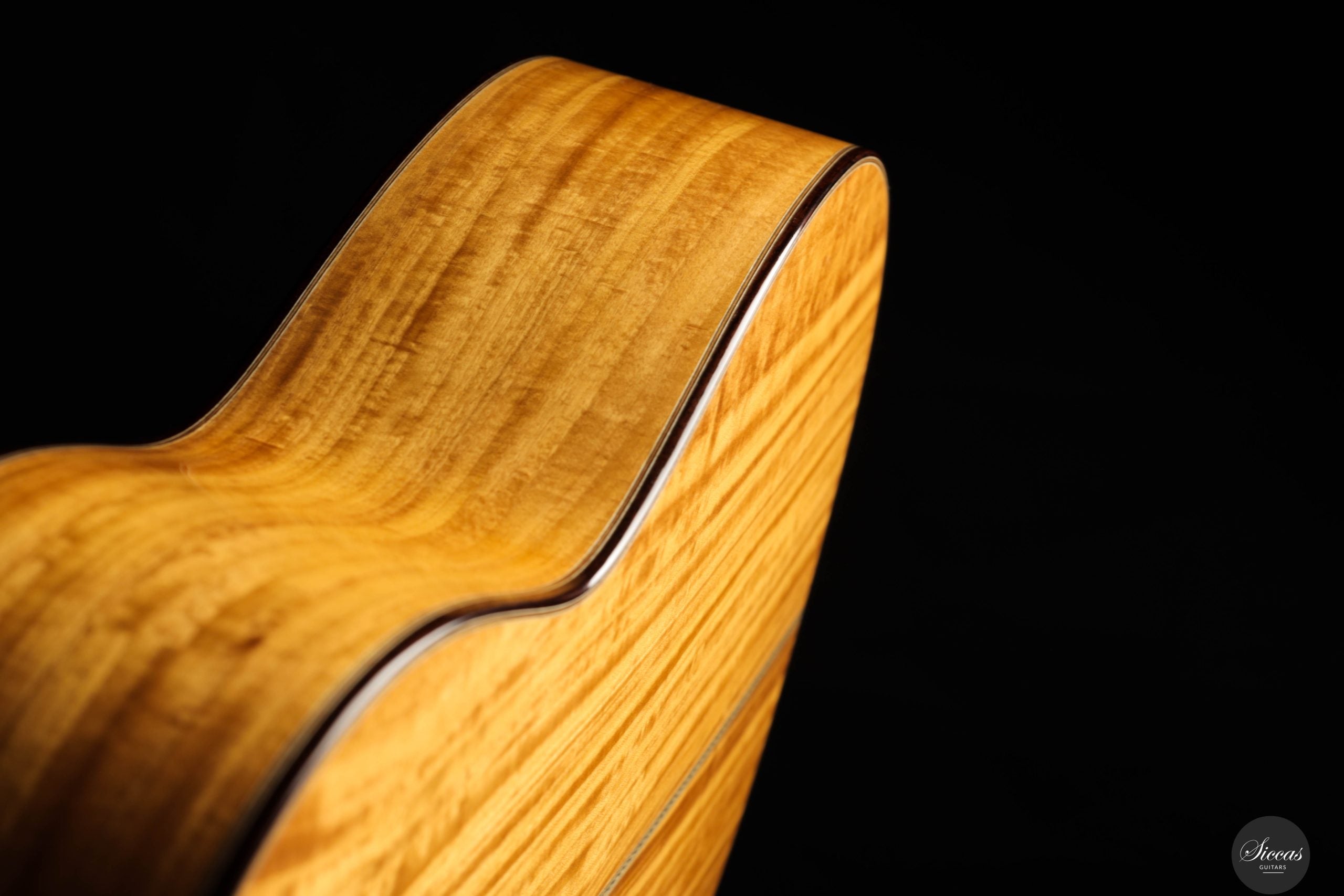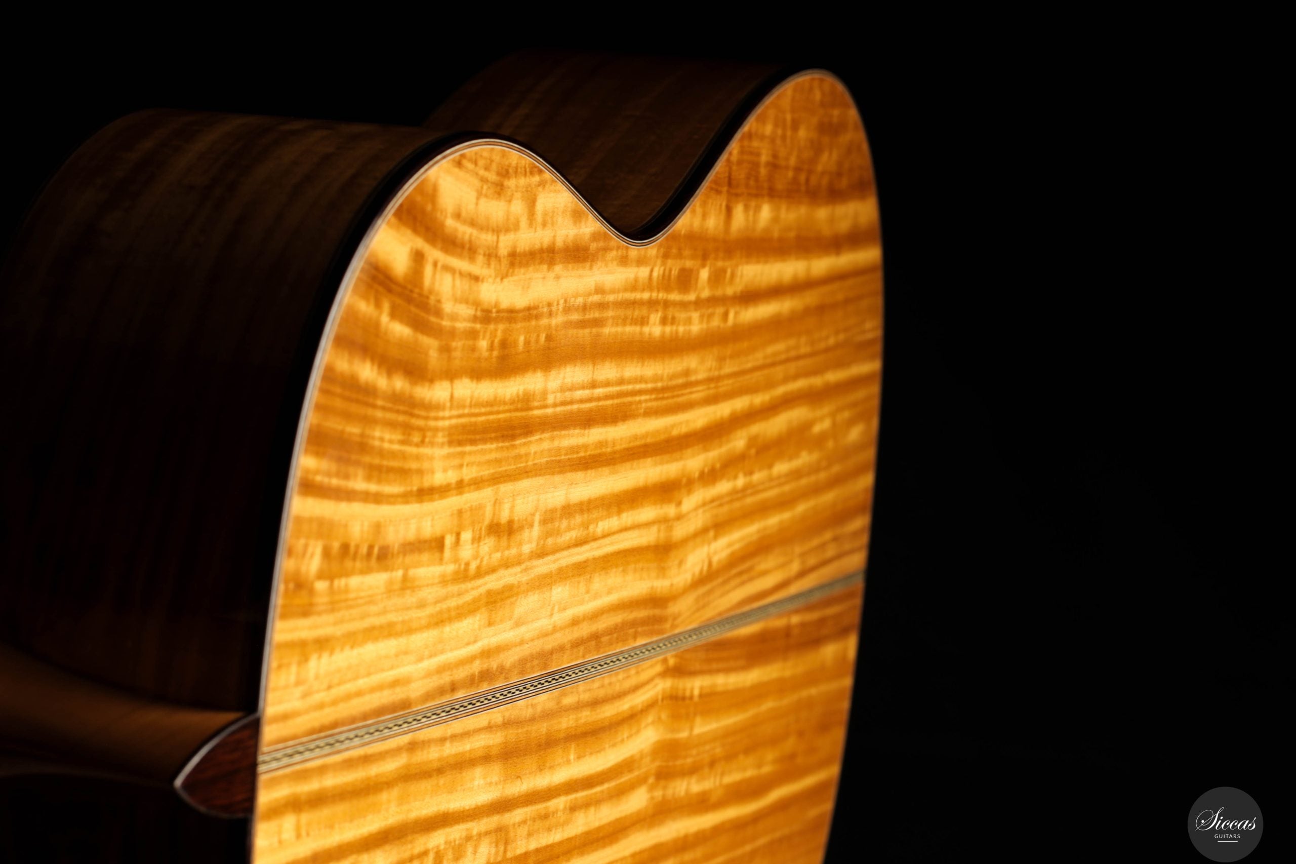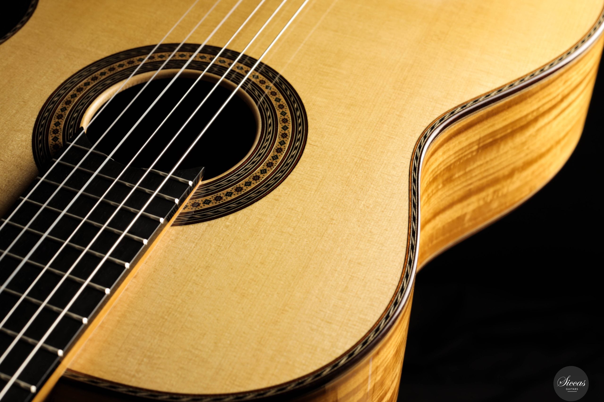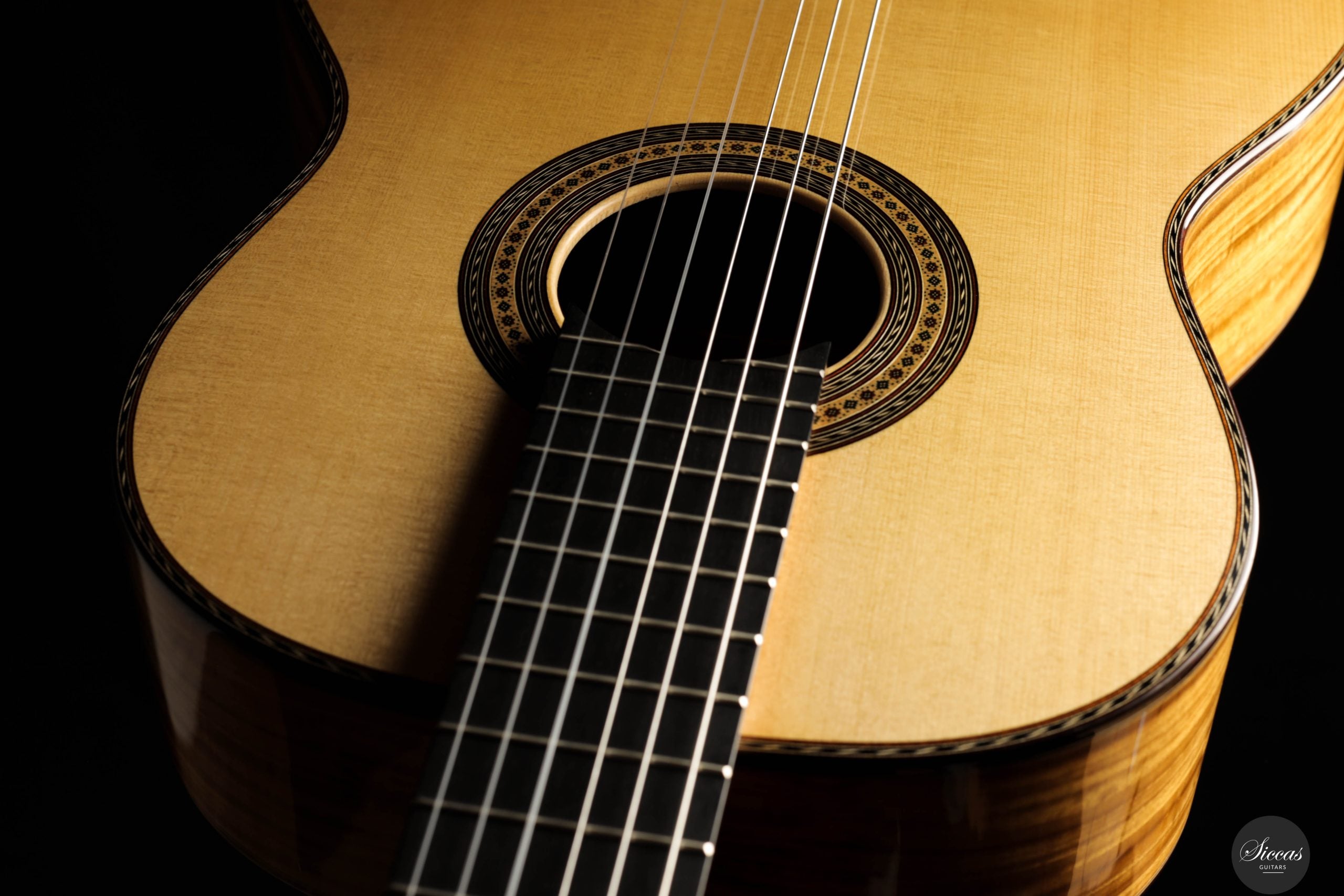 Despite its traditional voicing, the guitar incorporates several innovations aimed at enhancing volume and tonal response. The soundboard is made from carefully aged spruce and built over a fully spherical template, resulting in a domed top not only in one but in all directions. This curvature allows the top to be extremely thin while retaining structural integrity. As a result, the internal bracing consists of only four fan braces and a small bridge plate, a minimalist structure made possible by the doming. To compensate for this geometry, the guitar features an elevated fingerboard that aligns the neck to the raised top surface.