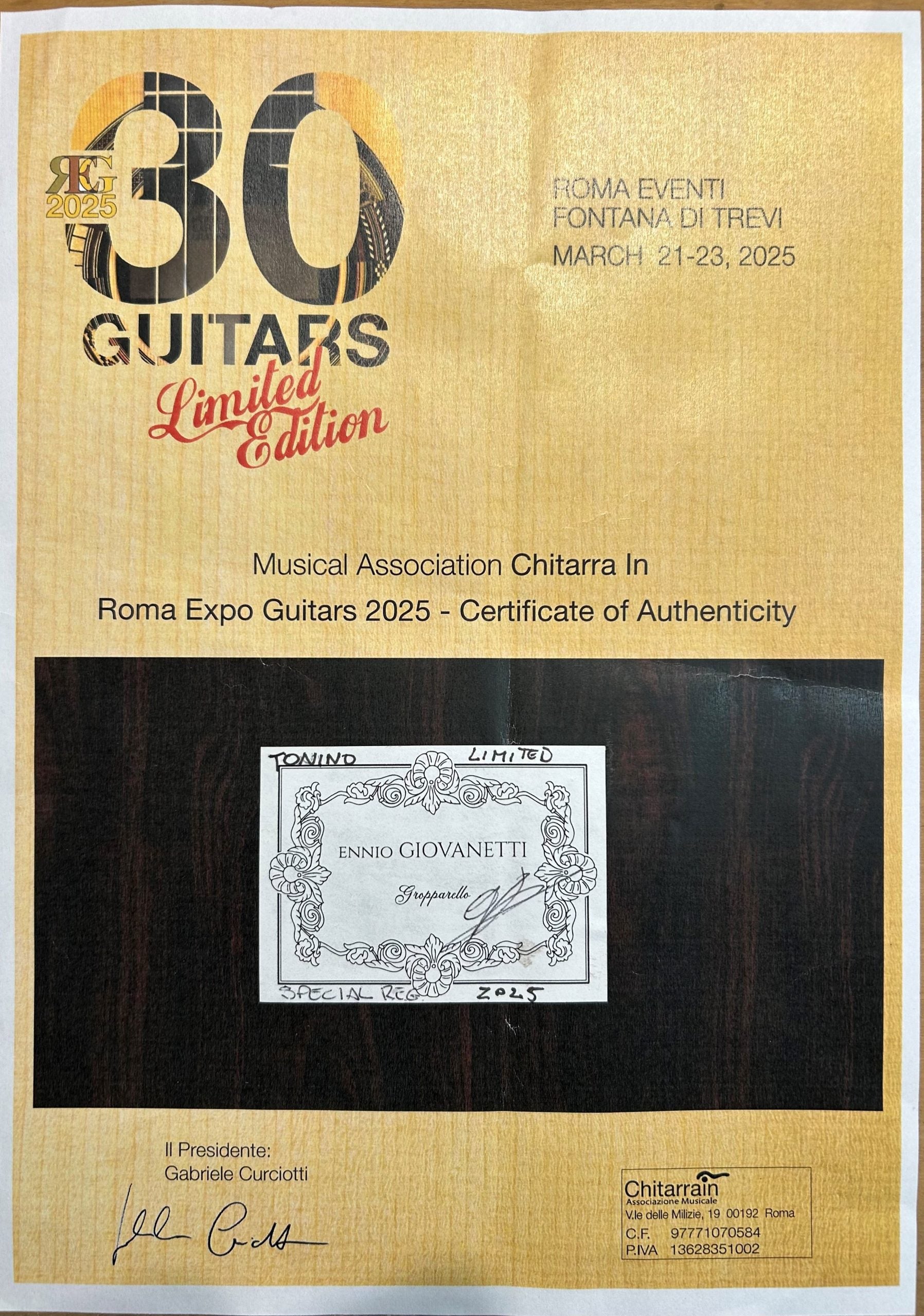 This exceptional instrument, part of the REG 2025 Limited Edition, is dedicated to Antonio Scandurra (1935–2024), a master luthier and teacher who greatly influenced Ennio Giovanetti’s path. Built in honor of this legacy, the guitar represents a synthesis of Ennio’s decades of study, experimentation, and respect for tradition.