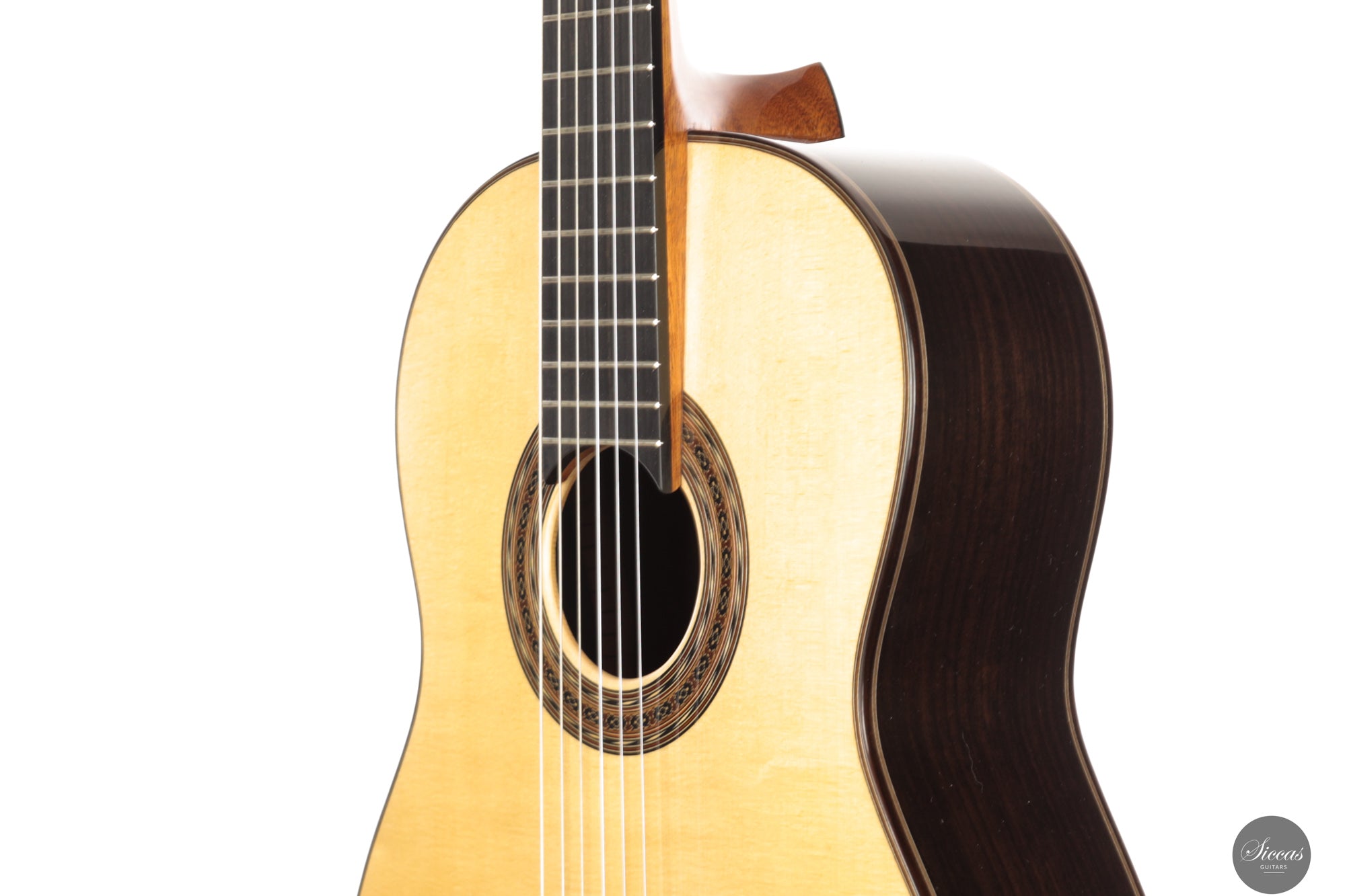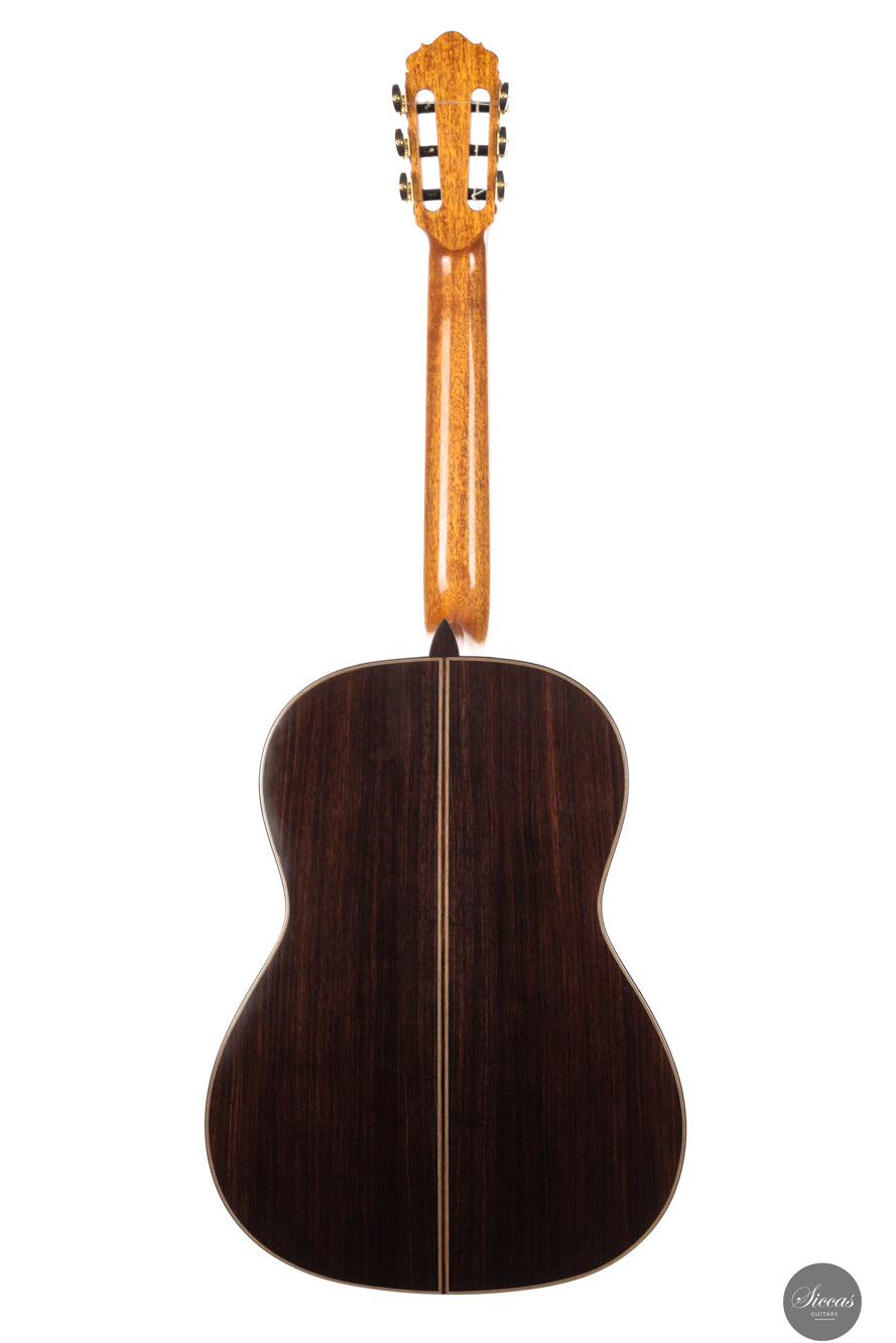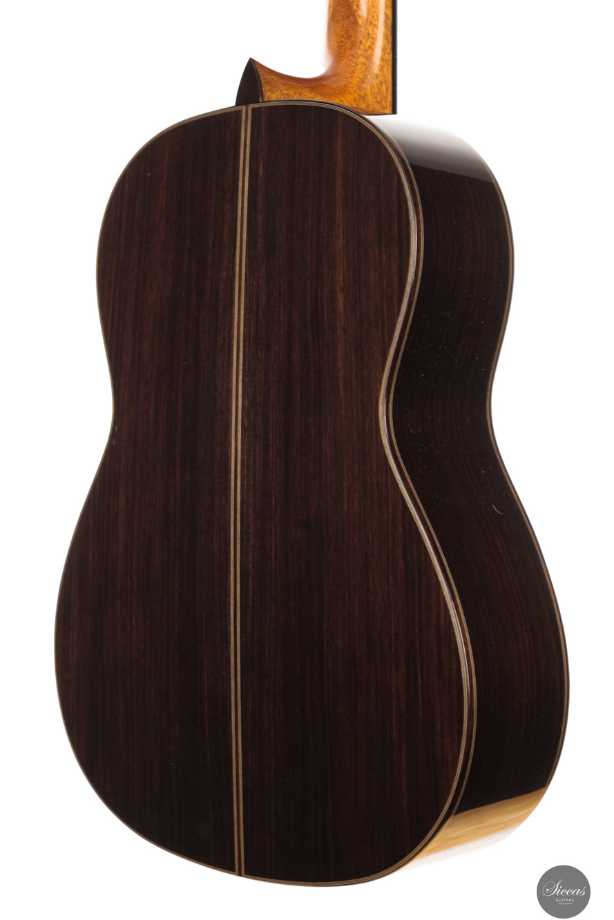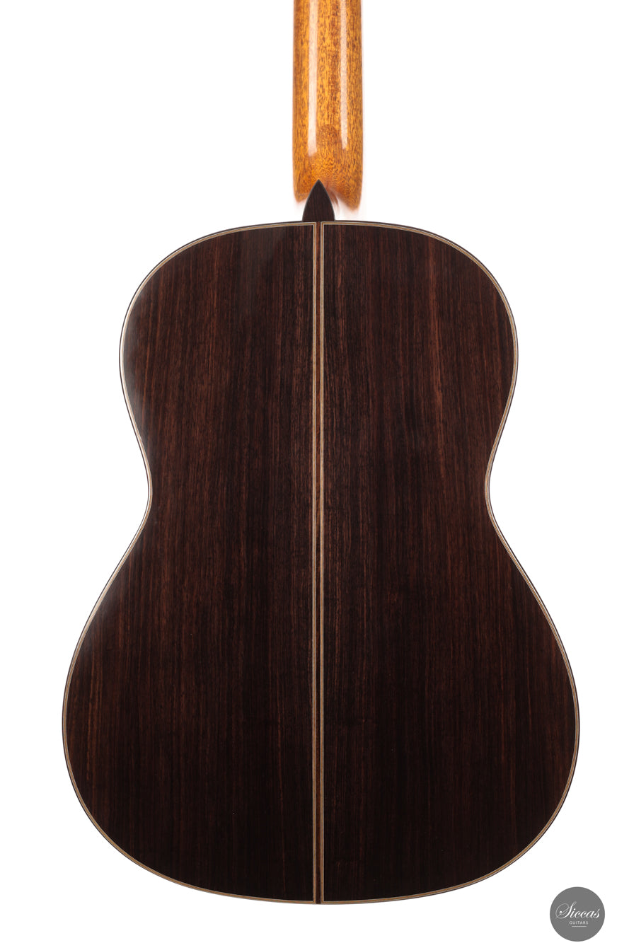 This new 2025 guitar is built in the traditional manner with a spruce top and Indian rosewood for the back and sides. The entire instrument is finished with French polish and has an elevated fingerboard that supports comfortable access to the higher positions. The guitar weighs 1630 grams and feels solid yet responsive in the hands. The Alessi tuning machines offer smooth precision and complement the refined appearance of the instrument. The rosette recalls a familiar aesthetic vocabulary often associated with Daniel Friederich, which Giovanetti interprets with his own gentle and personal touch.