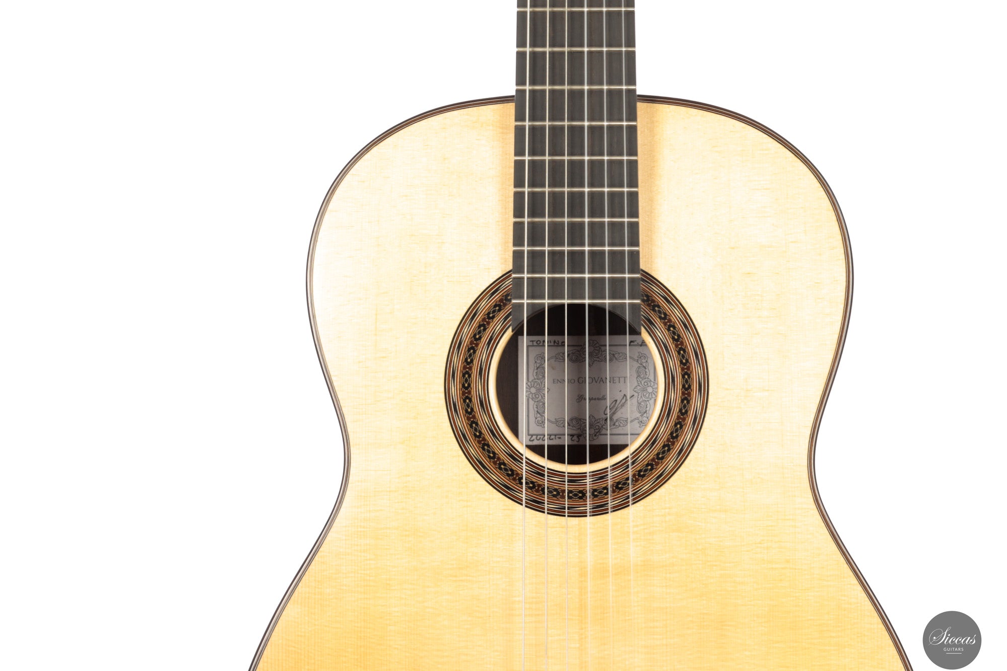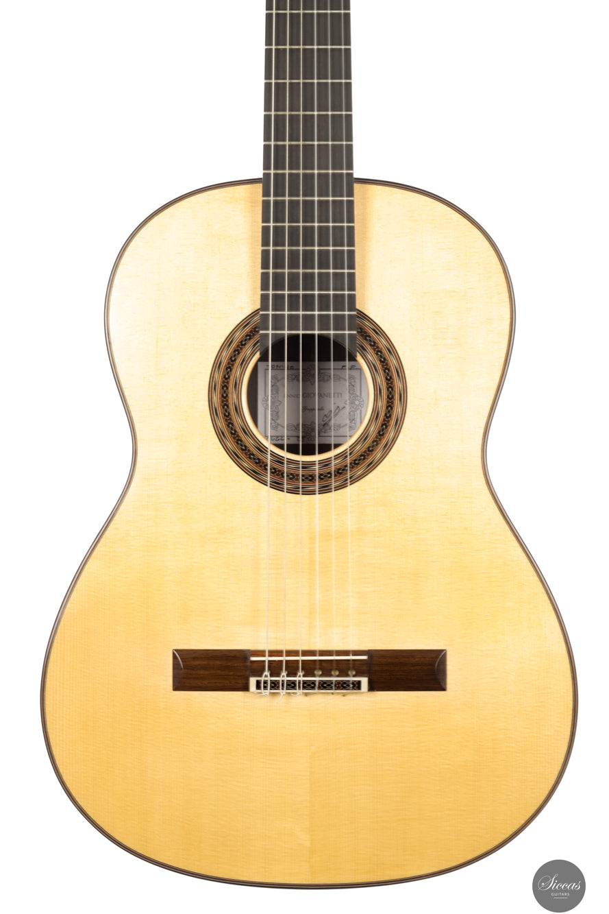 Ennio Giovanetti has been building classical guitars since 1998 in his workshop in Sariano di Gropparello near Piacenza in Italy. He studied in Milan with Enrico Bottelli where he gained the rare opportunity to examine instruments by Antonio de Torres, Francisco Simplicio and Enrique Garcia. These encounters shaped his understanding of traditional construction and informed the elegant and distinctive style that defines his work today. His guitars follow classical principles yet include personal structural and aesthetic elements that make his instruments immediately recognisable. Giovanetti’s commitment to craftsmanship and to the careful selection of materials has earned his instruments a strong reputation among performers and collectors.