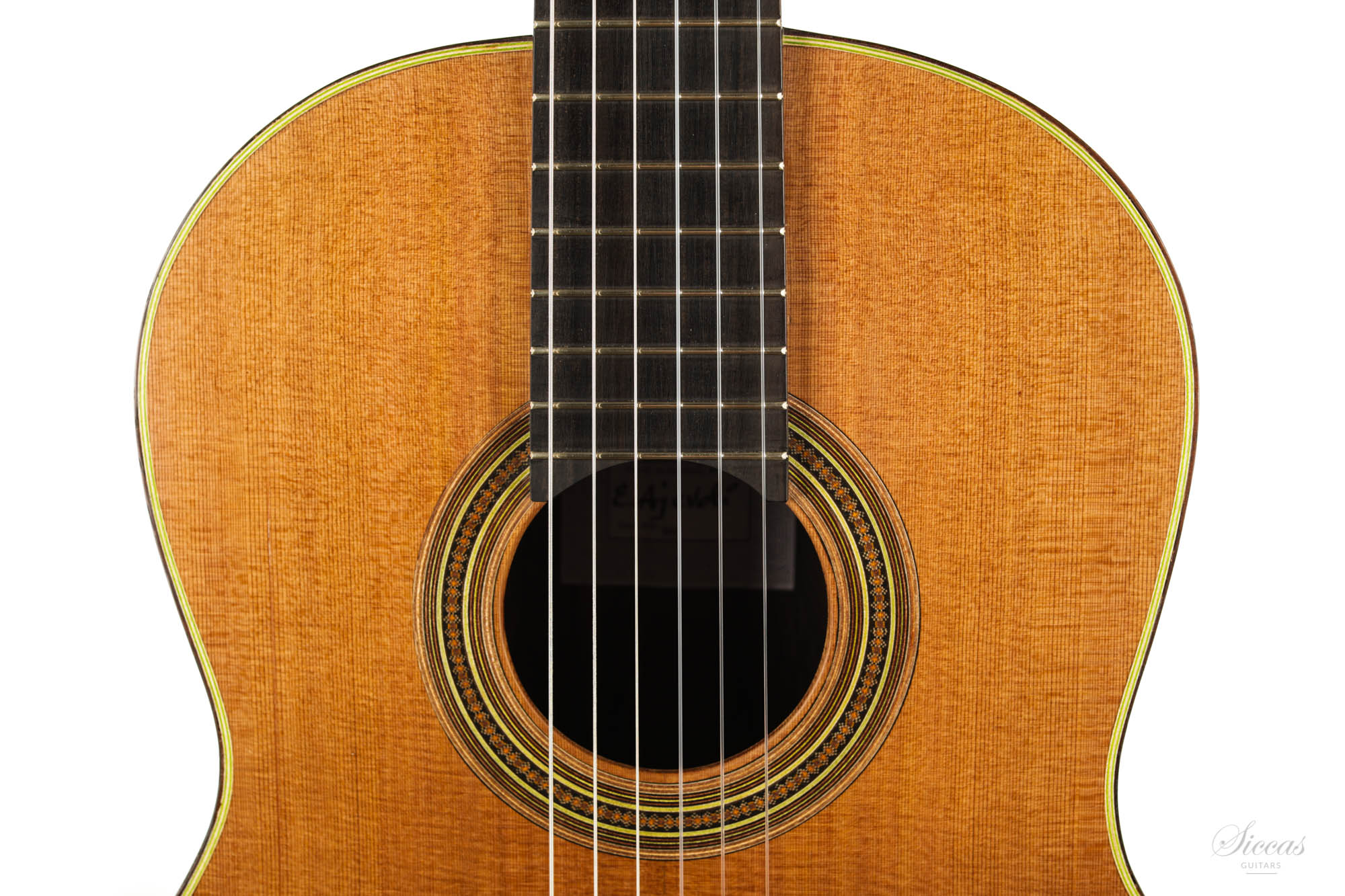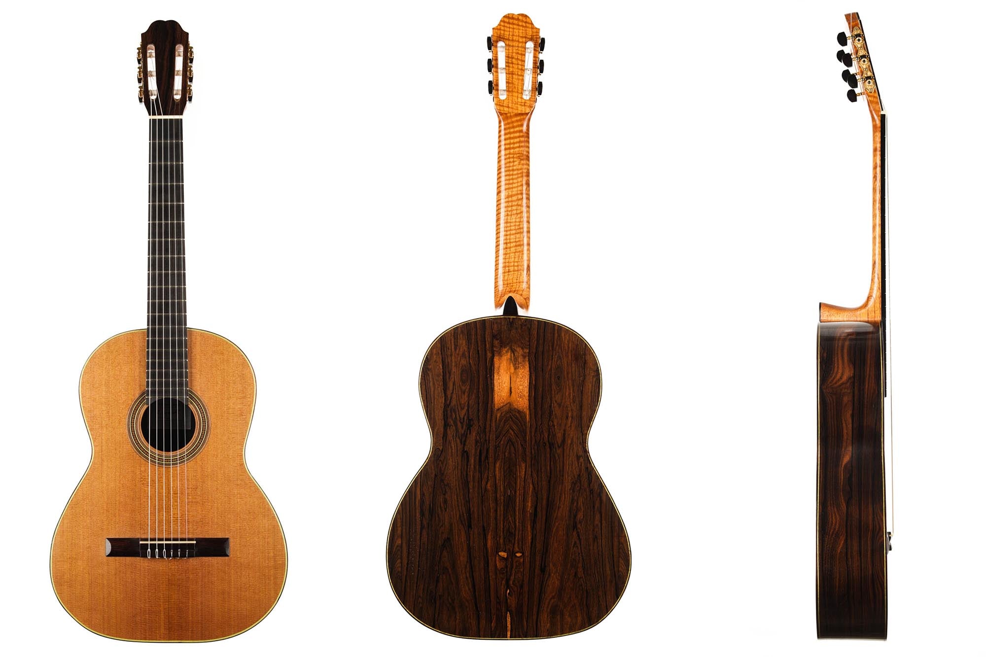 Diese wunderbare, 2020 gebaute Gitarre mit der Nummer 133 hat einen herrlich dunklen und üppigen Klang. Für dieses Instrument wurden Zedernholz für die Decke und Ziricote für Boden und Zargen verwendet. Die Zeder macht die Gitarre im Vergleich zu unseren früheren Ajevoli-Gitarren etwas dunkler im Timbre. Der erste und unmittelbare Eindruck ist eine süsslich klingende Gitarre mit beeindruckender Ansprache. Das Timbre ist klar und singend, sowohl grazil als auch lyrisch. Infolgedessen ist es ein Instrument, das für viele Stile und Repertoires geeignet ist. Darüber hinaus hat sie ein langes, liebliches und vollmundiges Sustain, das den Gitarristen zu einem sehr musikalischen Spiel inspiriert. Insgesamt ein wirklich wunderbares Instrument, gebaut im Stil von Robert Bouchet.