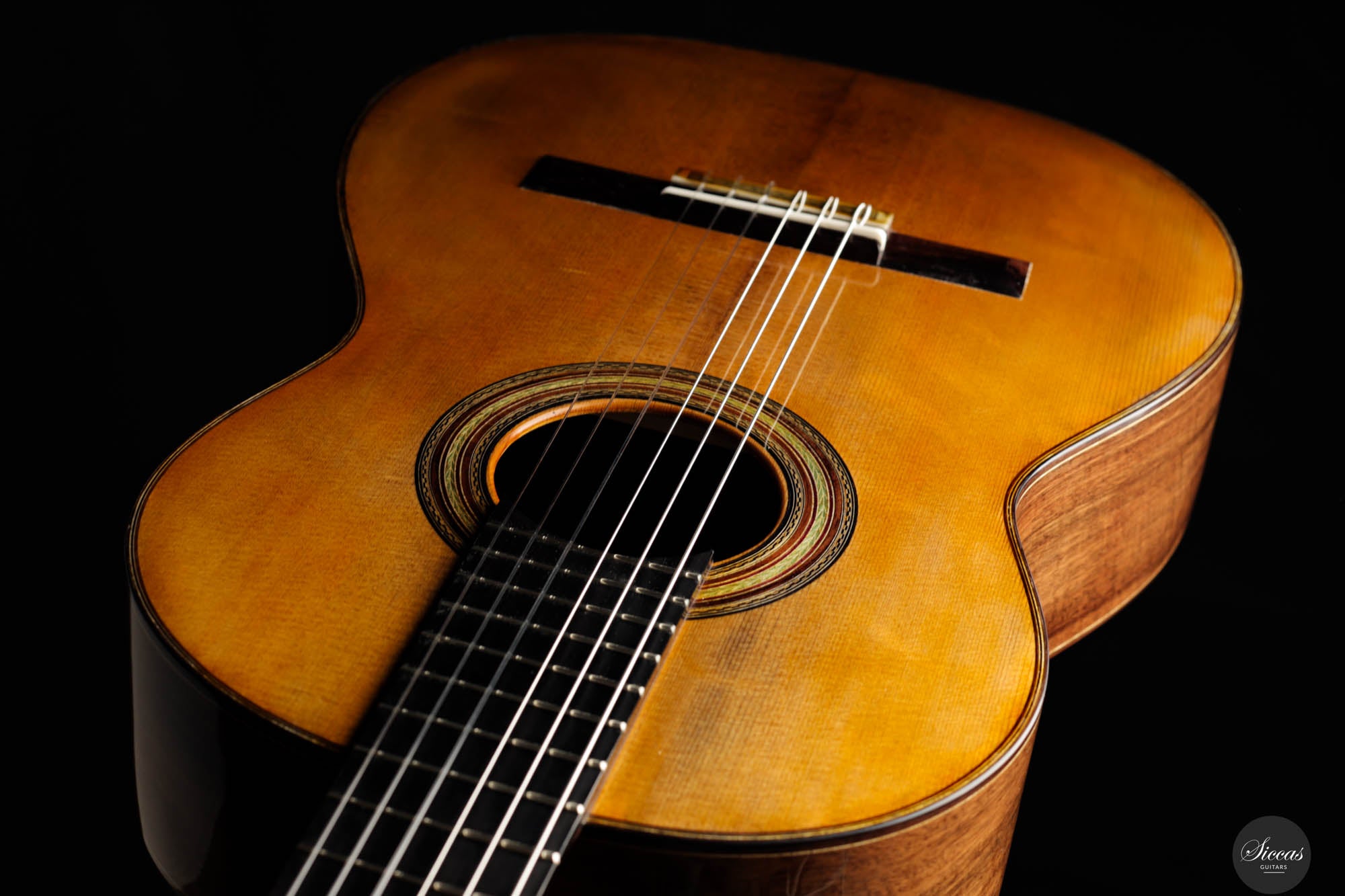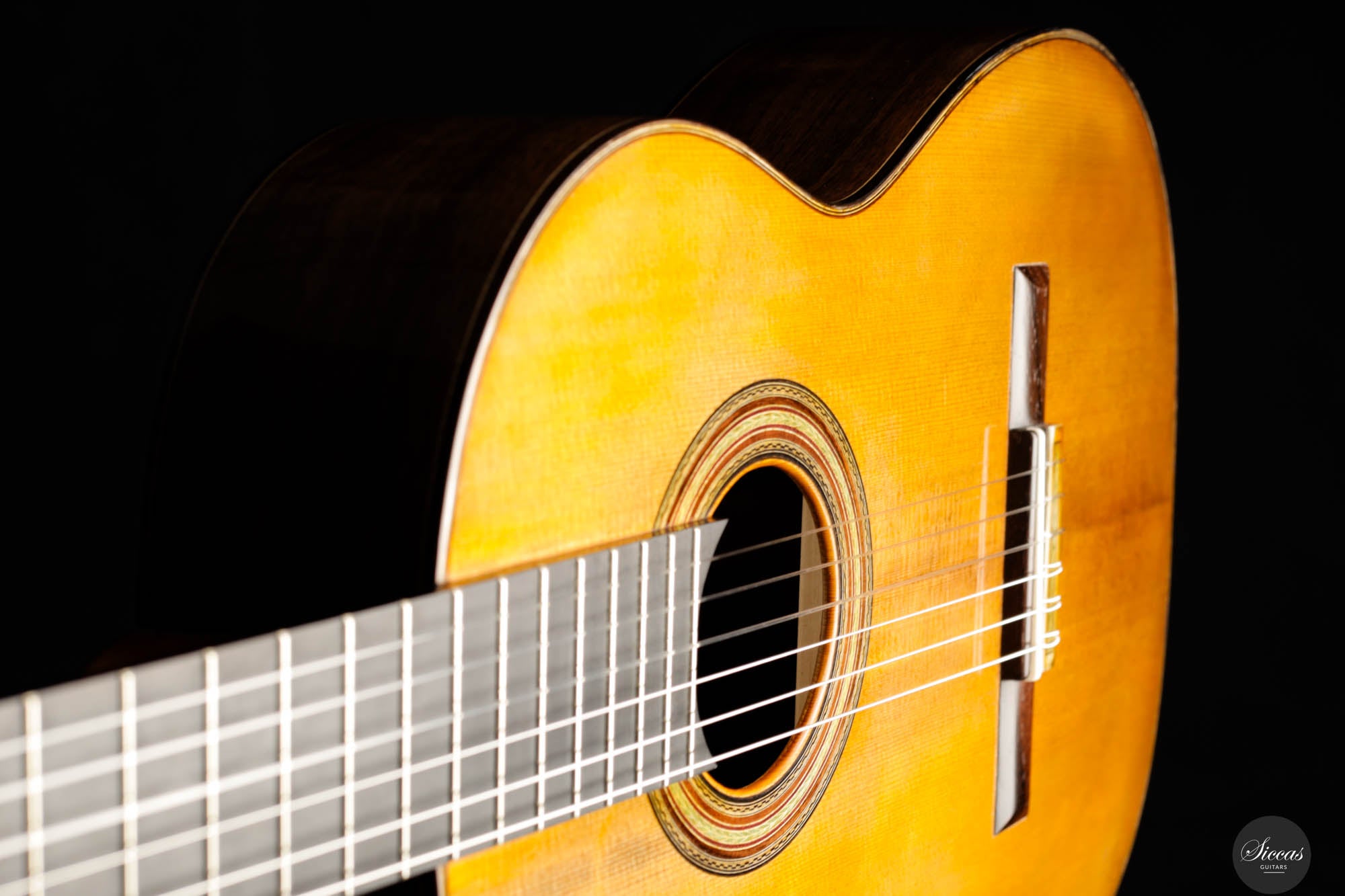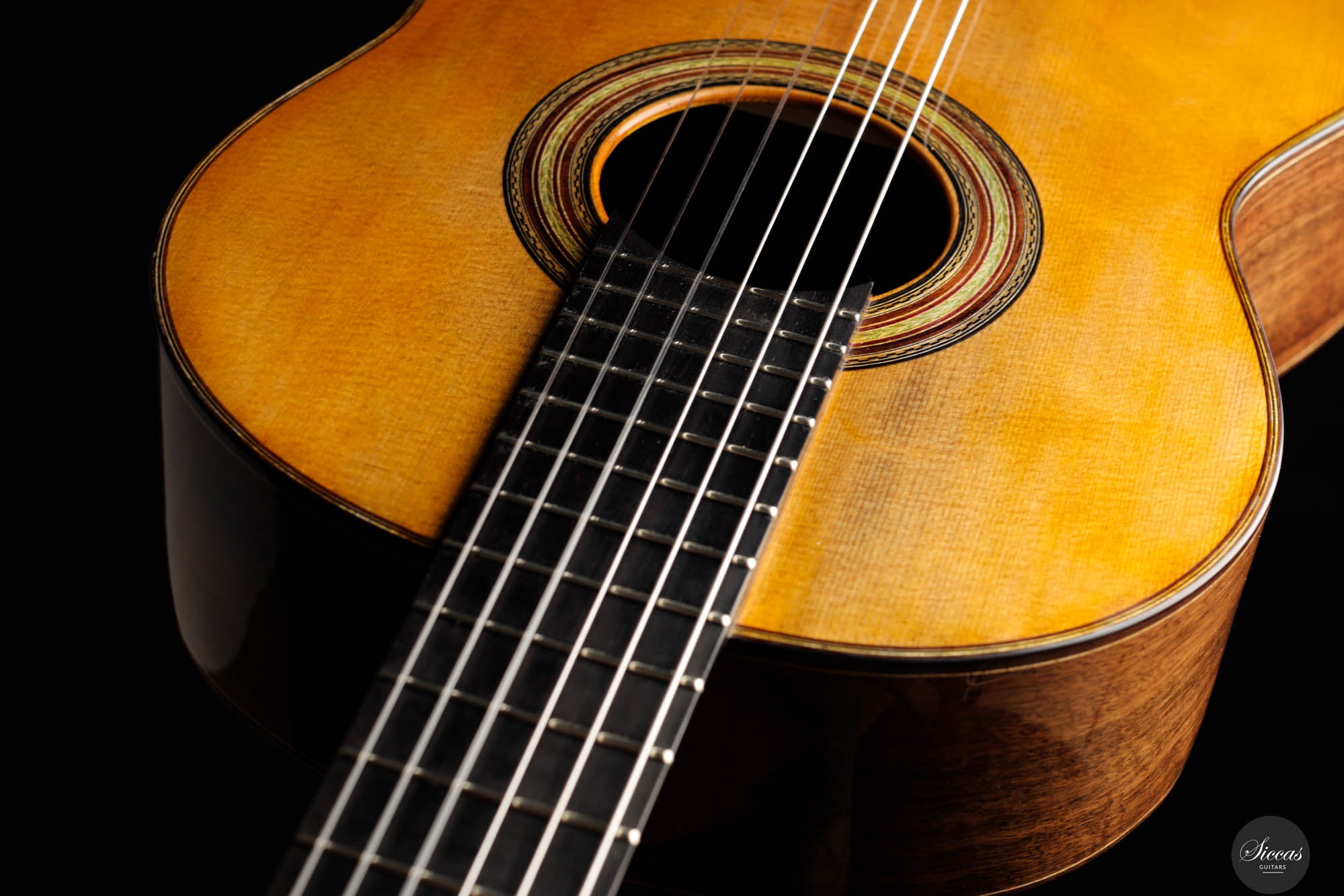 In terms of materials, the back and sides of the guitar are fashioned from Walnut (Juglans Nigra), chosen for its deep brown hue that echoes the classic look of Brazilian rosewood. This choice not only enhances the instrument's visual appeal but also contributes to its warm and resonant sound profile. The tuning machines, meticulously handcrafted by Alessi, feature fine decorative engravings on the plates and elegant ebony keys, seamlessly blending with the ebony used for the fingerboard. These components not only add to the guitar's aesthetic elegance but also ensure precise and reliable tuning. Overall, the Fabio Zontini Roma Expo Guitars 2024 Special Edition is a masterful blend of traditional inspiration and modern craftsmanship, offering both visual beauty and exceptional musical expressiveness.