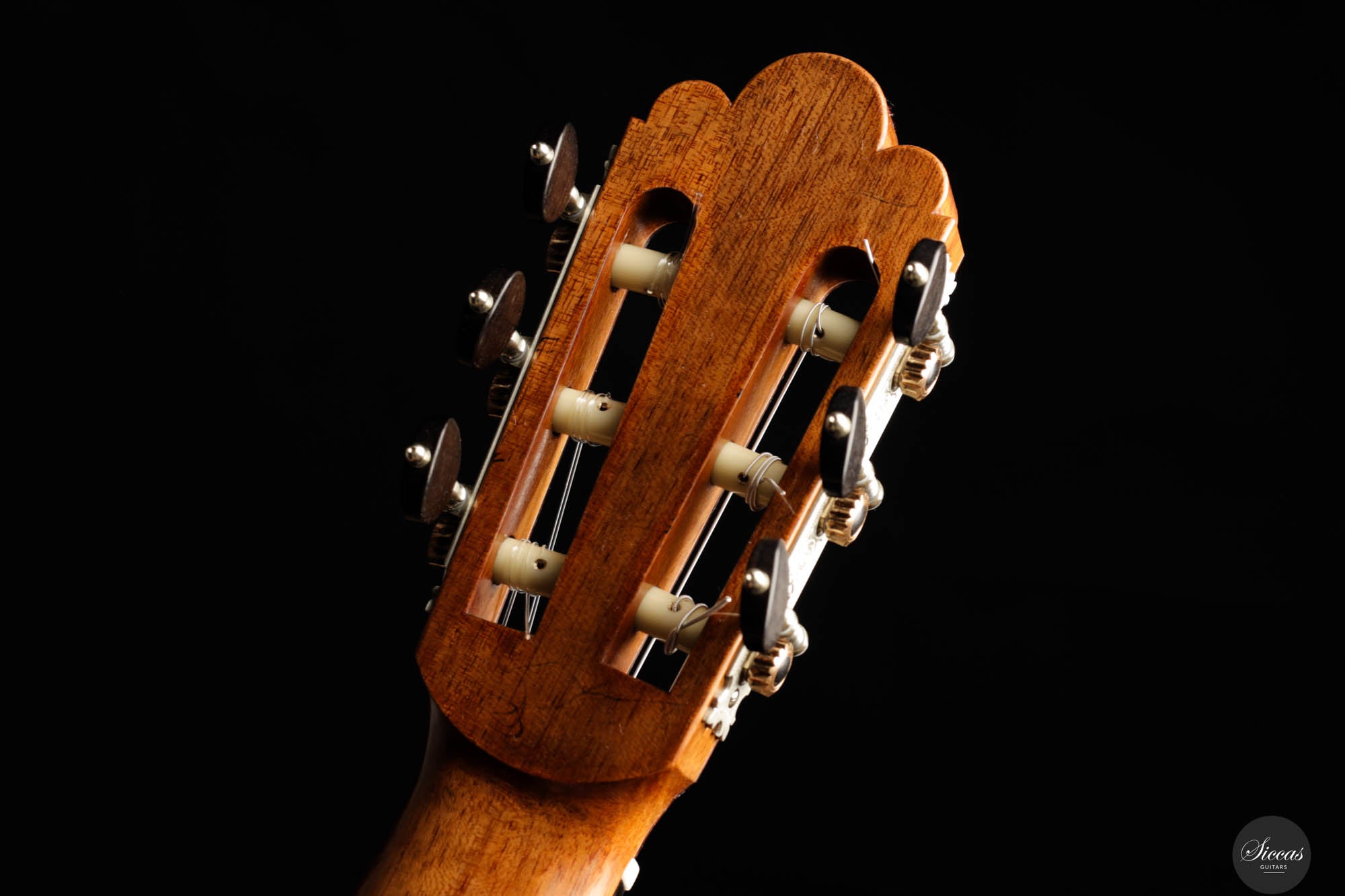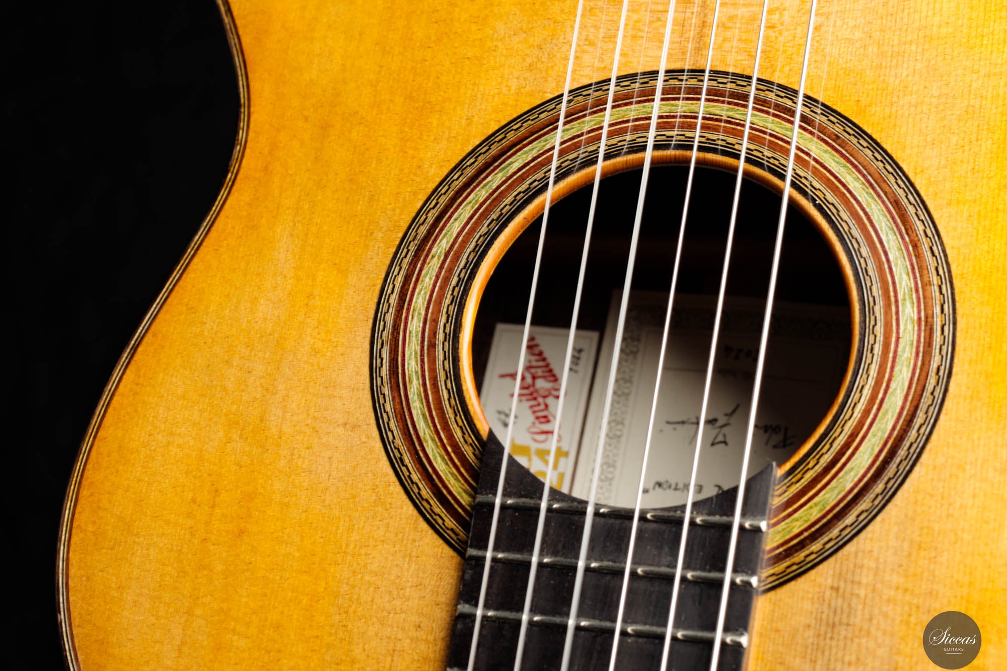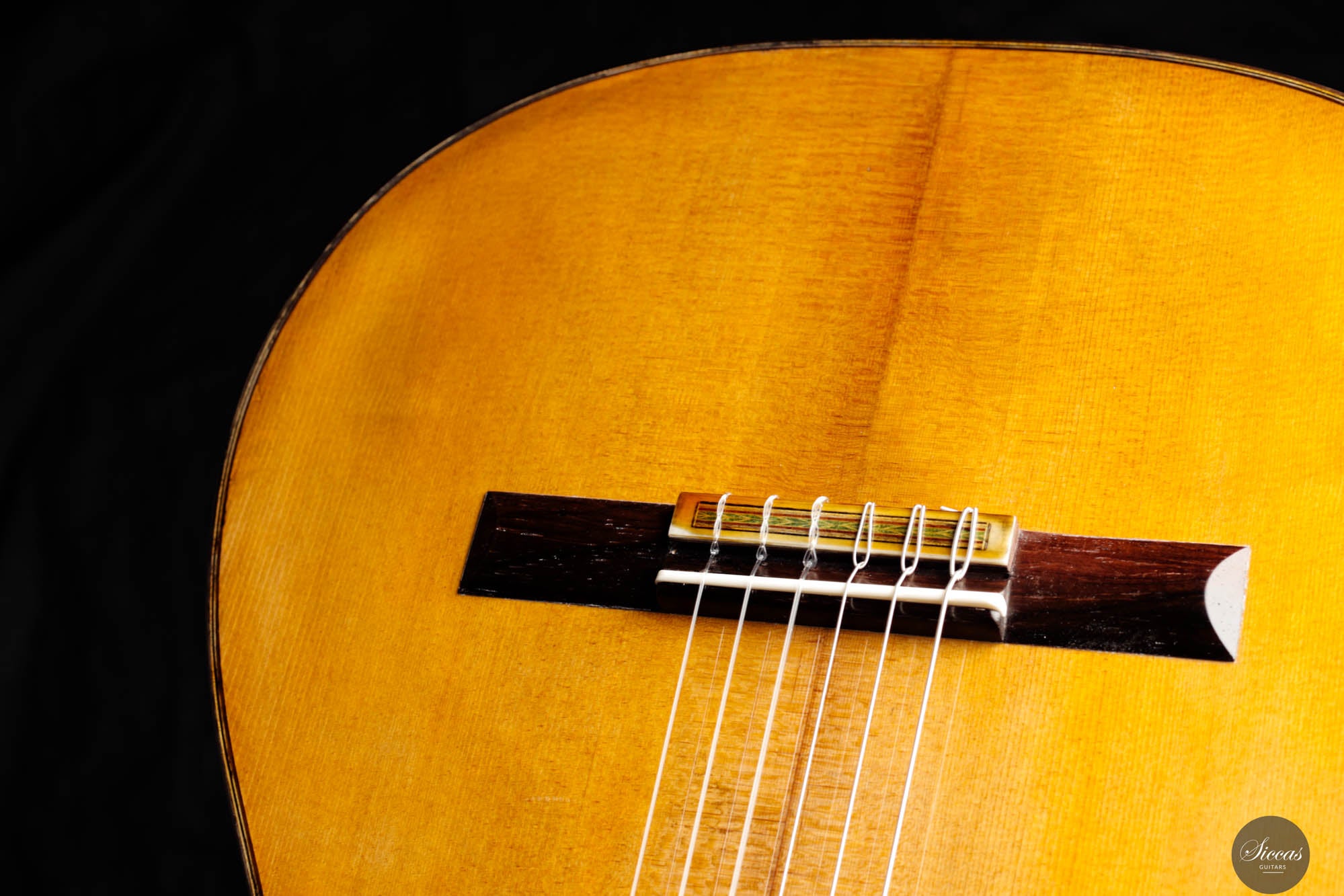In terms of materials, the back and sides of the guitar are fashioned from Walnut (Juglans Nigra), chosen for its deep brown hue that echoes the classic look of Brazilian rosewood. This choice not only enhances the instrument's visual appeal but also contributes to its warm and resonant sound profile. The tuning machines, meticulously handcrafted by Alessi, feature fine decorative engravings on the plates and elegant ebony keys, seamlessly blending with the ebony used for the fingerboard. These components not only add to the guitar's aesthetic elegance but also ensure precise and reliable tuning. Overall, the Fabio Zontini Roma Expo Guitars 2024 Special Edition is a masterful blend of traditional inspiration and modern craftsmanship, offering both visual beauty and exceptional musical expressiveness.