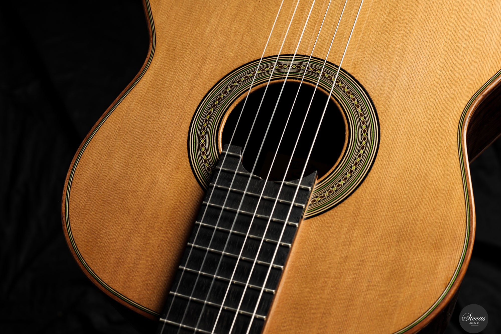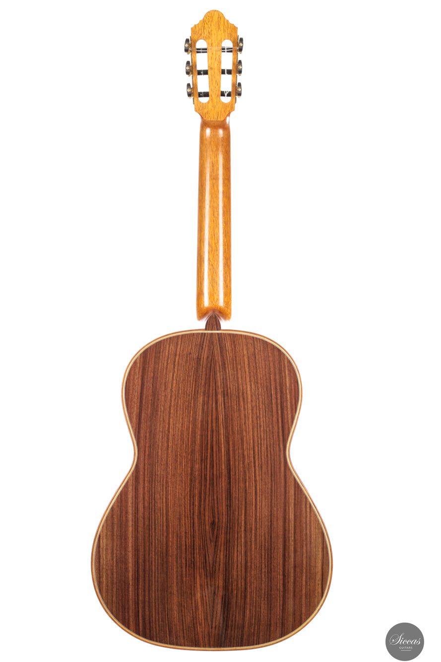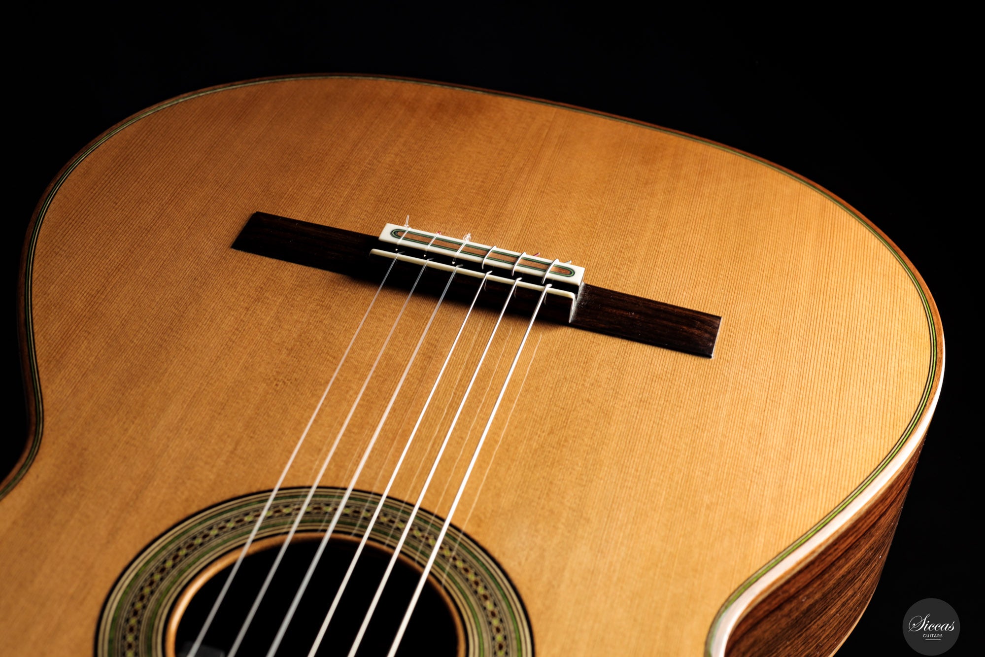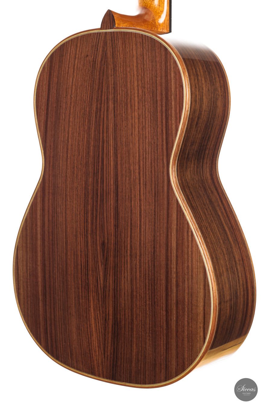 In sound the guitar displays a warm and dark colour with a long and even sustain. The instrument offers a soft and deeply resonant character full of overtones and distinguished by a three dimensional quality. The articulation is fast and controlled and the sympathetic resonances give the tone a natural orchestral breadth. The balance across registers is exemplary. Each voice carries its own clarity without losing the overall cohesion of the musical line. The result is a concert guitar capable of filling a room with ease while maintaining a refined and expressive tone.