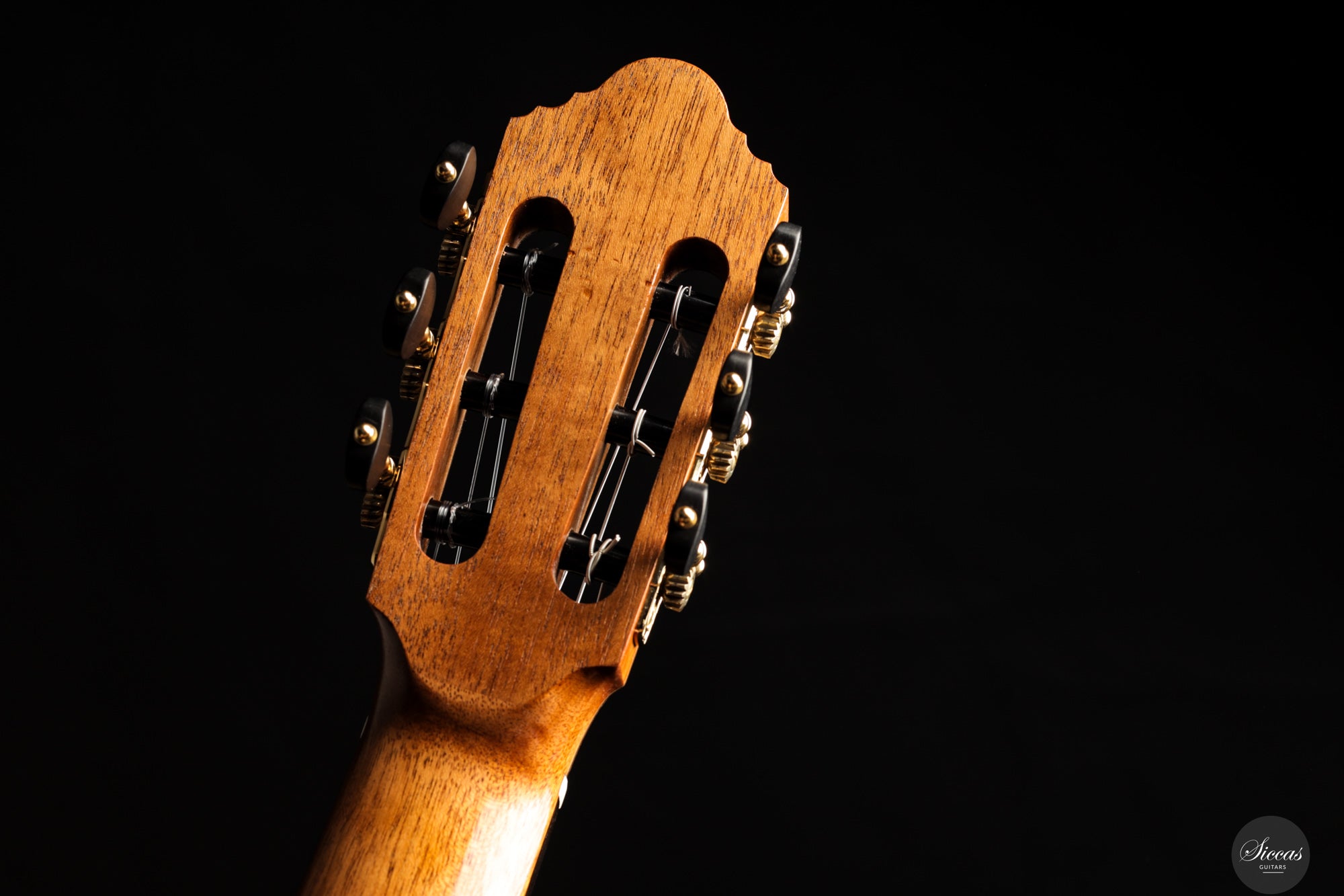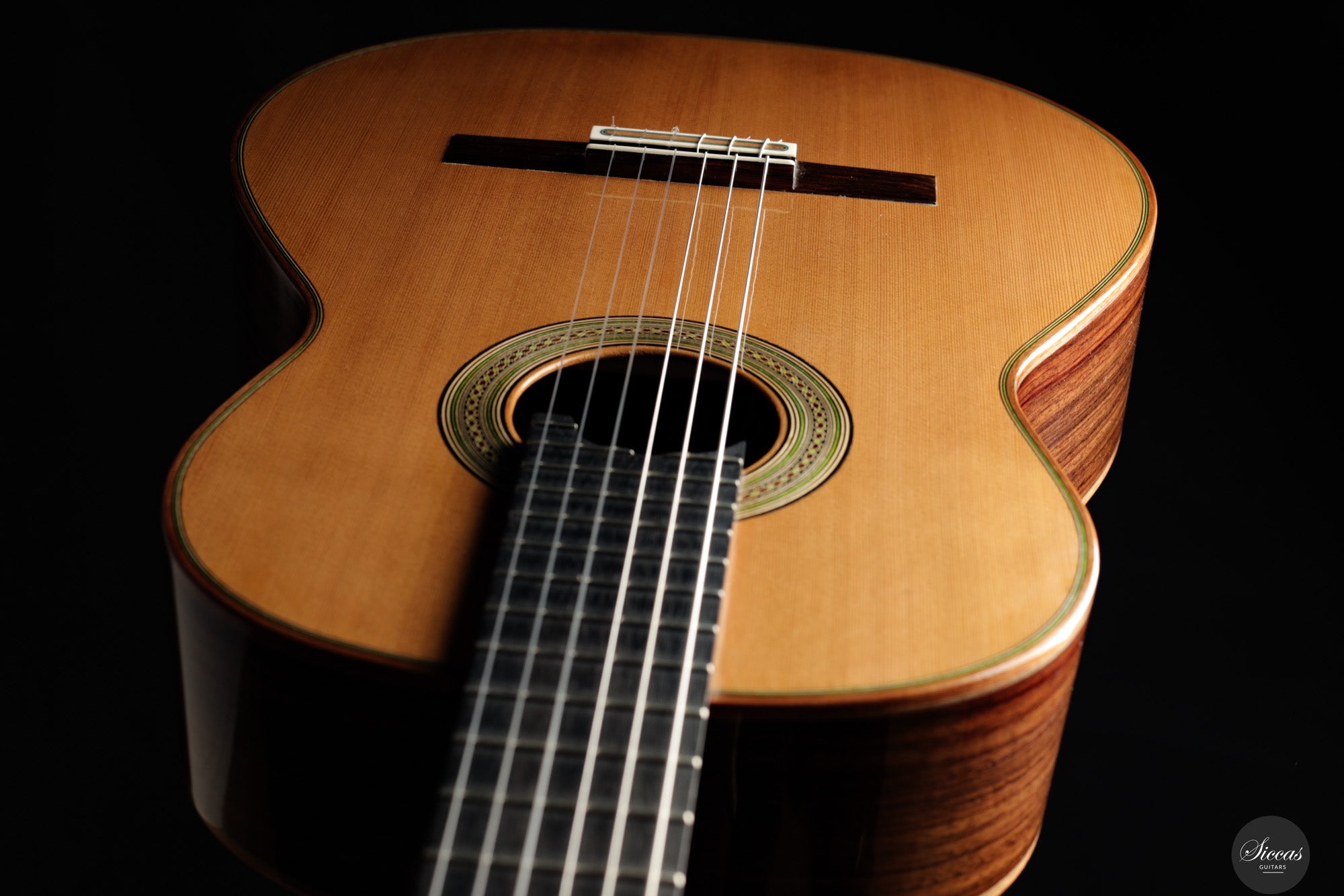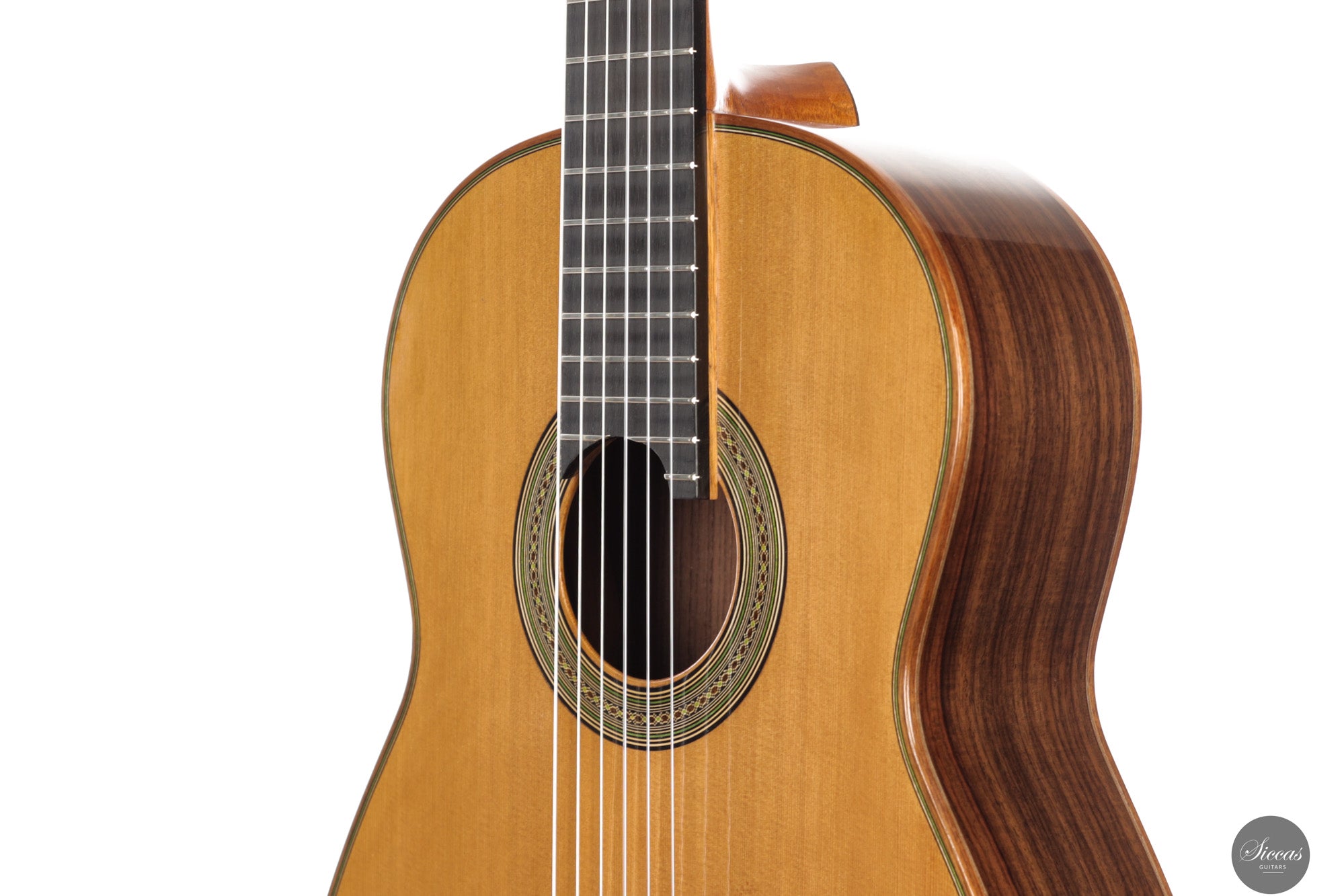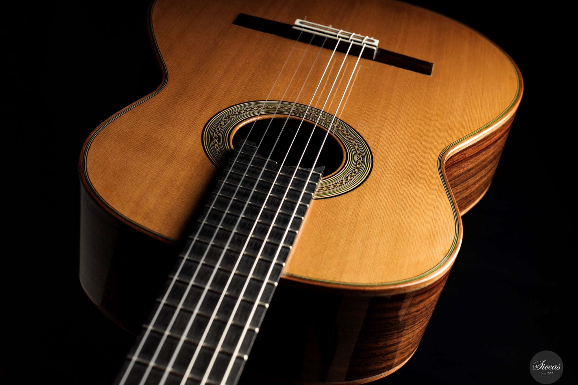 In sound the guitar displays a warm and dark colour with a long and even sustain. The instrument offers a soft and deeply resonant character full of overtones and distinguished by a three dimensional quality. The articulation is fast and controlled and the sympathetic resonances give the tone a natural orchestral breadth. The balance across registers is exemplary. Each voice carries its own clarity without losing the overall cohesion of the musical line. The result is a concert guitar capable of filling a room with ease while maintaining a refined and expressive tone.