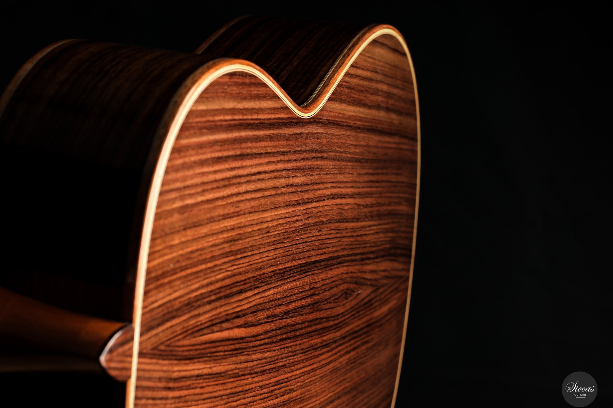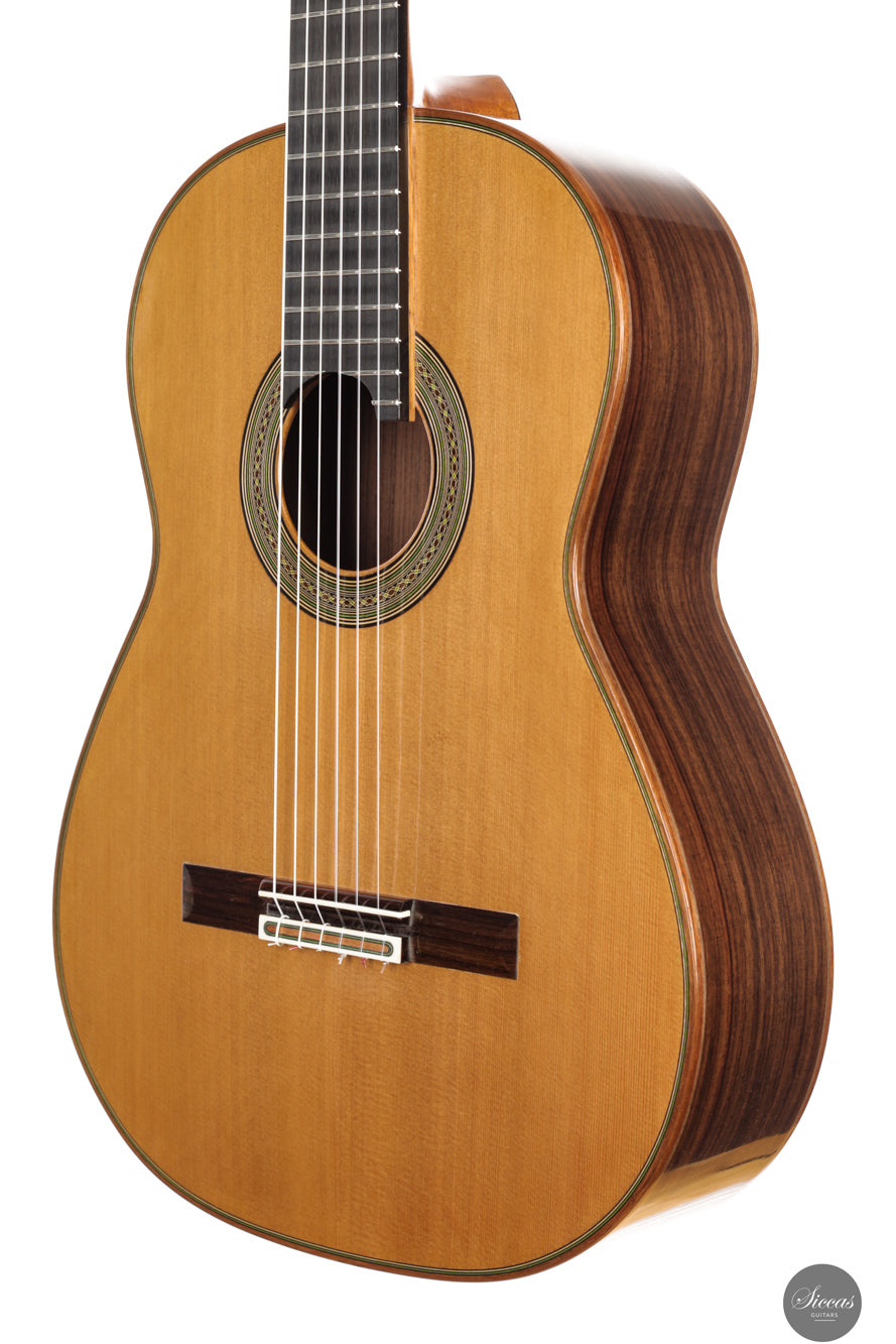This 2025 double top guitar shows the qualities that place Felix Müller among the leading modern makers. The cedar soundboard is paired with a carefully tuned internal structure that reacts with unusual tenderness under the fingers. The Indian rosewood body is finished with French polish which allows the instrument to remain light and responsive. The instrument feels designed for comfort and the ergonomic balance between both hands is immediately noticeable.