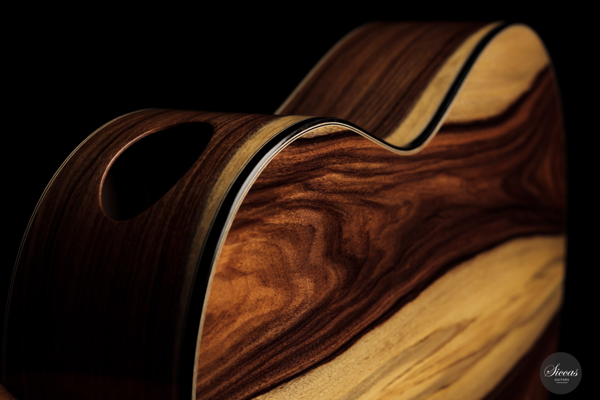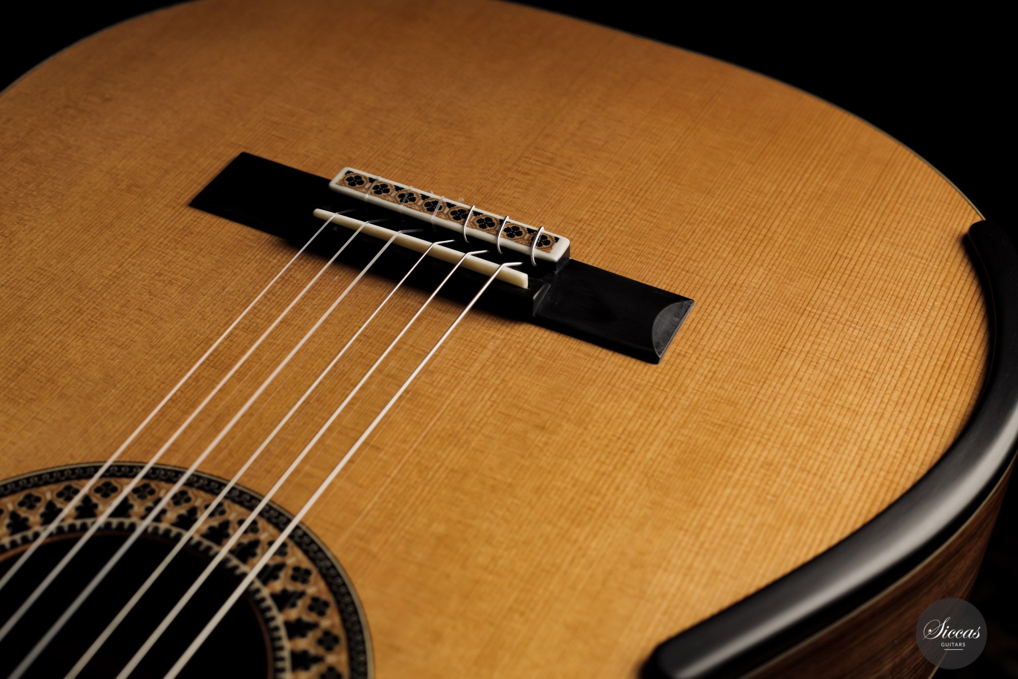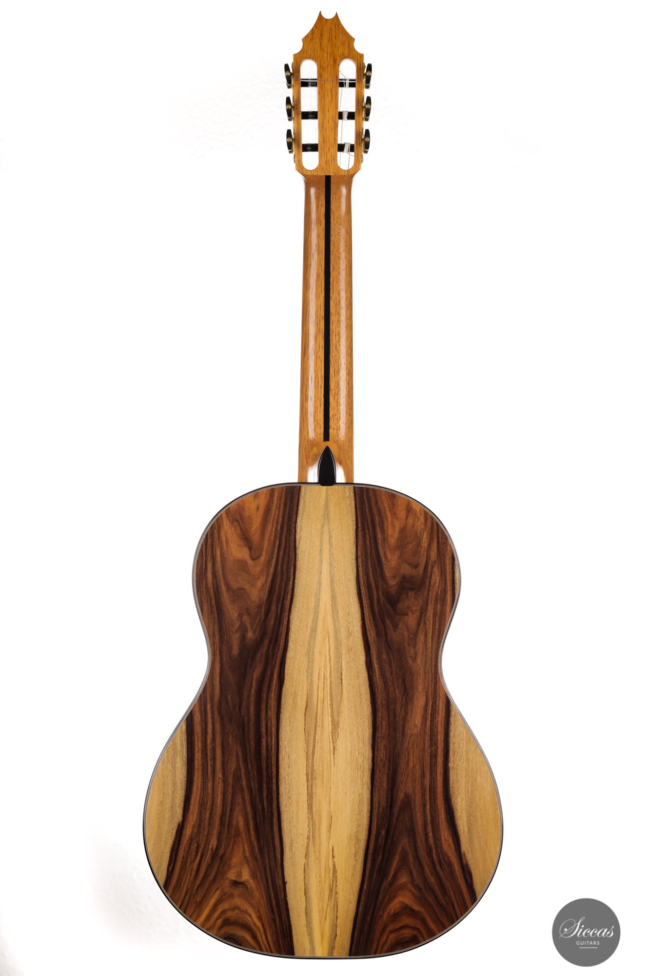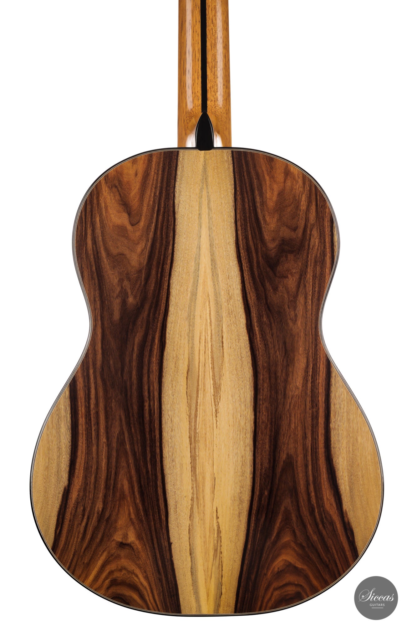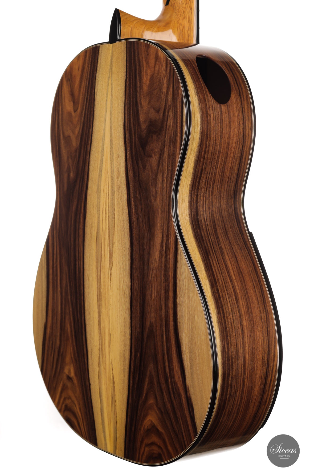 "This limited-edition guitar, contrasting to my standard lattice bracing model, has a body made of solid wood. My standard lattice guitars have multi-laminated sides and a double Nomex back. Building a guitar with this characteristic merges the traditional construction (back and side) with the modern construction (lattice top). This fusion of construction gives excellent qualities in terms of sound projection, guitar weight, and comfort."