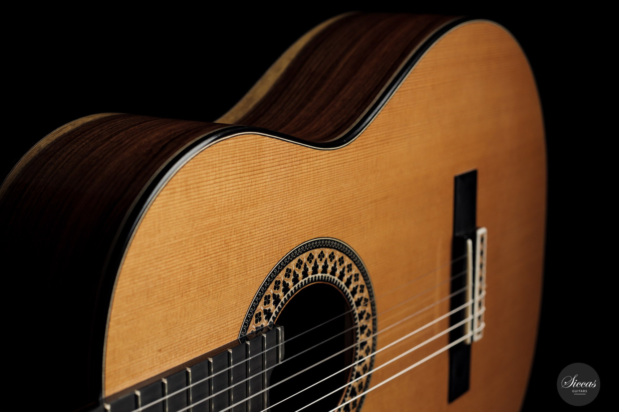 Fernando Mazza is a successful guitar maker born in Argentina. After a career as a guitarist, he dedicated himself to classical guitar making and opened his workshop in Arezzo, Italy. Fernando Mazza's guitars are easily recognized by their meticulous construction and beautiful rosette, reminiscent of the arches of the famous Palazzo Ducale in Venice. He builds guitars in the Australian lattice tradition, combining extremely stiff laminated backs and sides with a highly responsive lattice top. In addition, Fernando Mazza also builds a Nomex double top model with lattice bracing that offers even more projection and spontaneity.