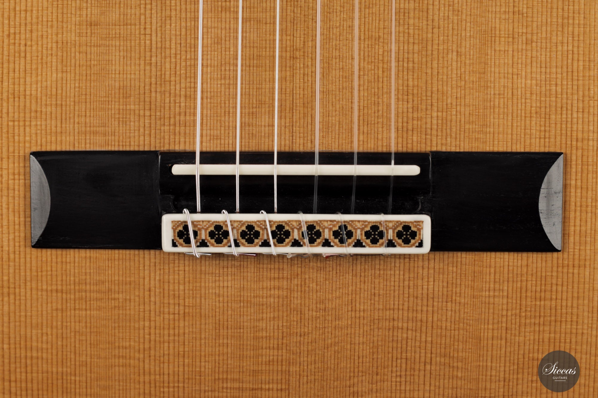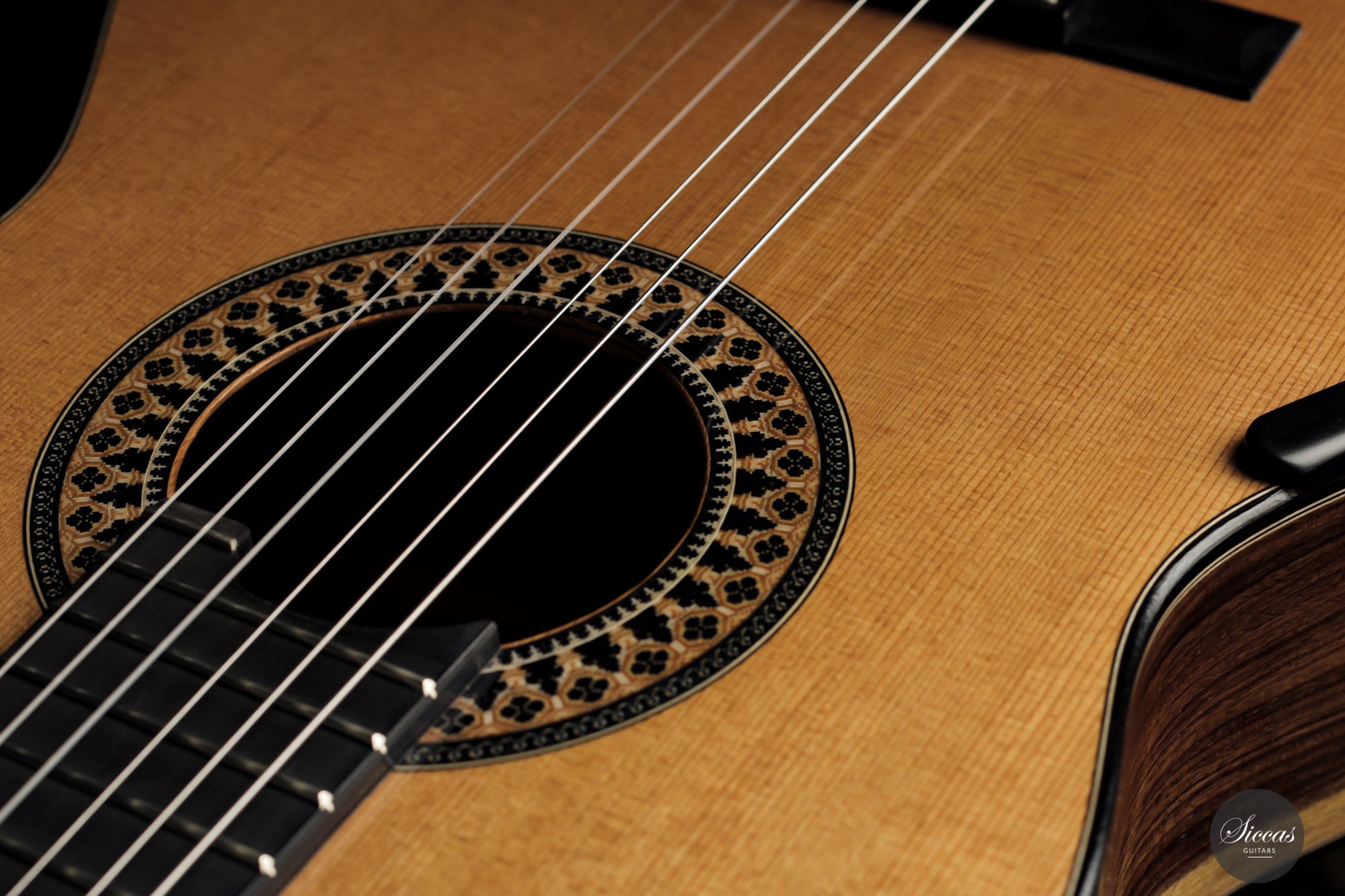 As always with Mazza's guitars, this instrument is a true powerhouse. Offering a remarkable dynamic range, it shows the best of the lattice construction. A detail we love about F. Mazza's guitars beyond their mind-boggling sound is the attention given to the aesthetic. The rosette, inspired by the Palazzo Ducale in Venezia, is just gorgeous and became a true trademark of Mazza's guitars. In our opinion, it is evident why exceptional players like Andrea Caballero and Valeria Galimova, among many other guitarists, play instruments made by Fernando Mazza.