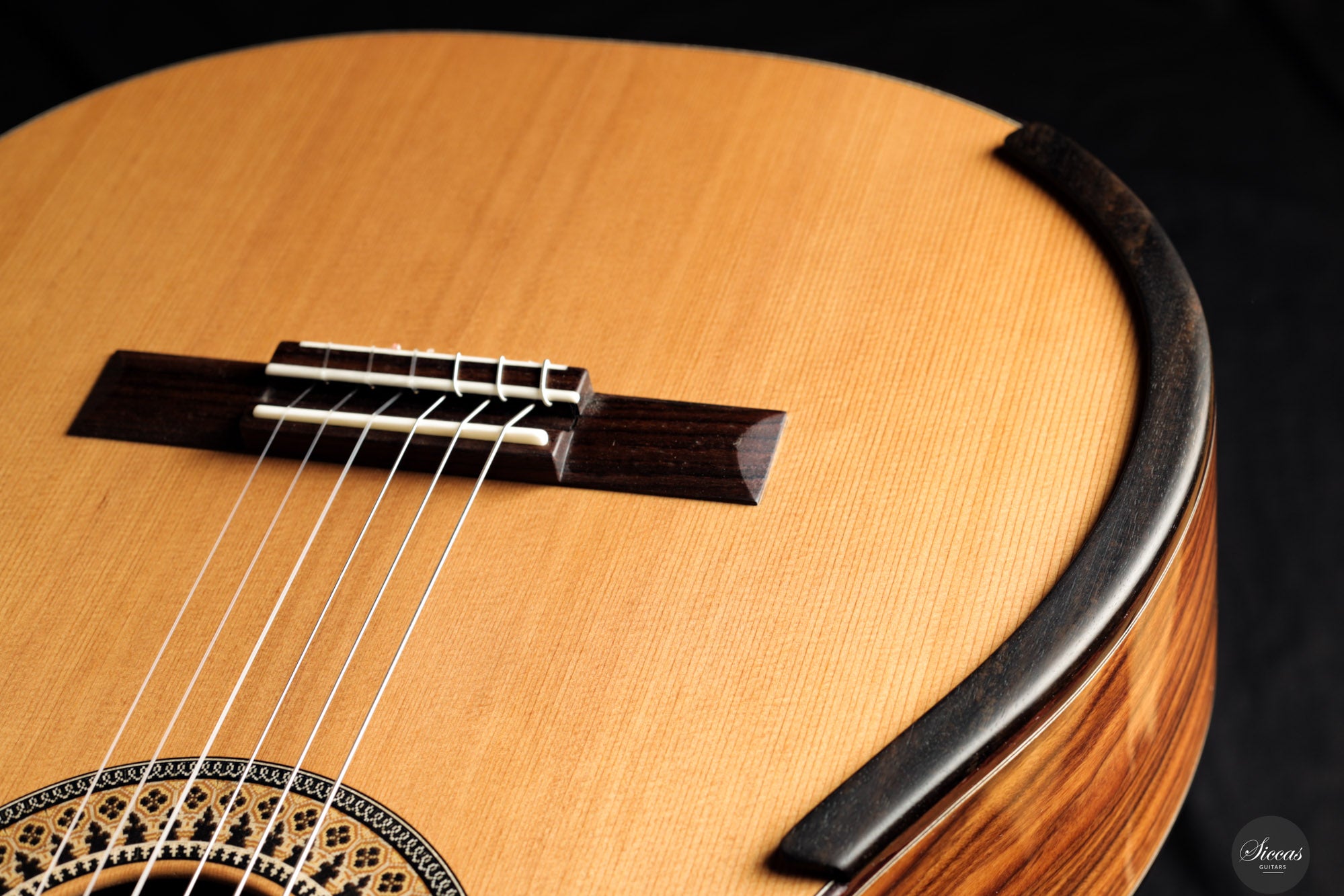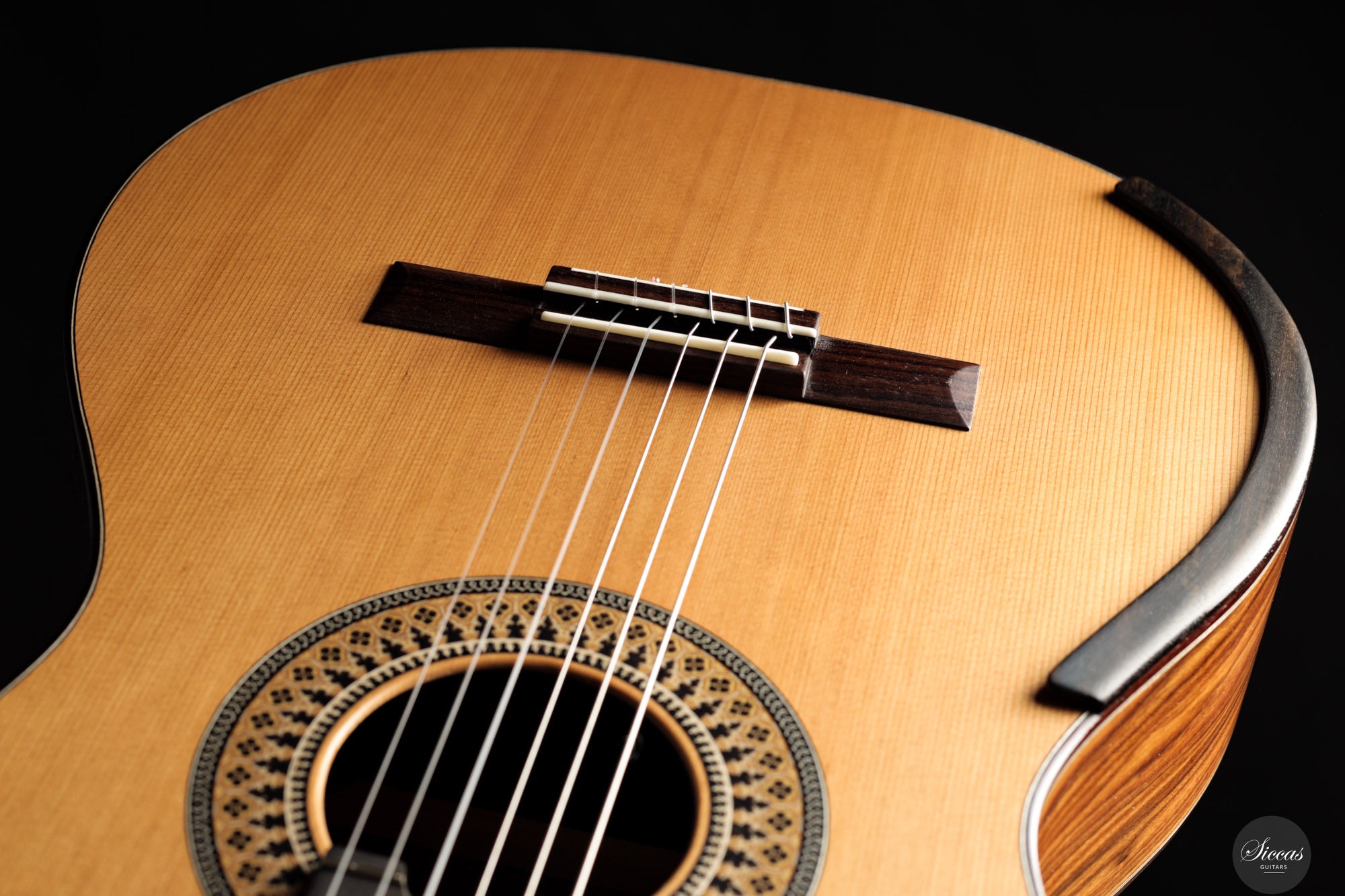 This 2025 concert guitar by Fernando Mazza exemplifies his refined approach to modern lutherie. Built with a 640 mm scale, it is ideal for players seeking enhanced playability without compromising tonal depth. The red cedar soundboard is braced with balsa wood reinforced with carbon fiber, a system developed through extensive experimentation. The bracing varies in thickness between 2.3 mm and 1 mm, optimizing strength and flexibility while preserving the warmth and harmonic richness characteristic of cedar.