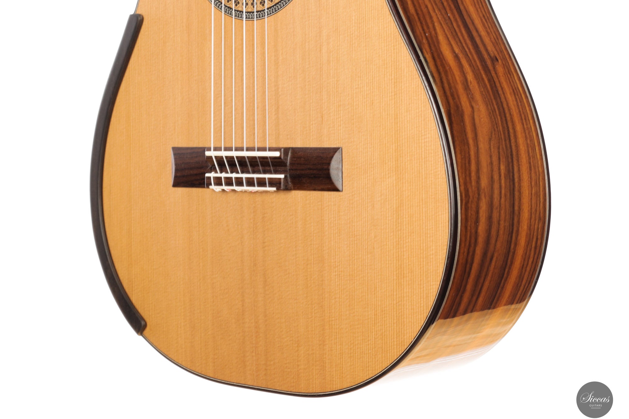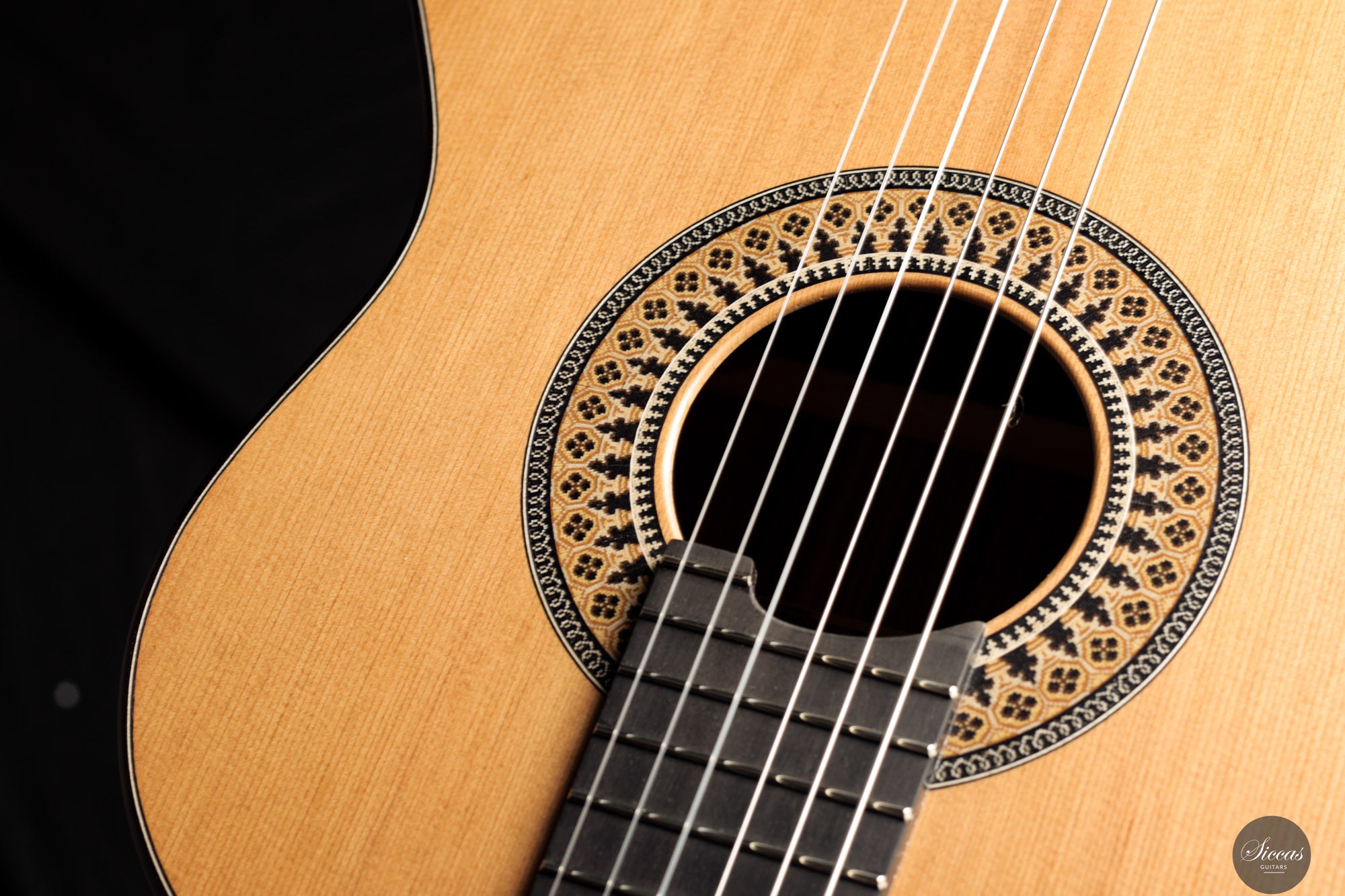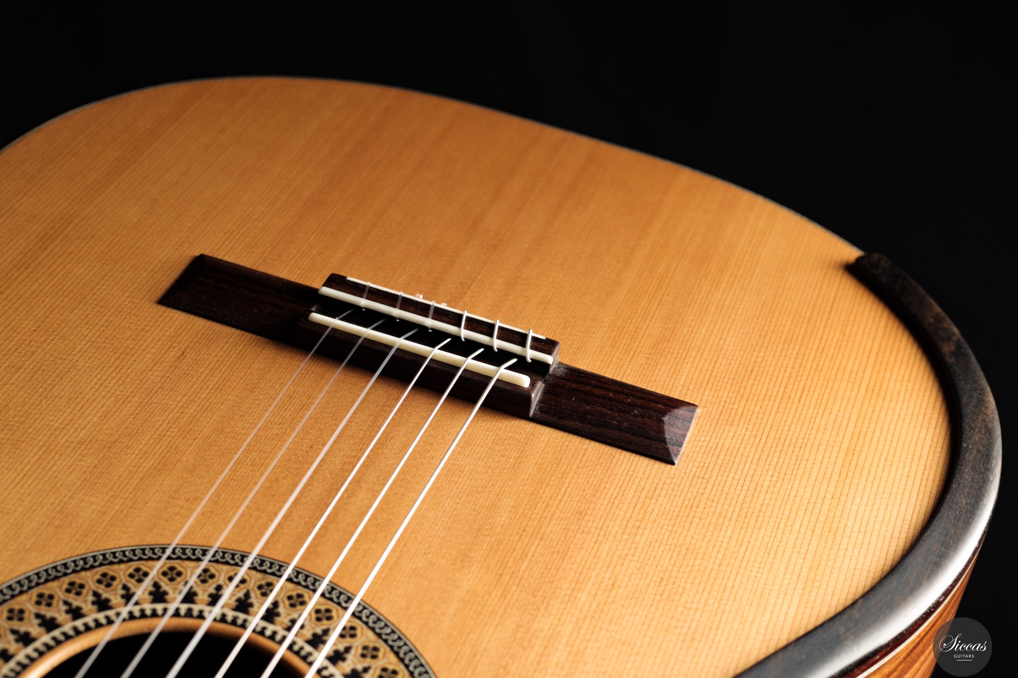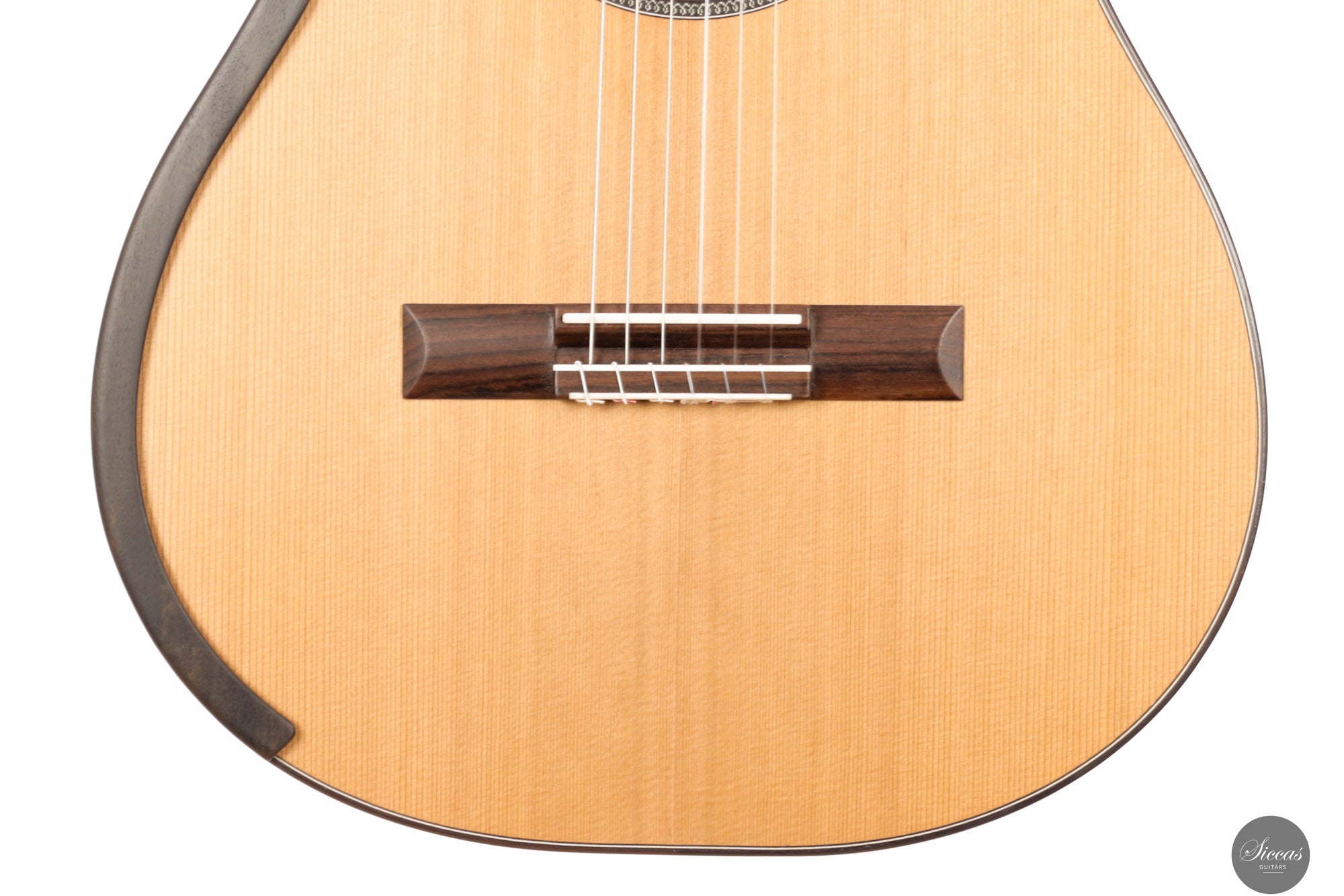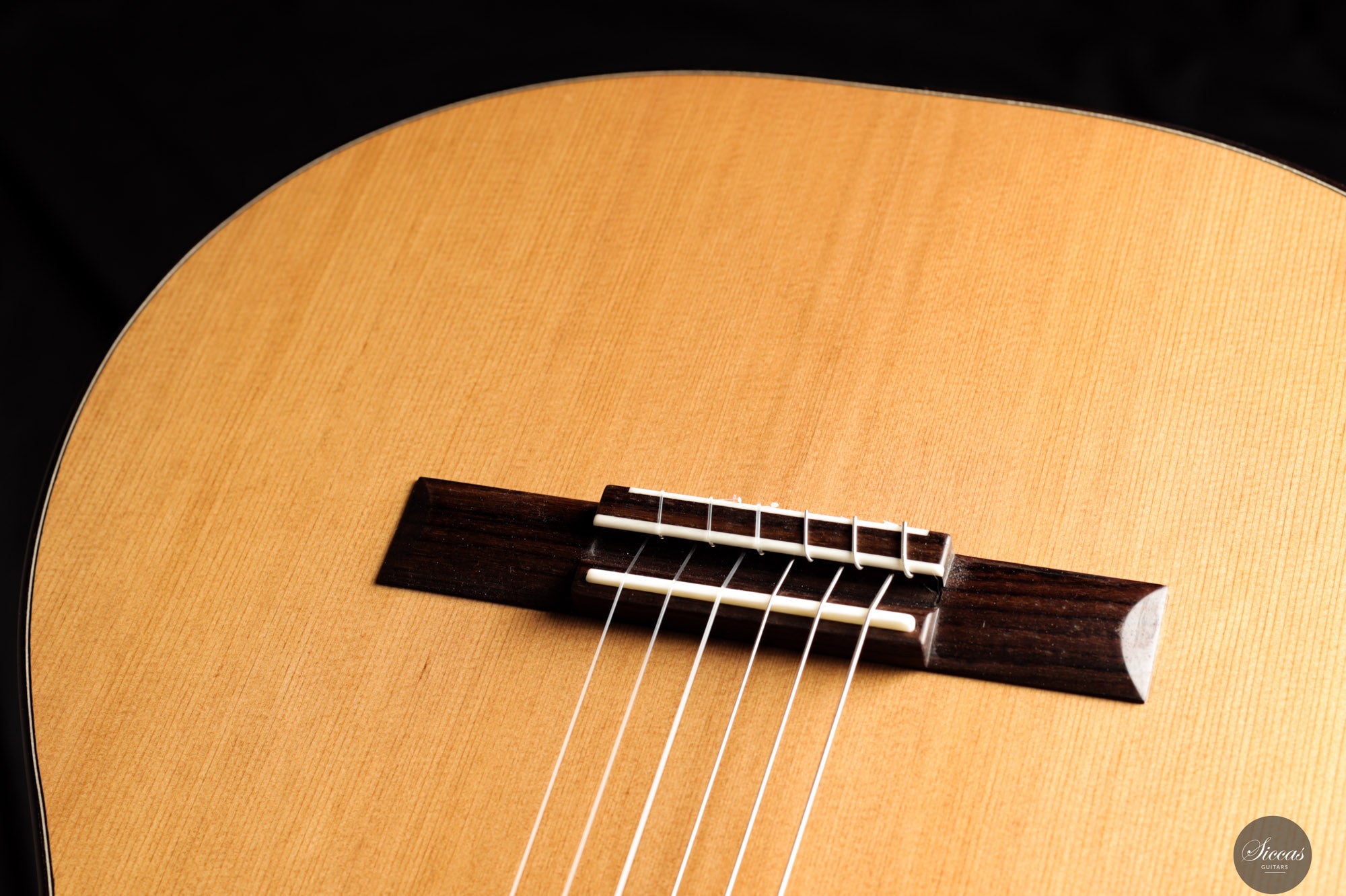 Tonally, the guitar is striking for its immediacy and bold dynamic range. Chords resonate with a breathing quality, and single notes emerge with clarity and power, even with minimal effort. Its voice is modern, rich in overtones, and highly responsive to touch, allowing expressive nuance even when nails are not perfectly shaped. This is a guitar that reveals its character from the first note, making a lasting impression. It is especially suited for players who appreciate the projection and openness of guitars in the tradition of Greg Smallman or Simon Marty, while offering its own distinct voice.