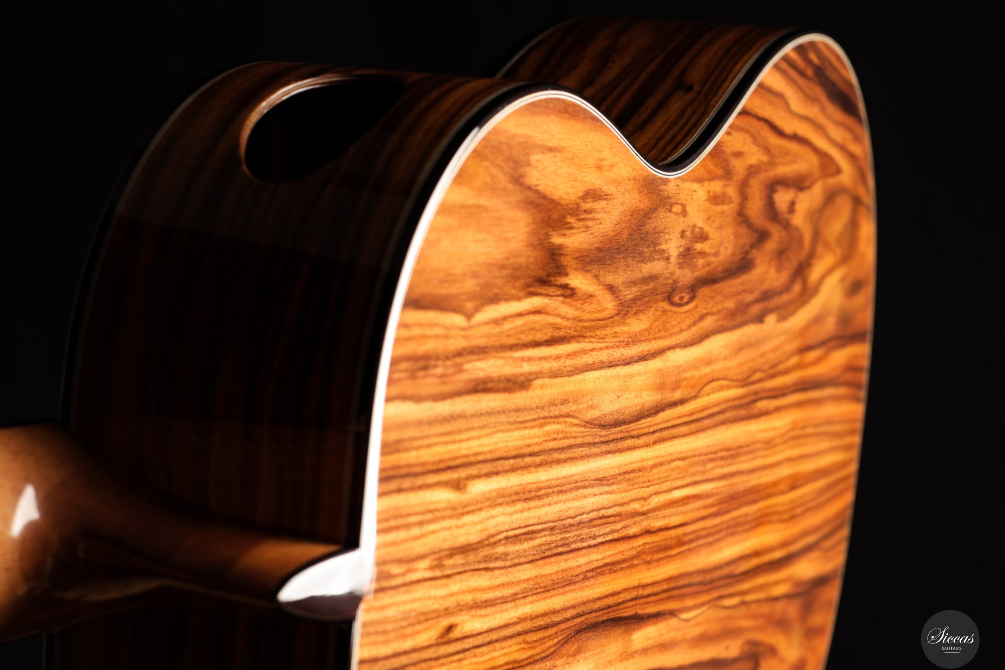 The back and sides are crafted from Santos rosewood, combined with maple on the sides and Nomex inside the back, creating a lightweight yet rigid structure that maximizes resonance and projection. This architectural layering contributes to the instrument’s notably responsive character and long sustain. It is also equipped with an armrest and a sound port, enhancing comfort and tonal feedback during performance.