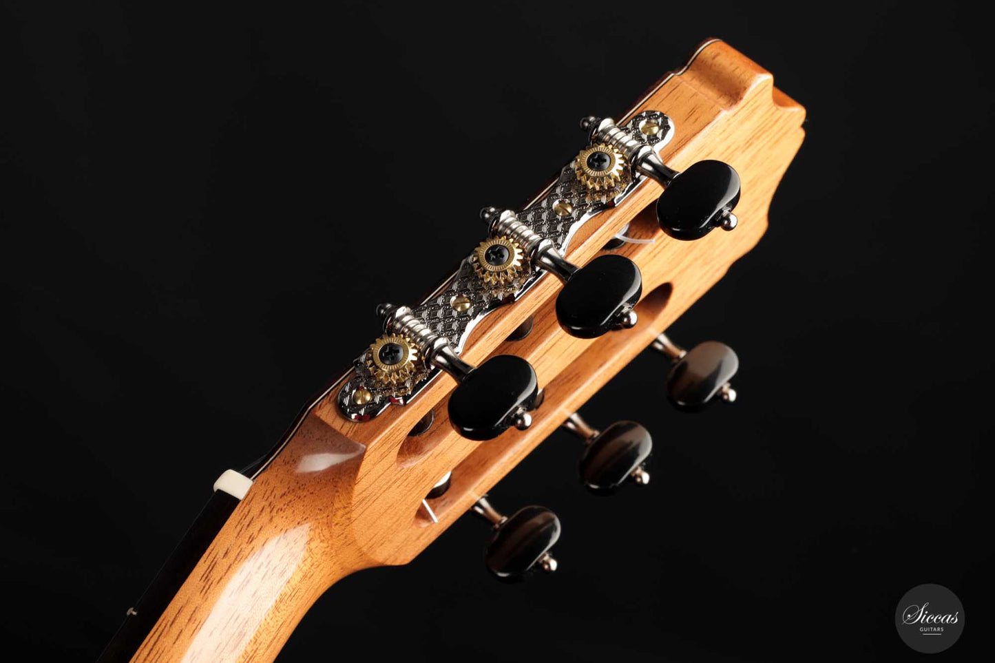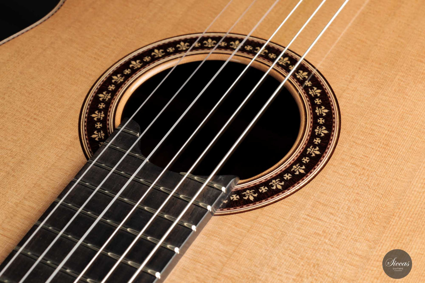 Already the appearance of this stunningly built guitar reveals why this model received an award at the guitar building competition. The instrument is tastefully decorated and the fine inlay work, which was carried out with utmost precision, gives the instrument a gorgeous and unique aesthetic. The sound of this Homenaje model impresses with its powerful and well-balanced sonority. The pleasantly crisp basses support the warm and singing trebles excellently and the playing feel is spot on. All in all, this is a traditionally built guitar of the highest level, which is very versatile and spreads a lot of playing enthusiasm.