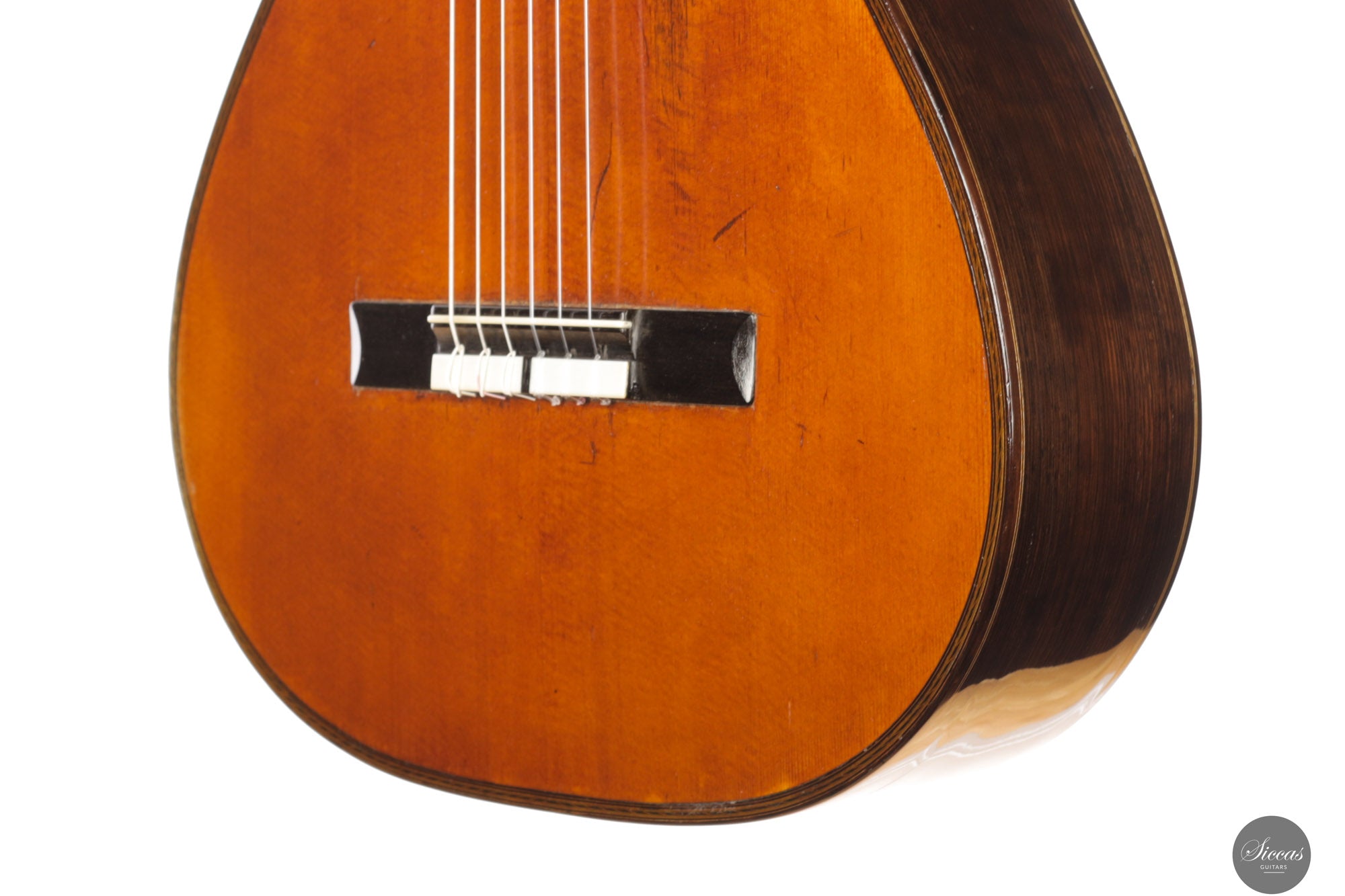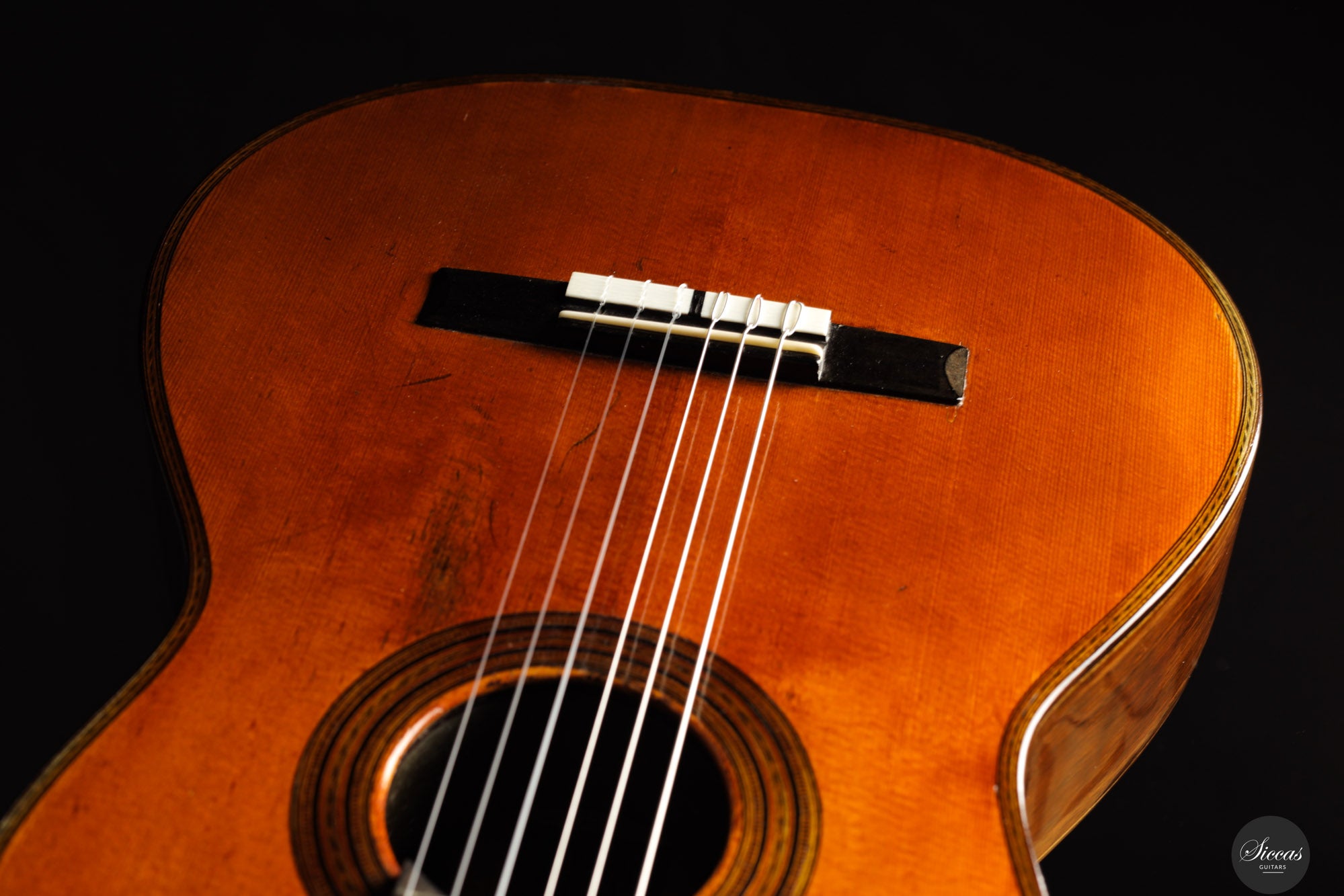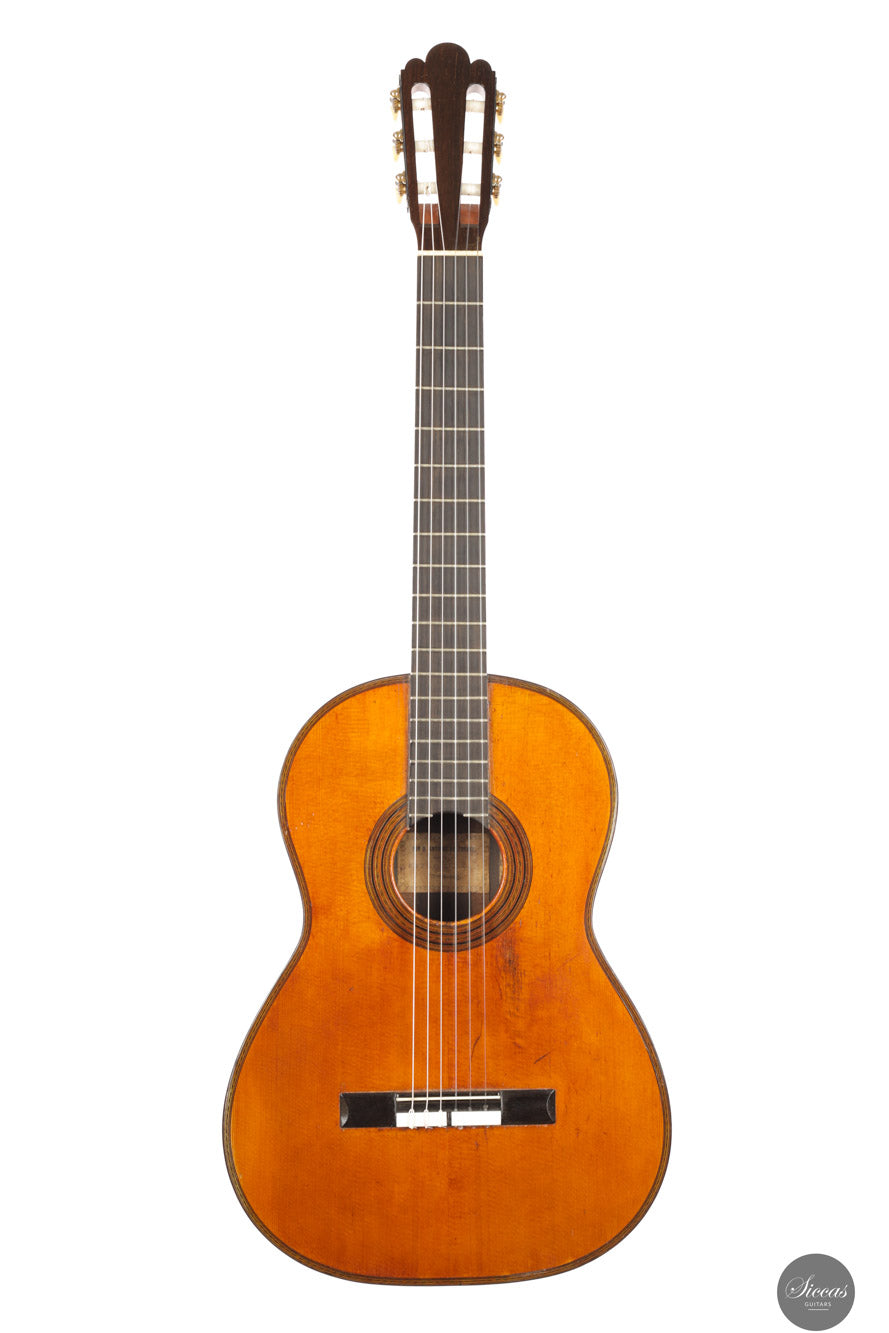 The guitar has been expertly restored and is in very good condition, especially for its age, with all structural elements solid and stable. The bridge and the neck-joint have been carefully reinforced, preserving the original headstock. The varnish was delicately retouched to harmonize with the original finish. The soundboard is in excellent condition, showing only two well-repaired cracks on each side of the fingerboard. The back and sides each display two repaired cracks, all of which were professionally and discreetly addressed.