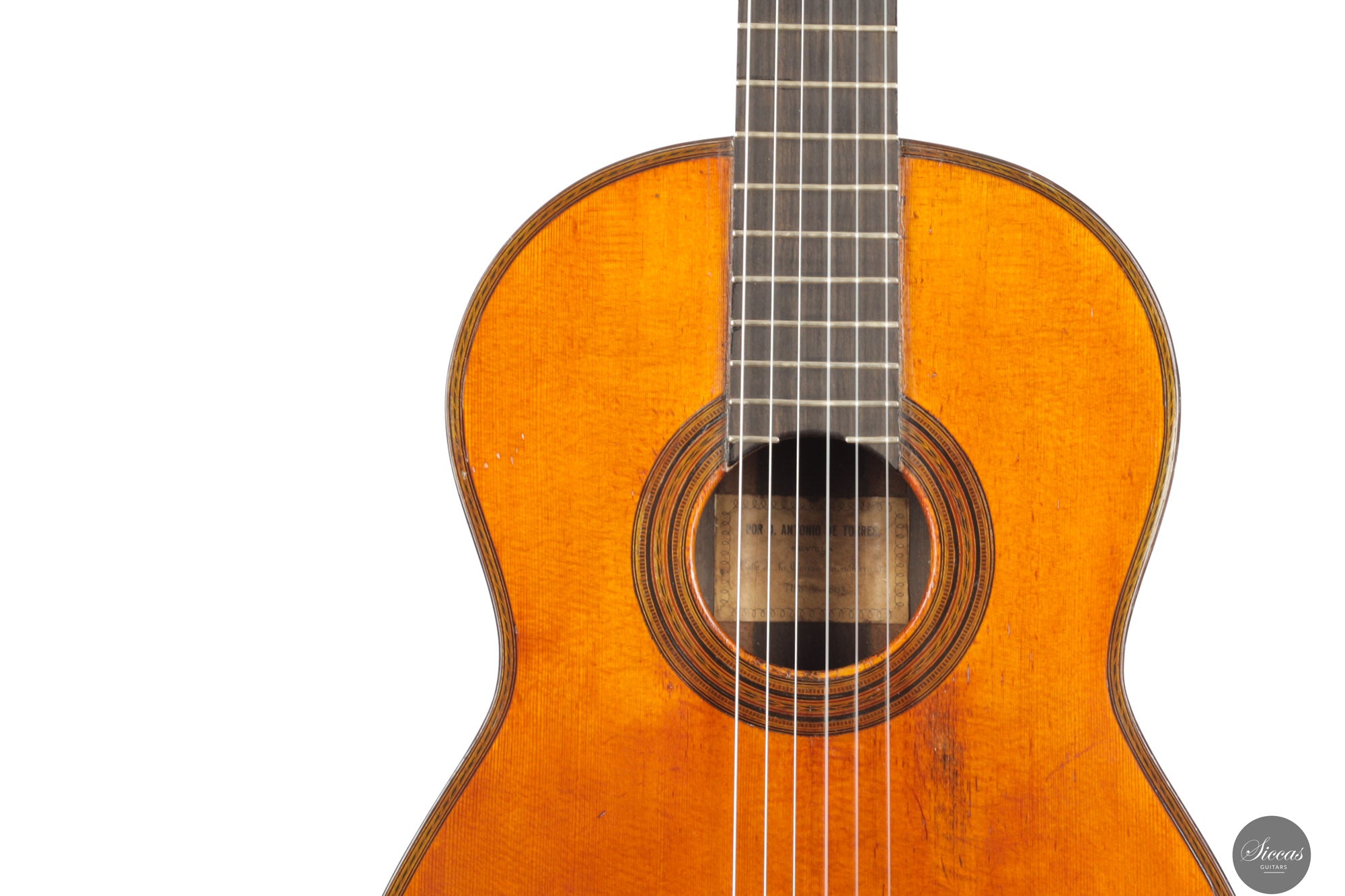 A particularly fascinating aspect is the presence of a Torres label replica inside the body. In keeping with violin-making traditions, where later masters replicated Stradivari labels alongside their own repair inscriptions, Simplicio reproduced the Torres label with subtle differences: notably in the font and the interlaced border motif. A second label added by Simplicio in 1923 affirms his authorship and provides context for the instrument’s creation.