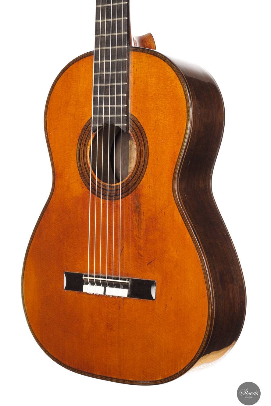 This historically important instrument, dated to the period between 1920 and 1923, is a remarkable tribute to Antonio de Torres. Crafted by Francisco Simplicio, it features a finely grained spruce soundboard and a three-piece Brazilian rosewood back, woods closely resembling those used by Torres in iconic guitars such as the 1860 FE 13 once played by Miguel Llobet.