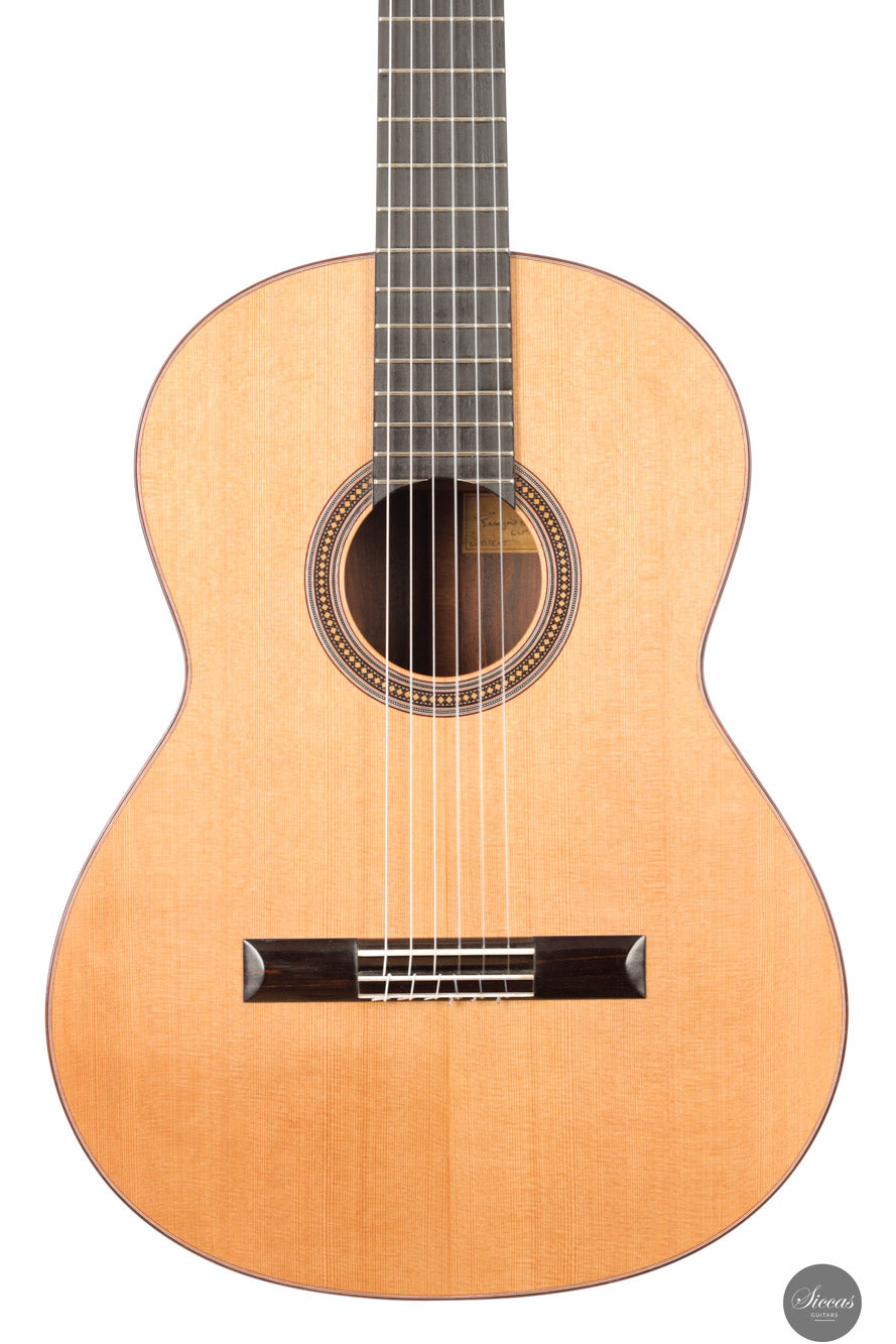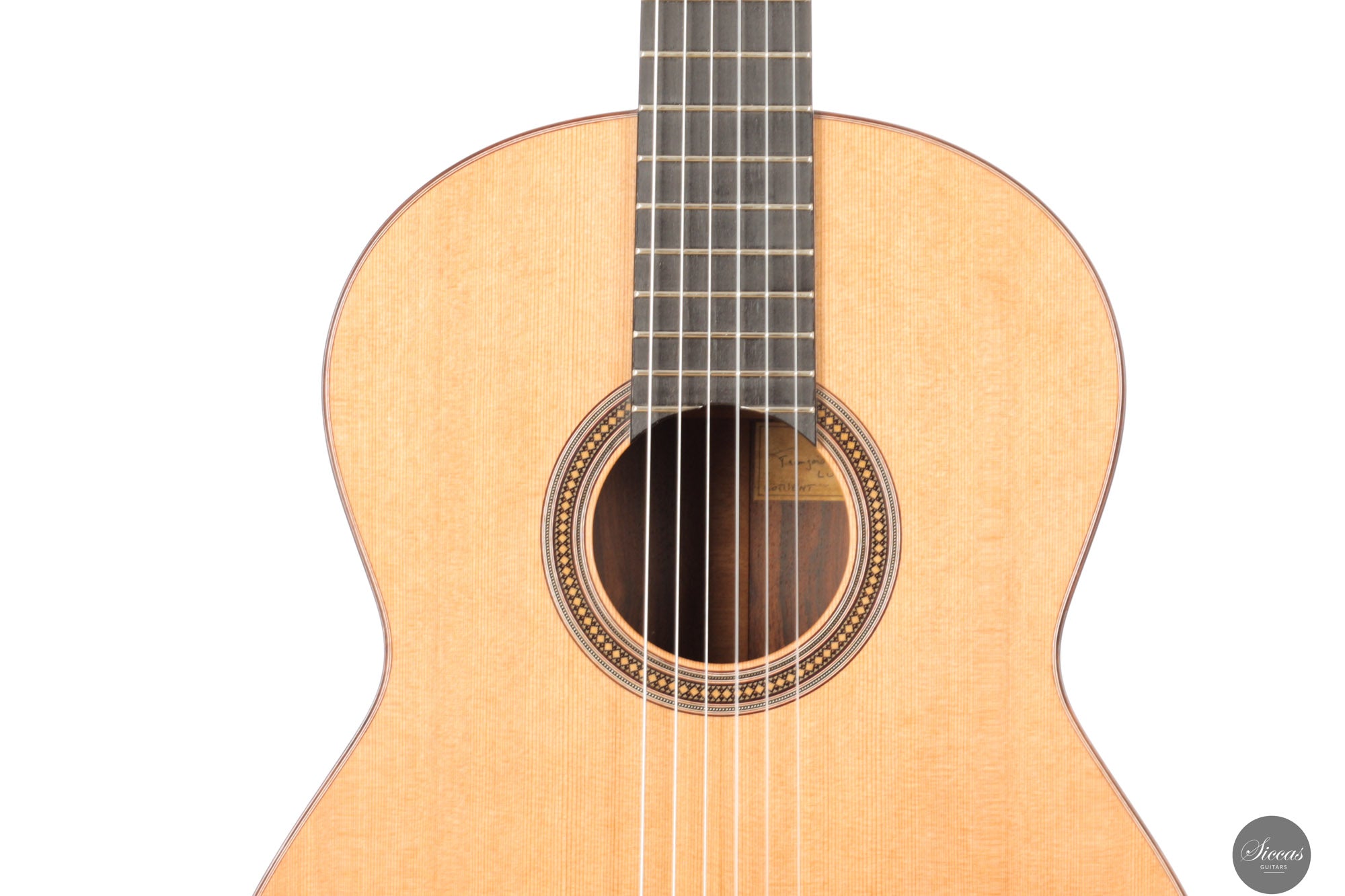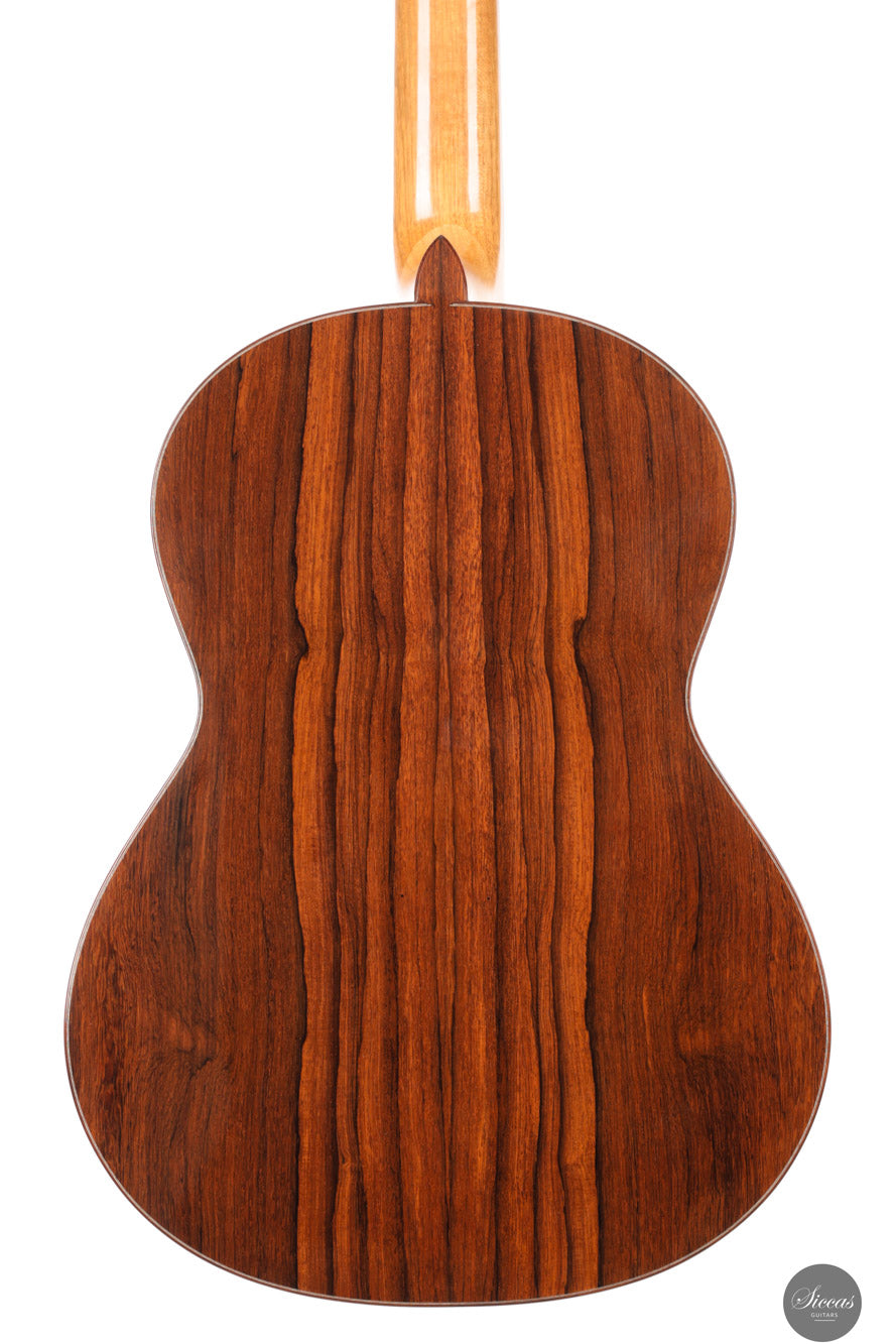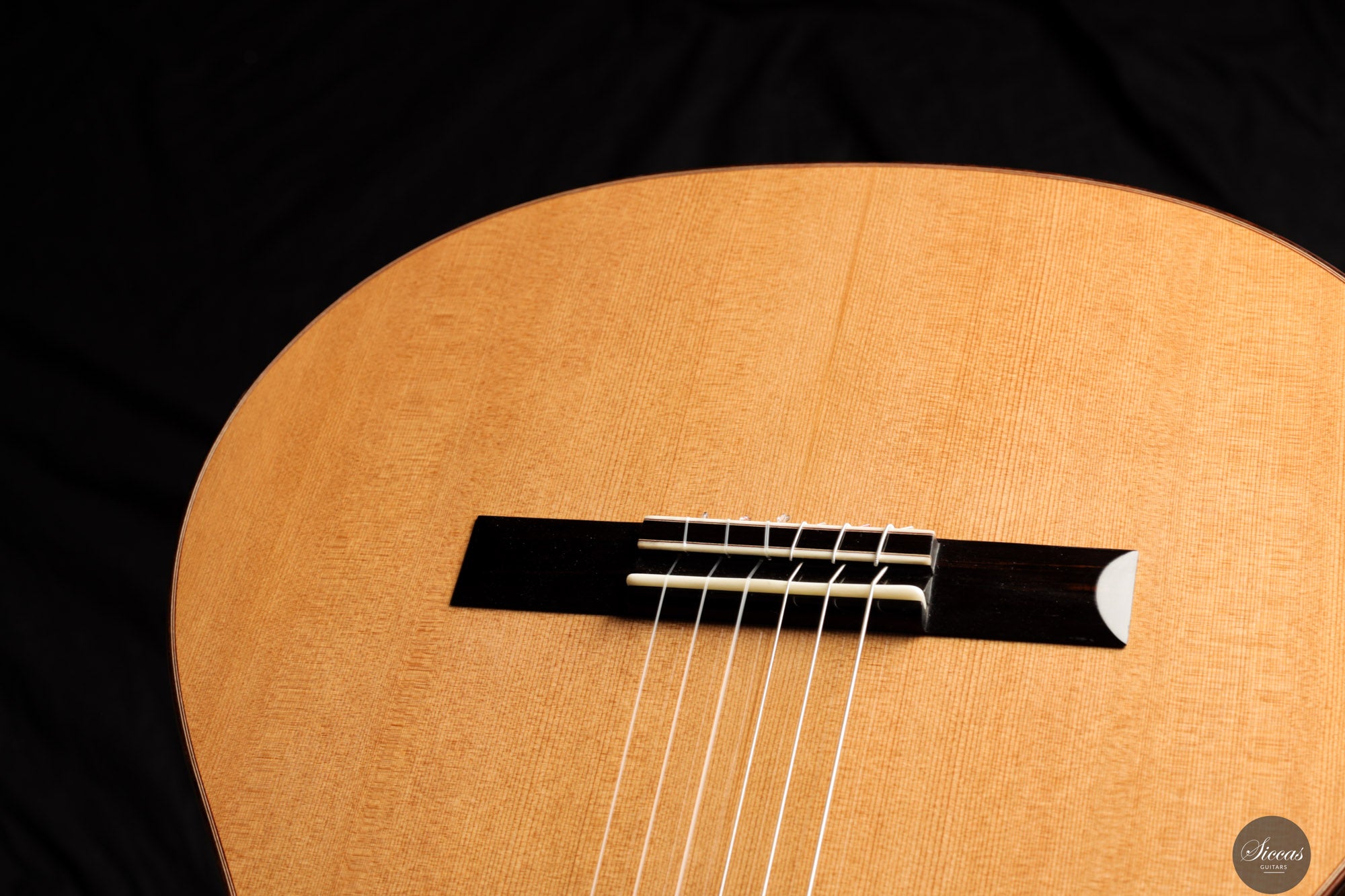 Guitar No. 104 from 2025 once again confirms François Leonard’s ability to deliver instruments of superb tonal balance and depth. Built with a cedar top and Madagascar rosewood back and sides, this lattice-braced guitar offers a complete sound that is both rich and articulate. The basses are warm and profound, while the trebles are open and airy, retaining brilliance without ever sounding harsh. What truly distinguishes this instrument is its remarkable sustain, which enhances phrasing and legato playing. With its 640 mm scale and elegant French polish finish, this guitar is an ideal choice for players seeking a responsive and nuanced concert instrument in a more compact format.