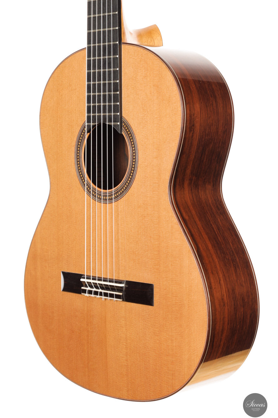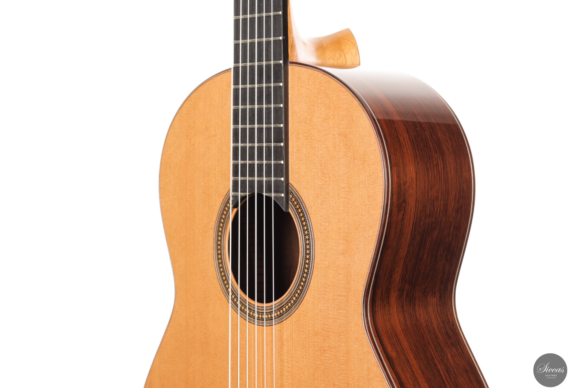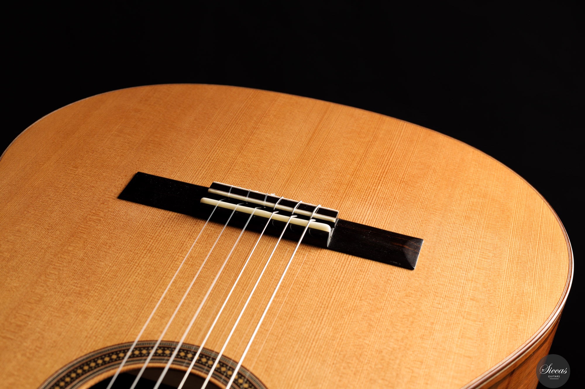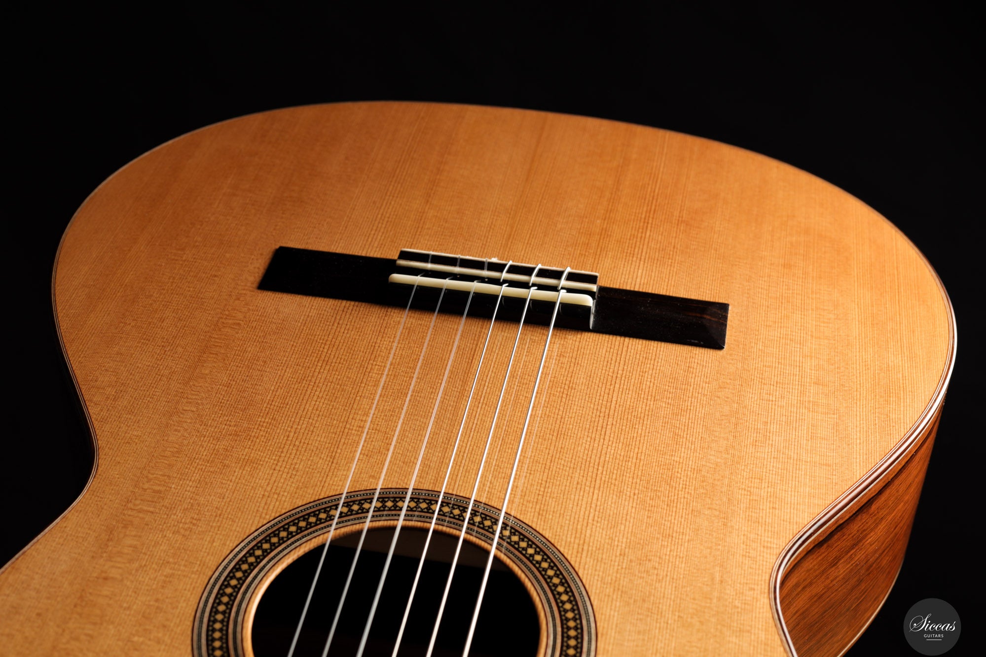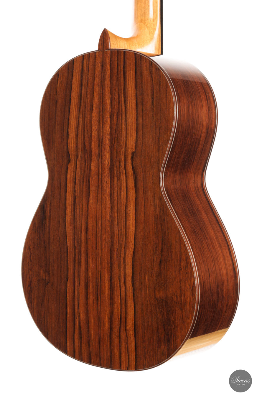 Guitar No. 104 from 2025 once again confirms François Leonard’s ability to deliver instruments of superb tonal balance and depth. Built with a cedar top and Madagascar rosewood back and sides, this lattice-braced guitar offers a complete sound that is both rich and articulate. The basses are warm and profound, while the trebles are open and airy, retaining brilliance without ever sounding harsh. What truly distinguishes this instrument is its remarkable sustain, which enhances phrasing and legato playing. With its 640 mm scale and elegant French polish finish, this guitar is an ideal choice for players seeking a responsive and nuanced concert instrument in a more compact format.
