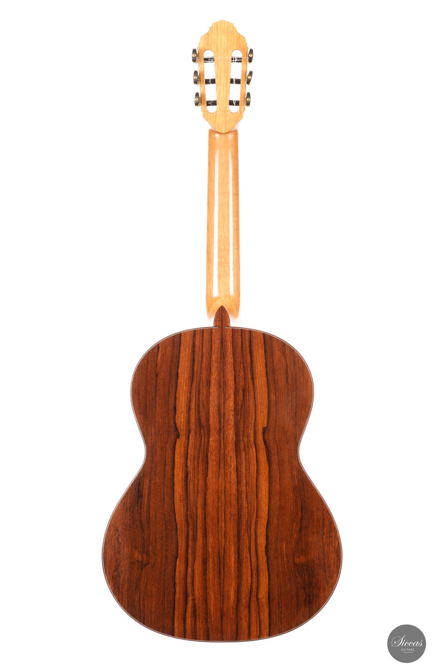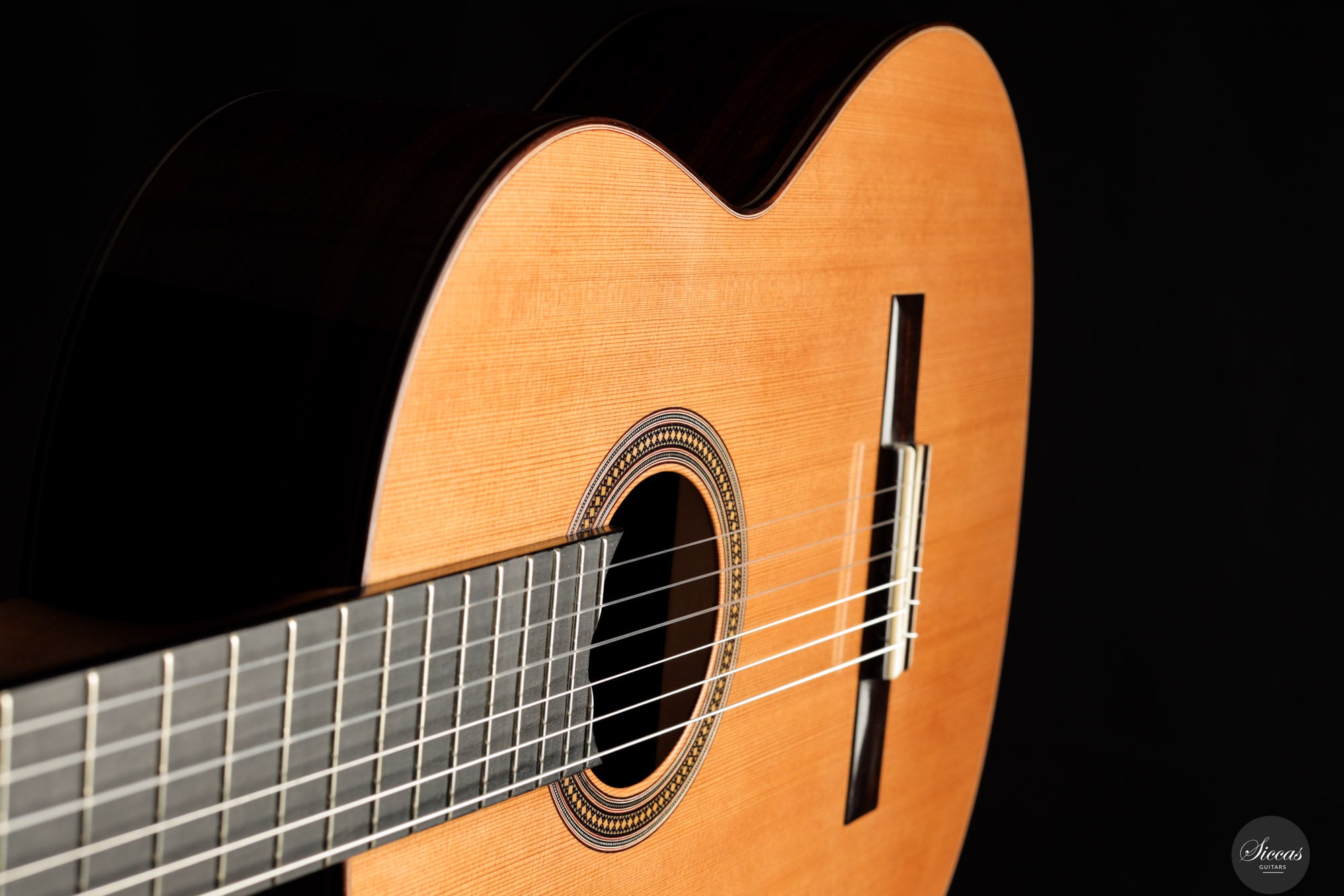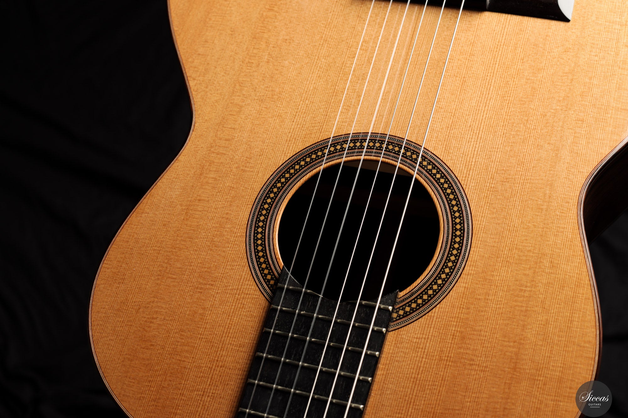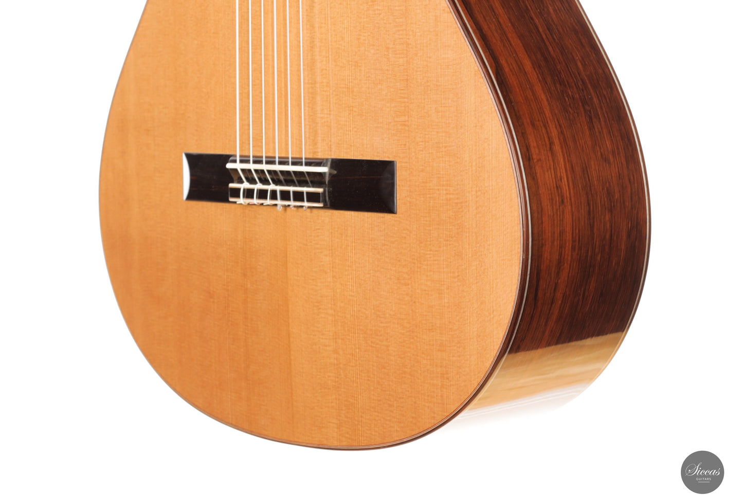 Guitar No. 104 from 2025 once again confirms François Leonard’s ability to deliver instruments of superb tonal balance and depth. Built with a cedar top and Madagascar rosewood back and sides, this lattice-braced guitar offers a complete sound that is both rich and articulate. The basses are warm and profound, while the trebles are open and airy, retaining brilliance without ever sounding harsh. What truly distinguishes this instrument is its remarkable sustain, which enhances phrasing and legato playing. With its 640 mm scale and elegant French polish finish, this guitar is an ideal choice for players seeking a responsive and nuanced concert instrument in a more compact format.