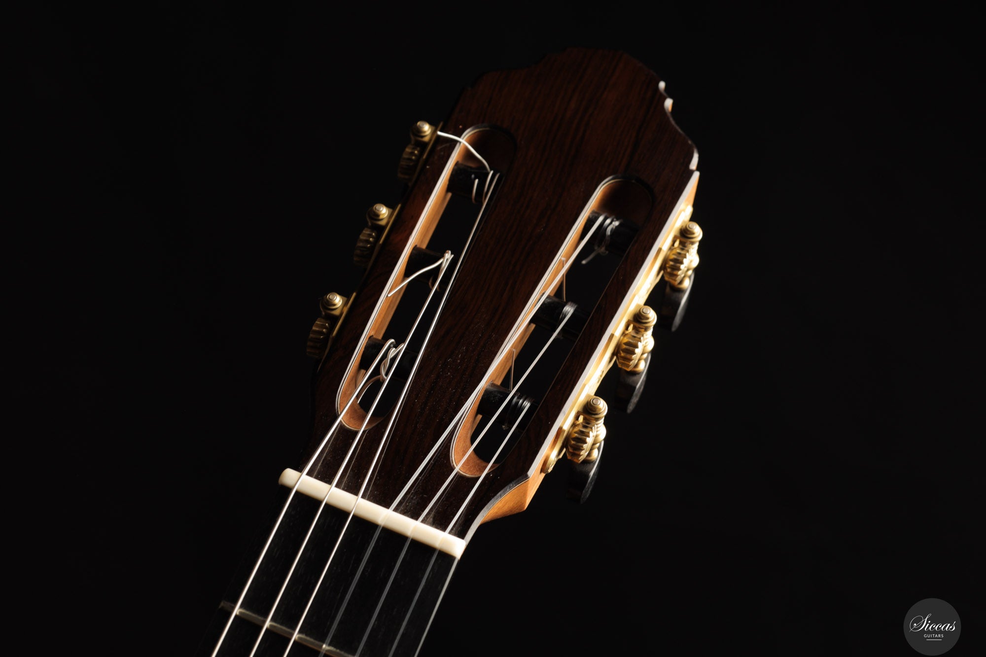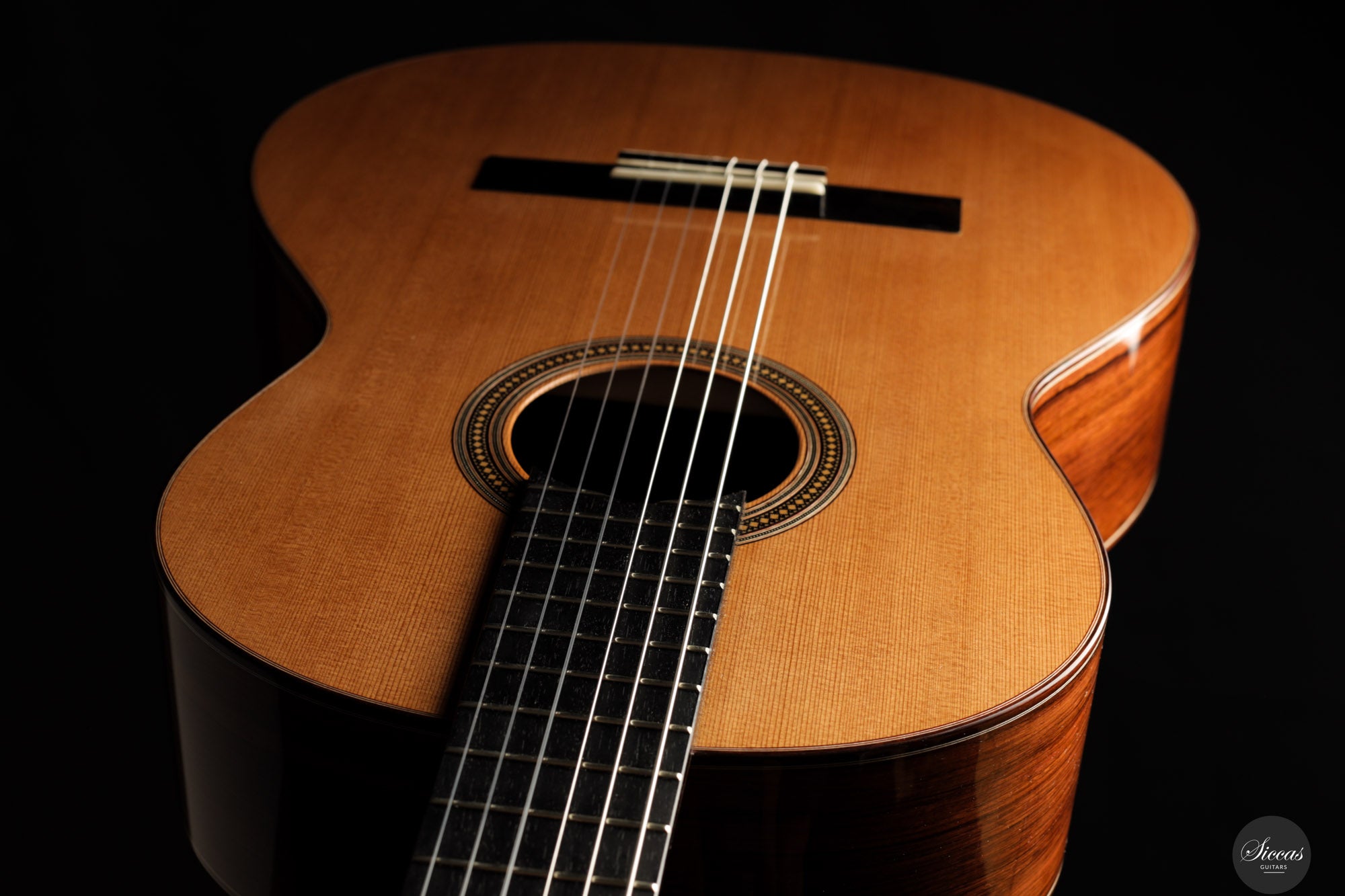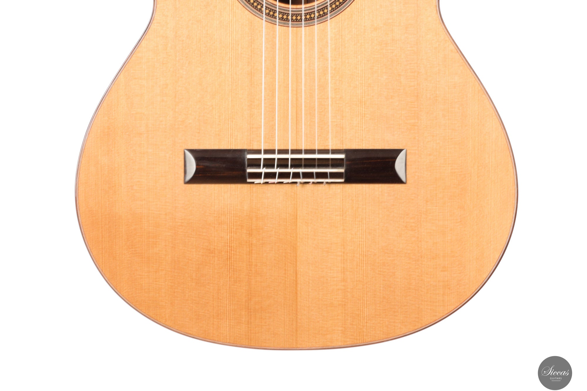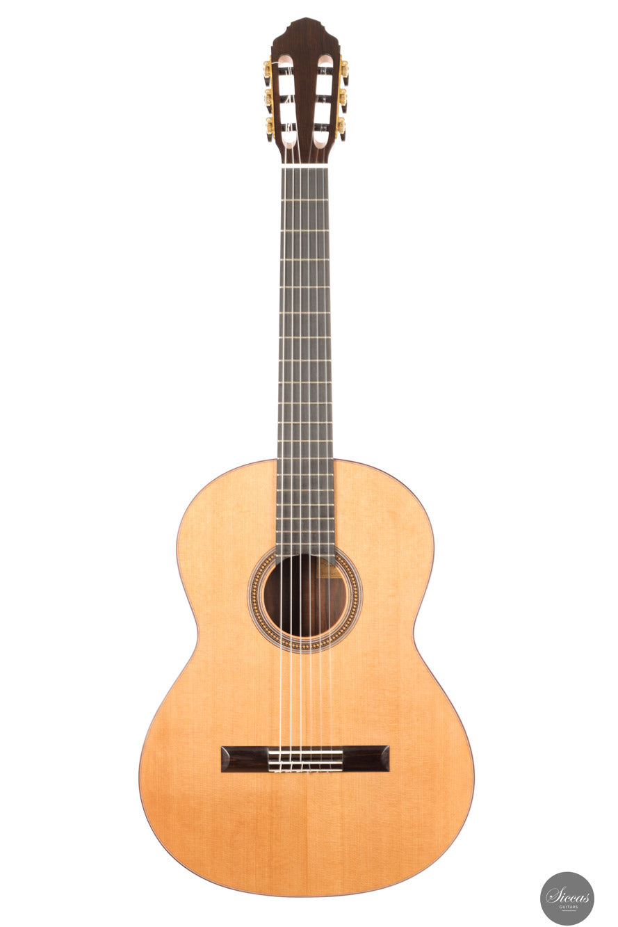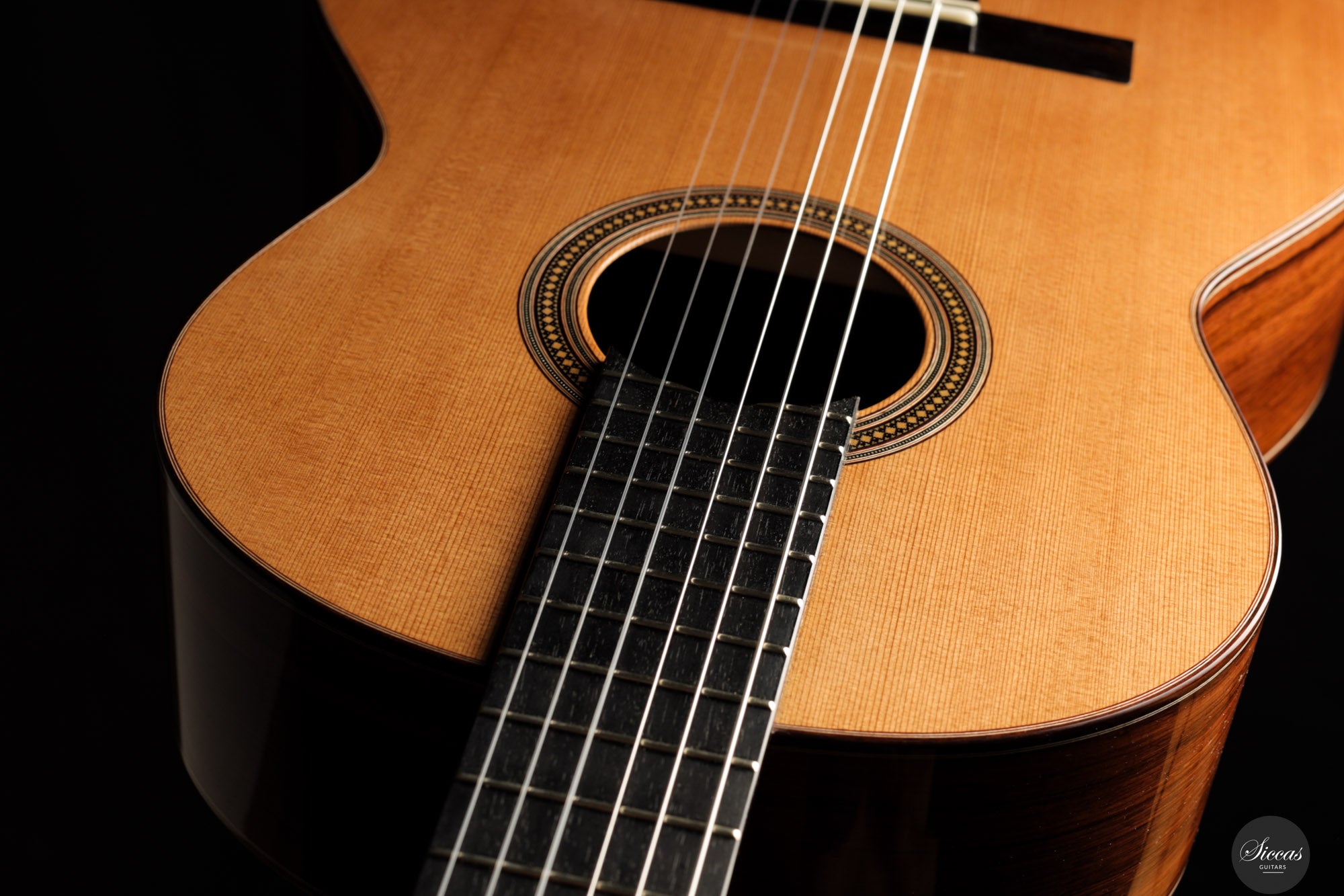 Guitar No. 104 from 2025 once again confirms François Leonard’s ability to deliver instruments of superb tonal balance and depth. Built with a cedar top and Madagascar rosewood back and sides, this lattice-braced guitar offers a complete sound that is both rich and articulate. The basses are warm and profound, while the trebles are open and airy, retaining brilliance without ever sounding harsh. What truly distinguishes this instrument is its remarkable sustain, which enhances phrasing and legato playing. With its 640 mm scale and elegant French polish finish, this guitar is an ideal choice for players seeking a responsive and nuanced concert instrument in a more compact format.