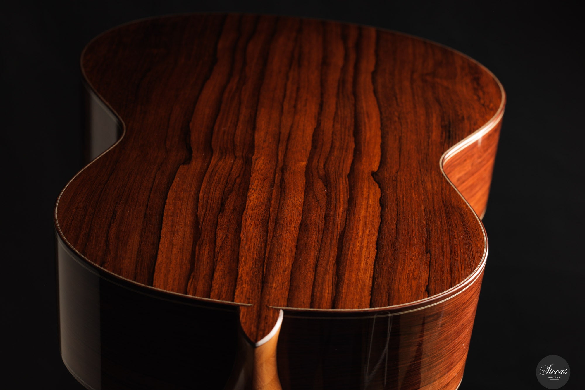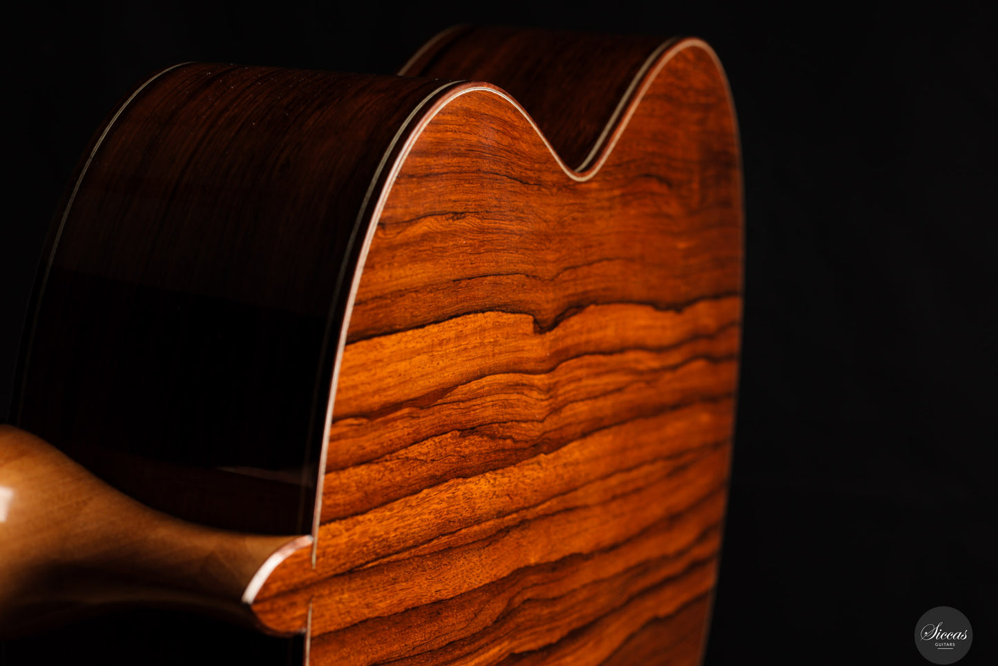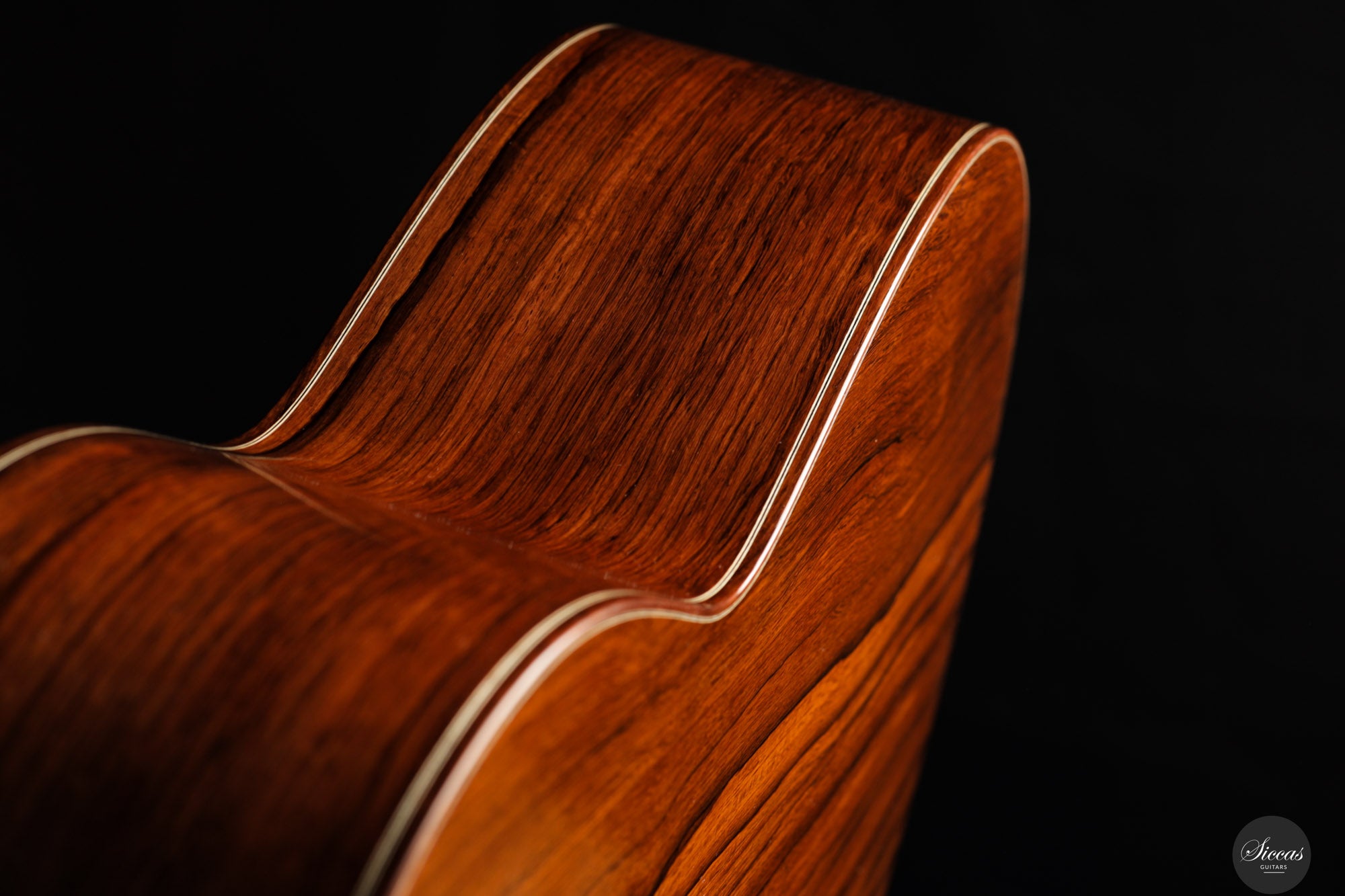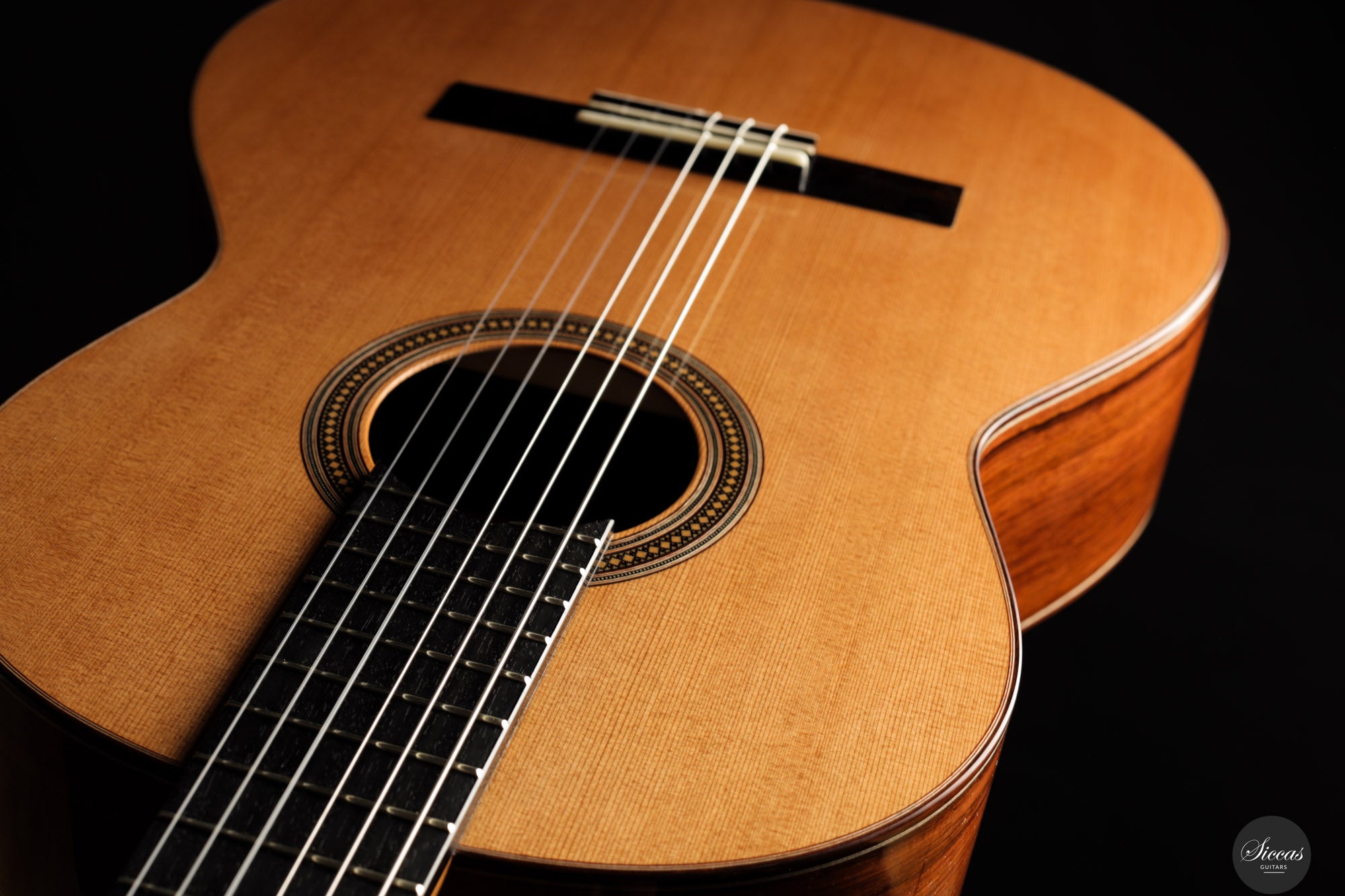 Guitar No. 104 from 2025 once again confirms François Leonard’s ability to deliver instruments of superb tonal balance and depth. Built with a cedar top and Madagascar rosewood back and sides, this lattice-braced guitar offers a complete sound that is both rich and articulate. The basses are warm and profound, while the trebles are open and airy, retaining brilliance without ever sounding harsh. What truly distinguishes this instrument is its remarkable sustain, which enhances phrasing and legato playing. With its 640 mm scale and elegant French polish finish, this guitar is an ideal choice for players seeking a responsive and nuanced concert instrument in a more compact format.