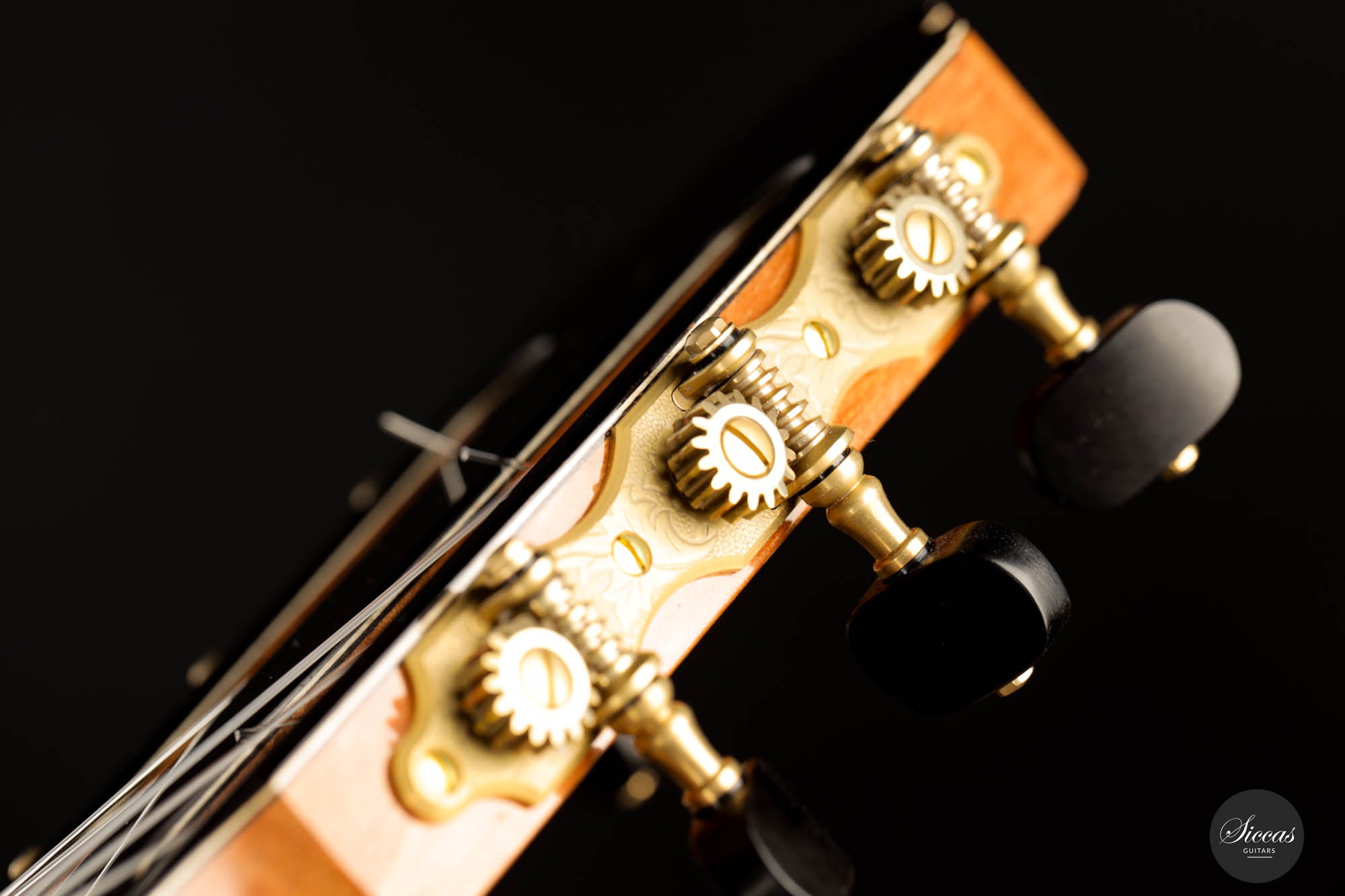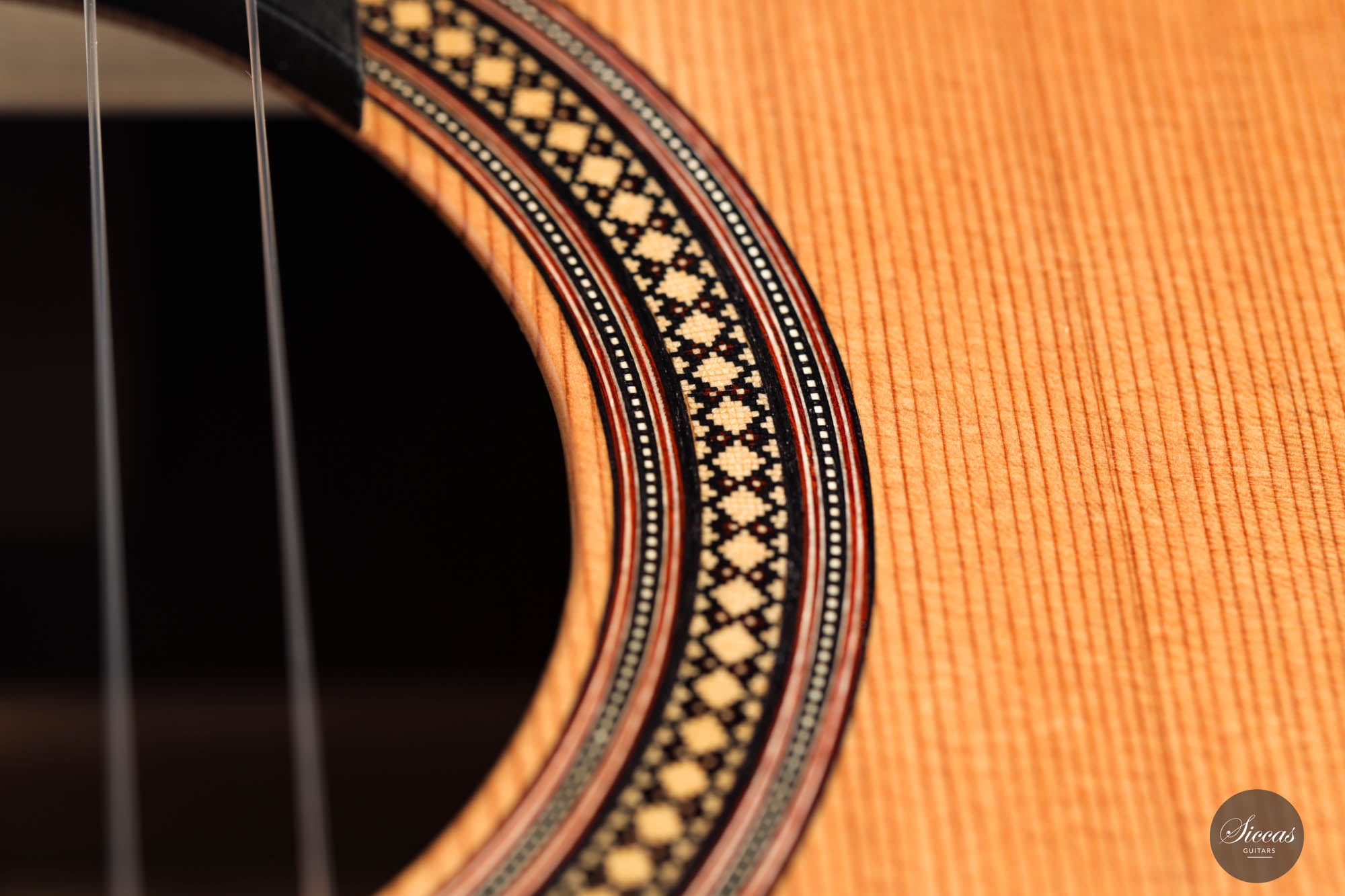 The lattice bracing system, a distinctive feature of this masterpiece, gives rise to a soundboard of unparalleled reactivity. It breathes life into each note, ensuring they swell with resonance and depth. The trebles emanate with profound amplitude, exuding a matured and harmonious timbre, pivotal in upholding the genuine essence of the guitar.