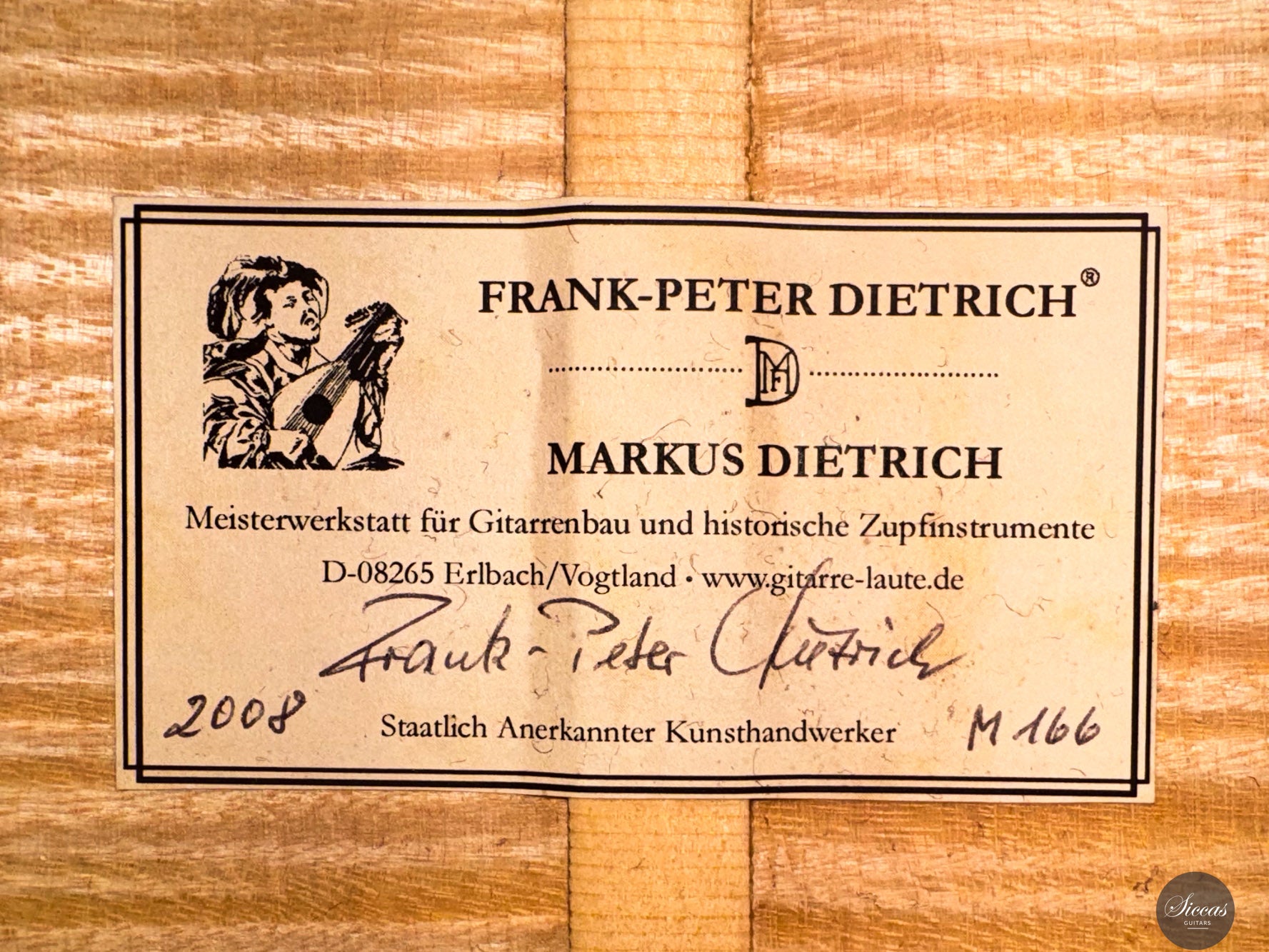 The Dietrich family has been engaged in the craft of instrument making since the early 19th century, with a documented history in constructing mandolins, lutes, woodwinds, and violins. Since 1904, the focus has been on guitar and lute making, now represented by master luthier Frank-Peter Dietrich and his son Markus Dietrich, who continues the tradition into its fourth generation. Their workshop in Germany is well known for precise craftsmanship and tonal excellence, serving students, amateurs, and professional soloists alike.