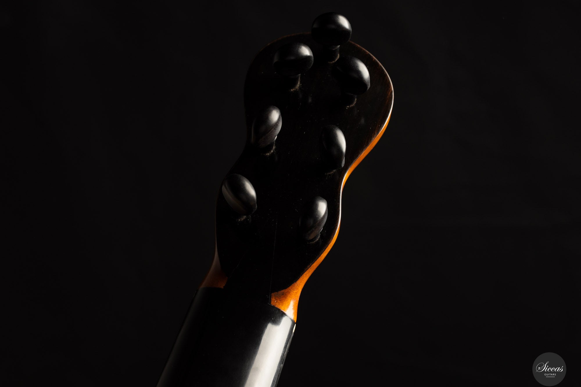 The top is made of fine spruce, while the back and sides are constructed from beautifully flamed maple. This classic tonewood pairing contributes to the instrument’s soft yet rich sound, characterized by excellent clarity, separation, and a singing quality across registers. The waxed top and French polished back and sides highlights the natural grain of the wood, adding a warm and elegant visual touch to the instrument’s overall presentation.