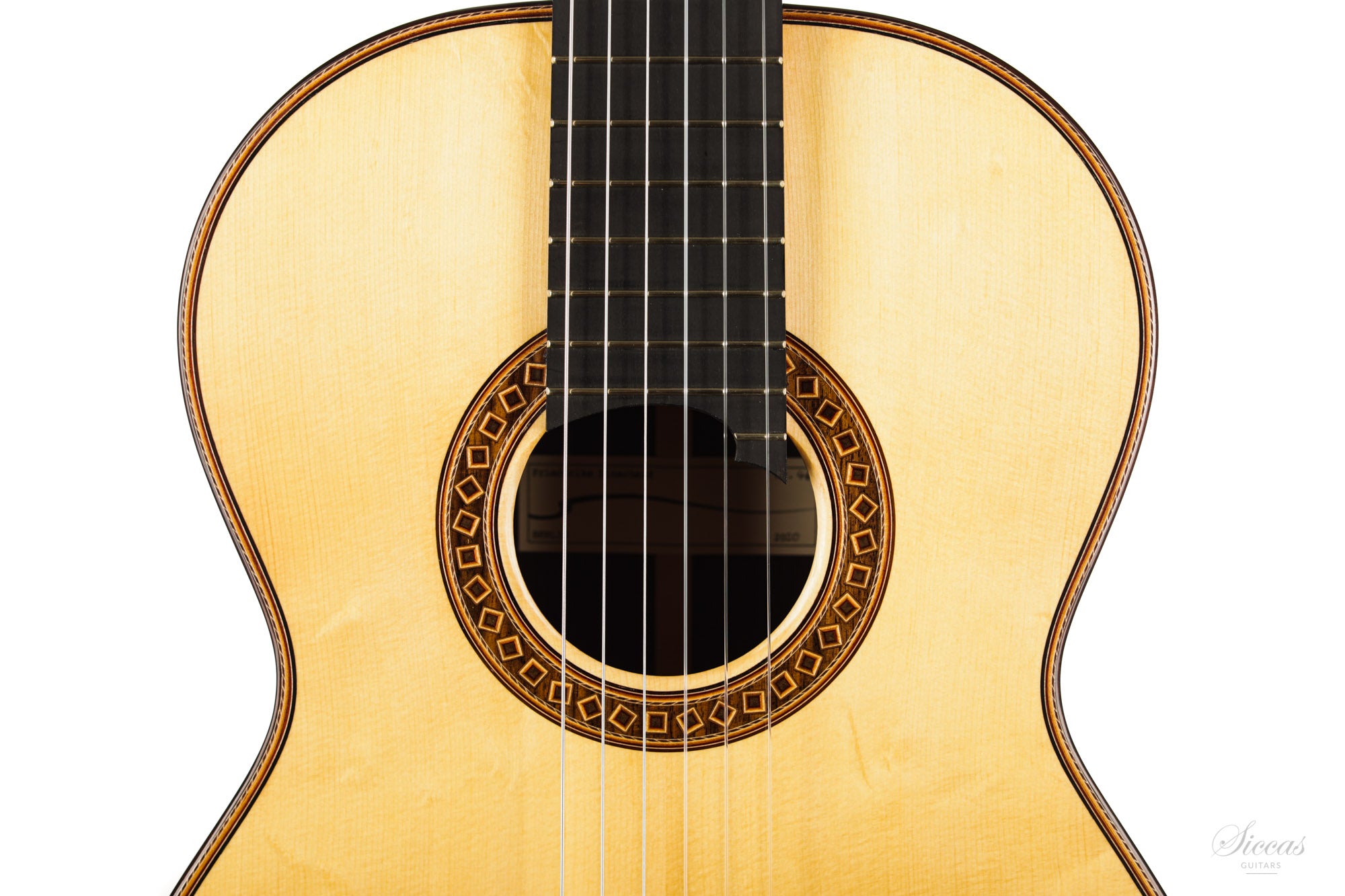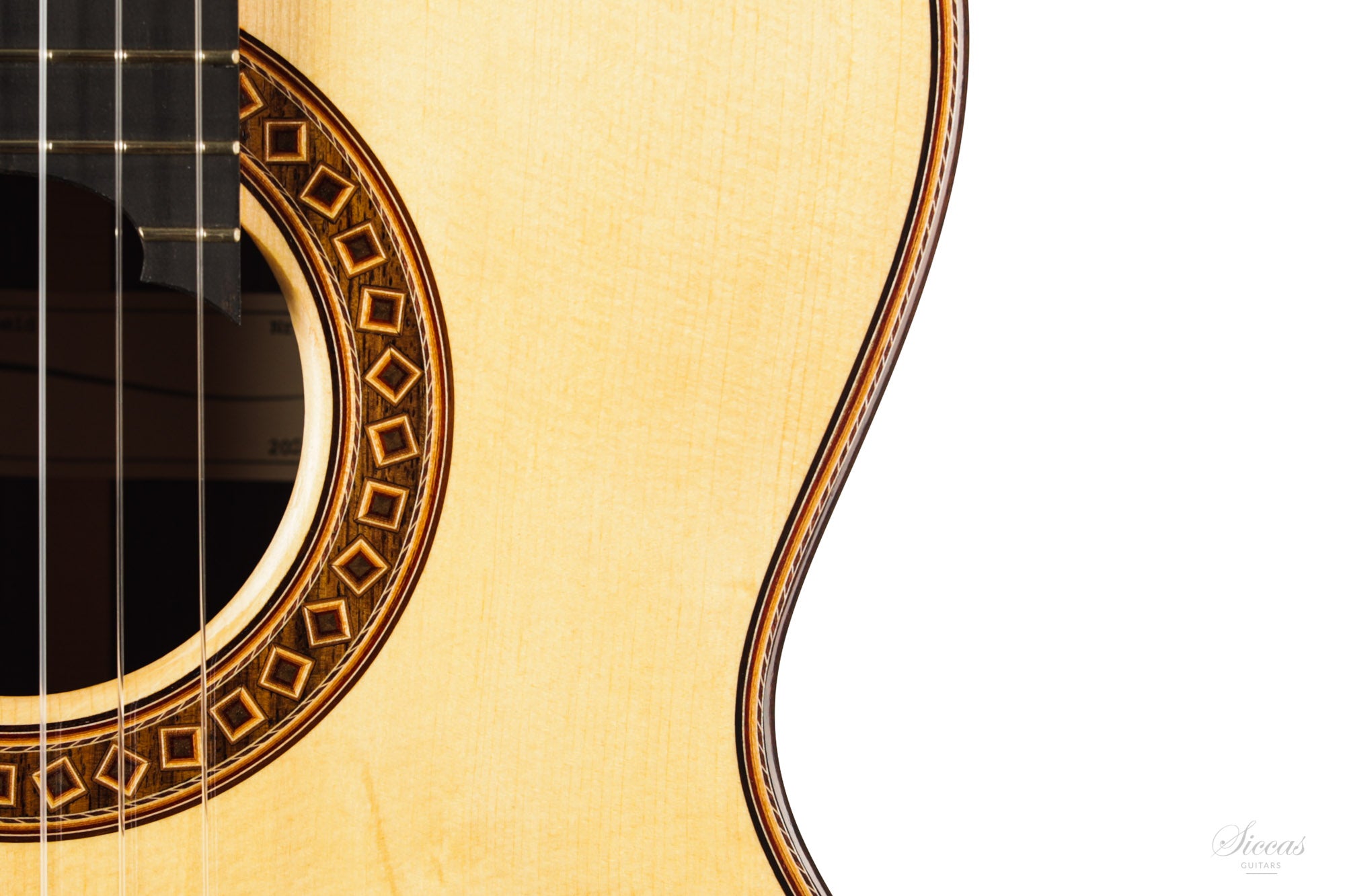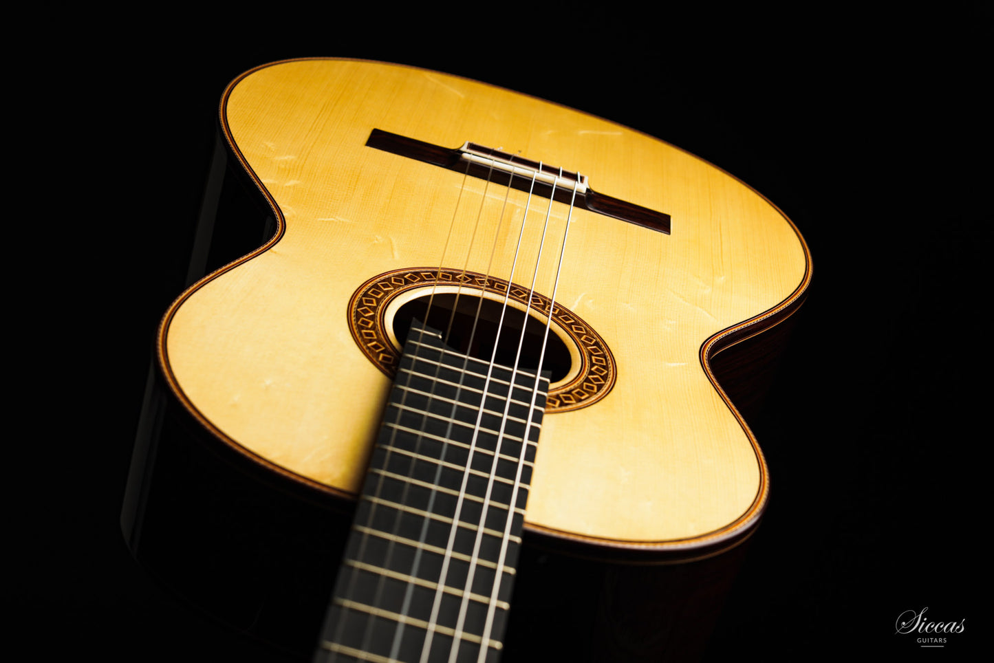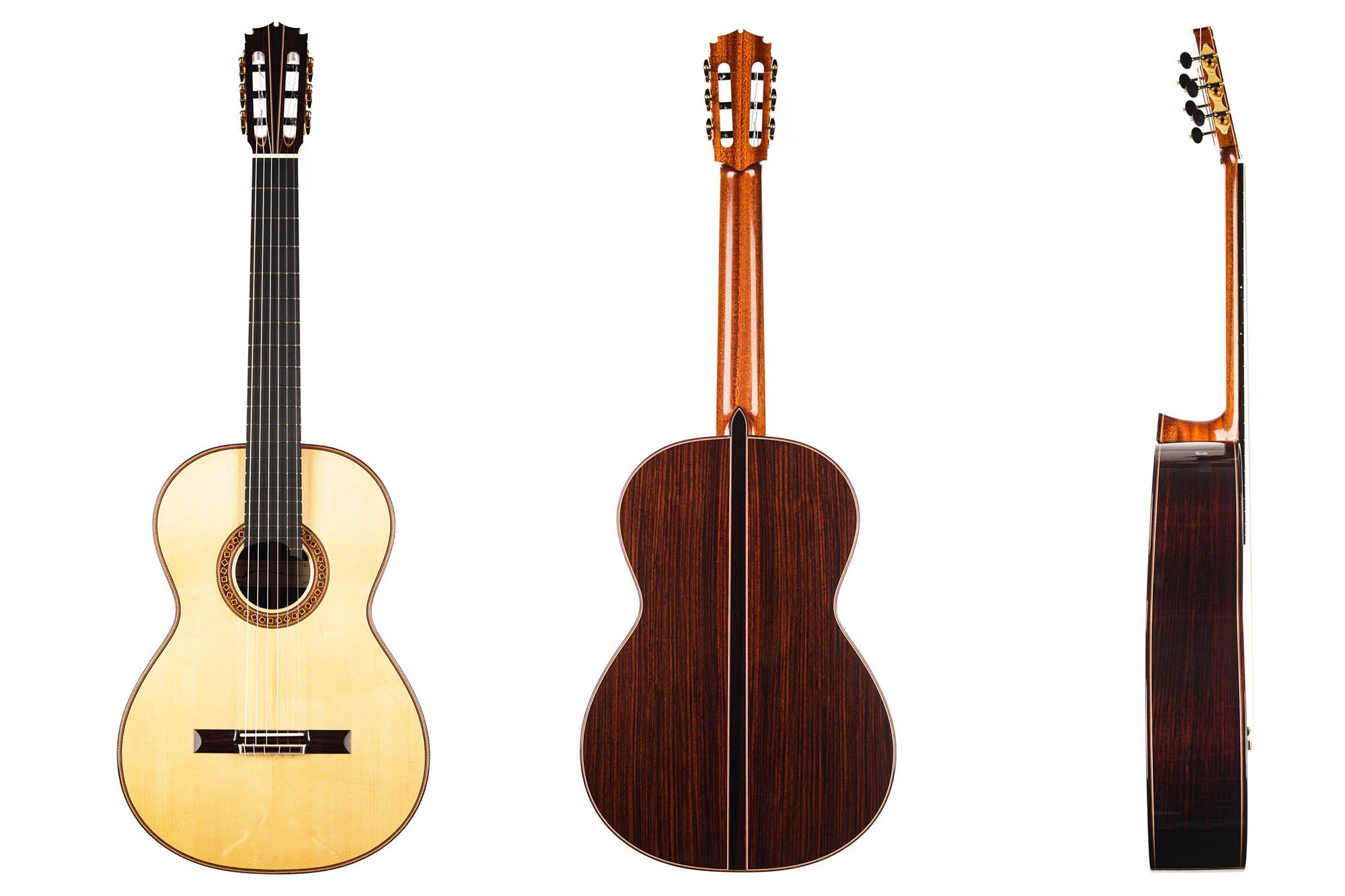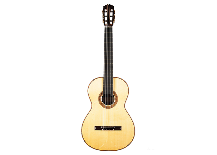 The construction is based on the Spanish tradition. In addition, the soundboard bracing follows the concept of Robert Bouchet, with a filigree control of the thicknesses. Discreet structural and optical details go beyond the conventional frame. For example, the soundboard falls off the treble side above the soundhole, increasing the height of the fretboard and thus improving playability and sound projection in the high treble. It is therefore a guitar which is powerful enough to go on stage, with a very comfortable playability and everything a professional guitarist would be looking for.