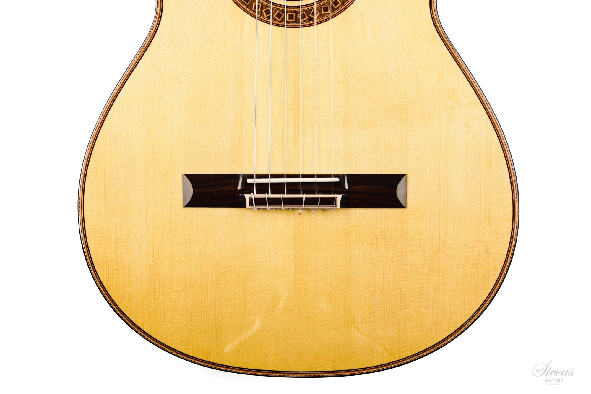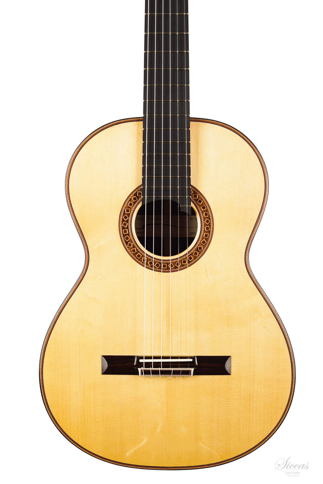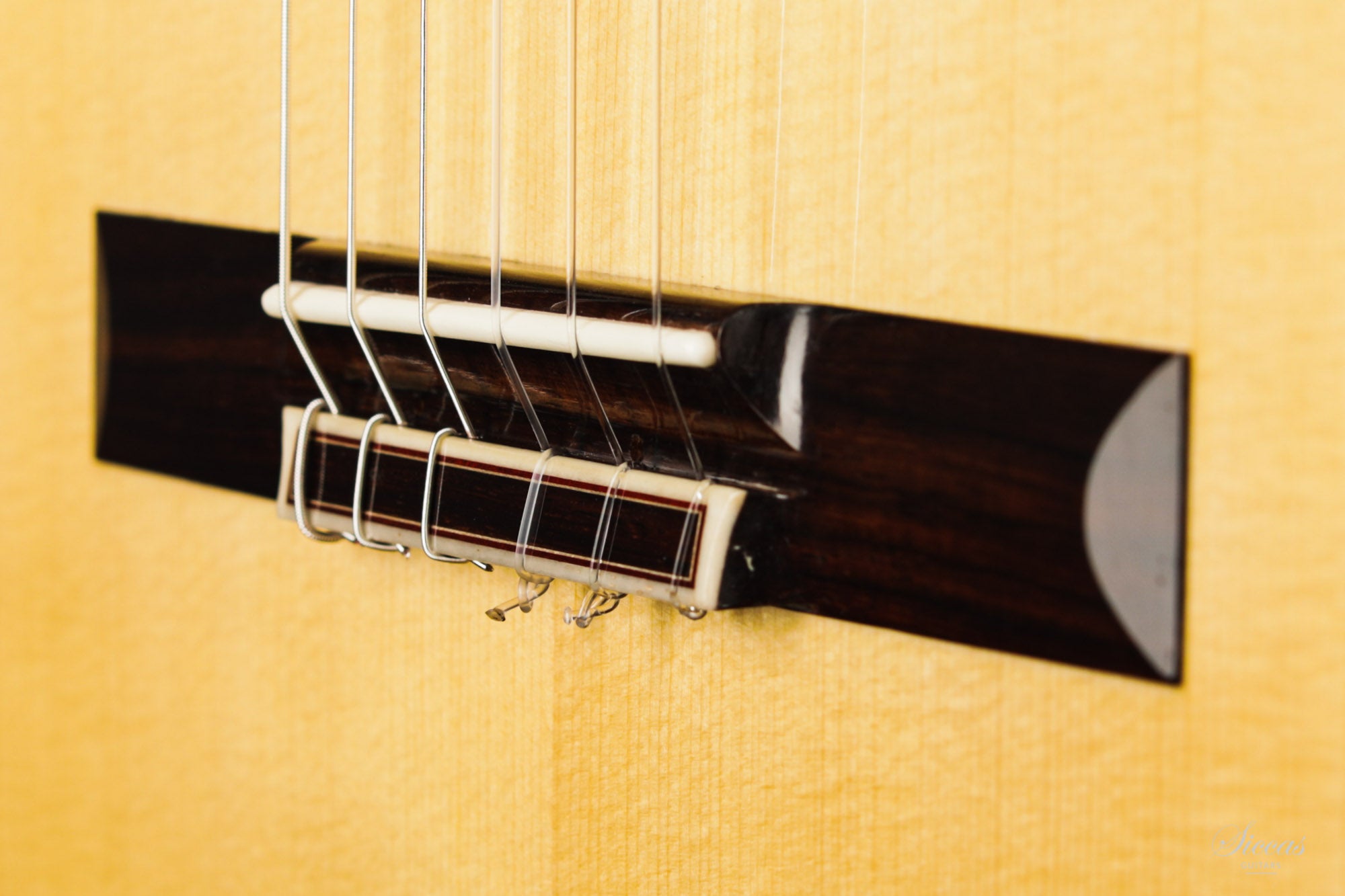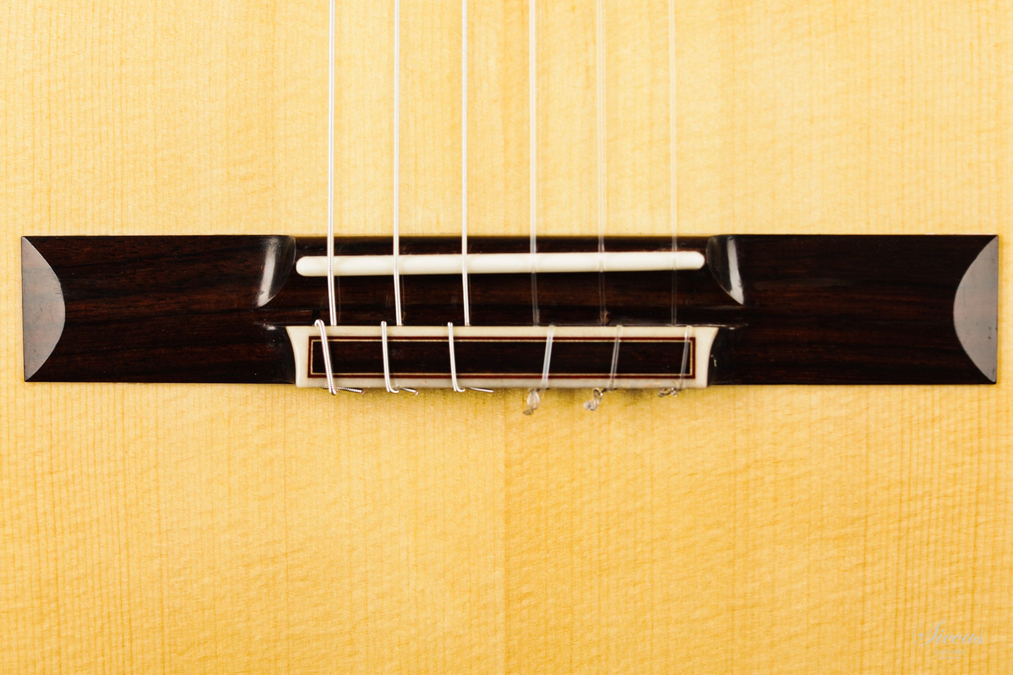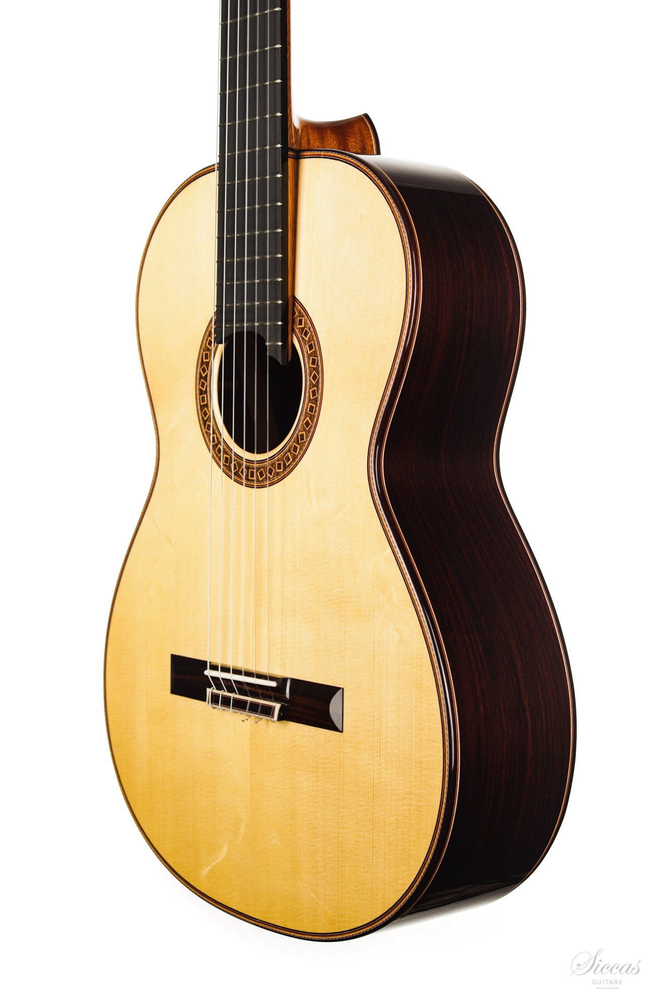 The construction is based on the Spanish tradition. In addition, the soundboard bracing follows the concept of Robert Bouchet, with a filigree control of the thicknesses. Discreet structural and optical details go beyond the conventional frame. For example, the soundboard falls off the treble side above the soundhole, increasing the height of the fretboard and thus improving playability and sound projection in the high treble. It is therefore a guitar which is powerful enough to go on stage, with a very comfortable playability and everything a professional guitarist would be looking for.