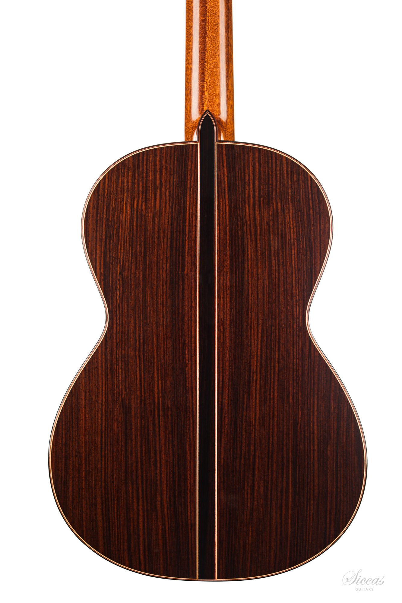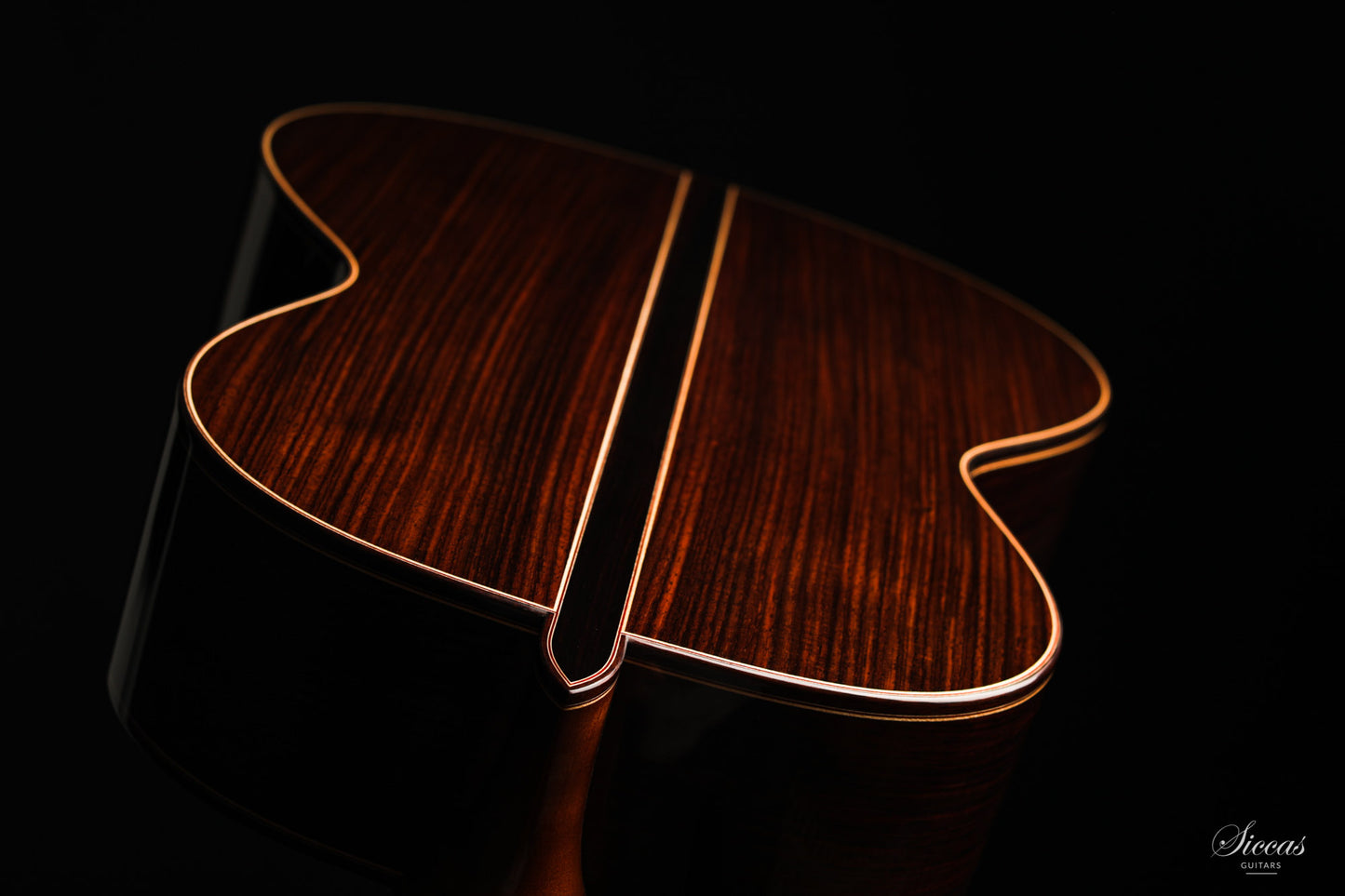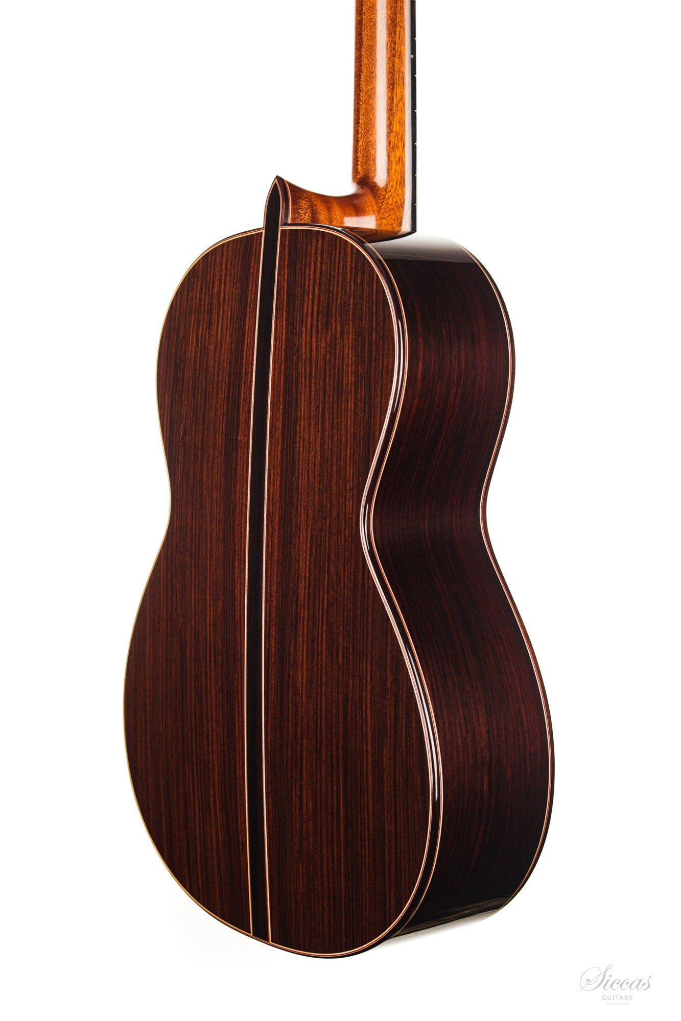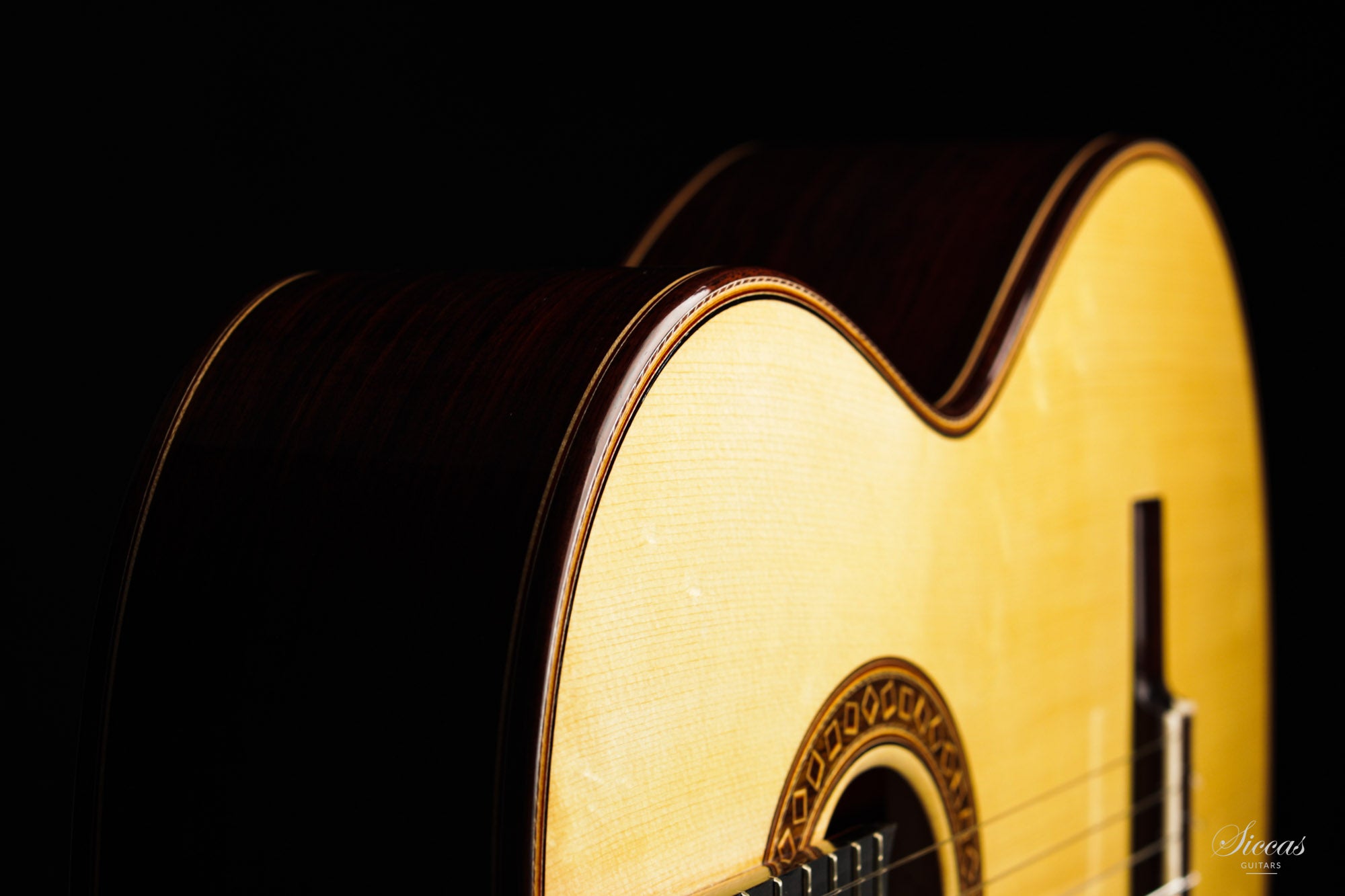 The construction is based on the Spanish tradition. In addition, the soundboard bracing follows the concept of Robert Bouchet, with a filigree control of the thicknesses. Discreet structural and optical details go beyond the conventional frame. For example, the soundboard falls off the treble side above the soundhole, increasing the height of the fretboard and thus improving playability and sound projection in the high treble. It is therefore a guitar which is powerful enough to go on stage, with a very comfortable playability and everything a professional guitarist would be looking for.