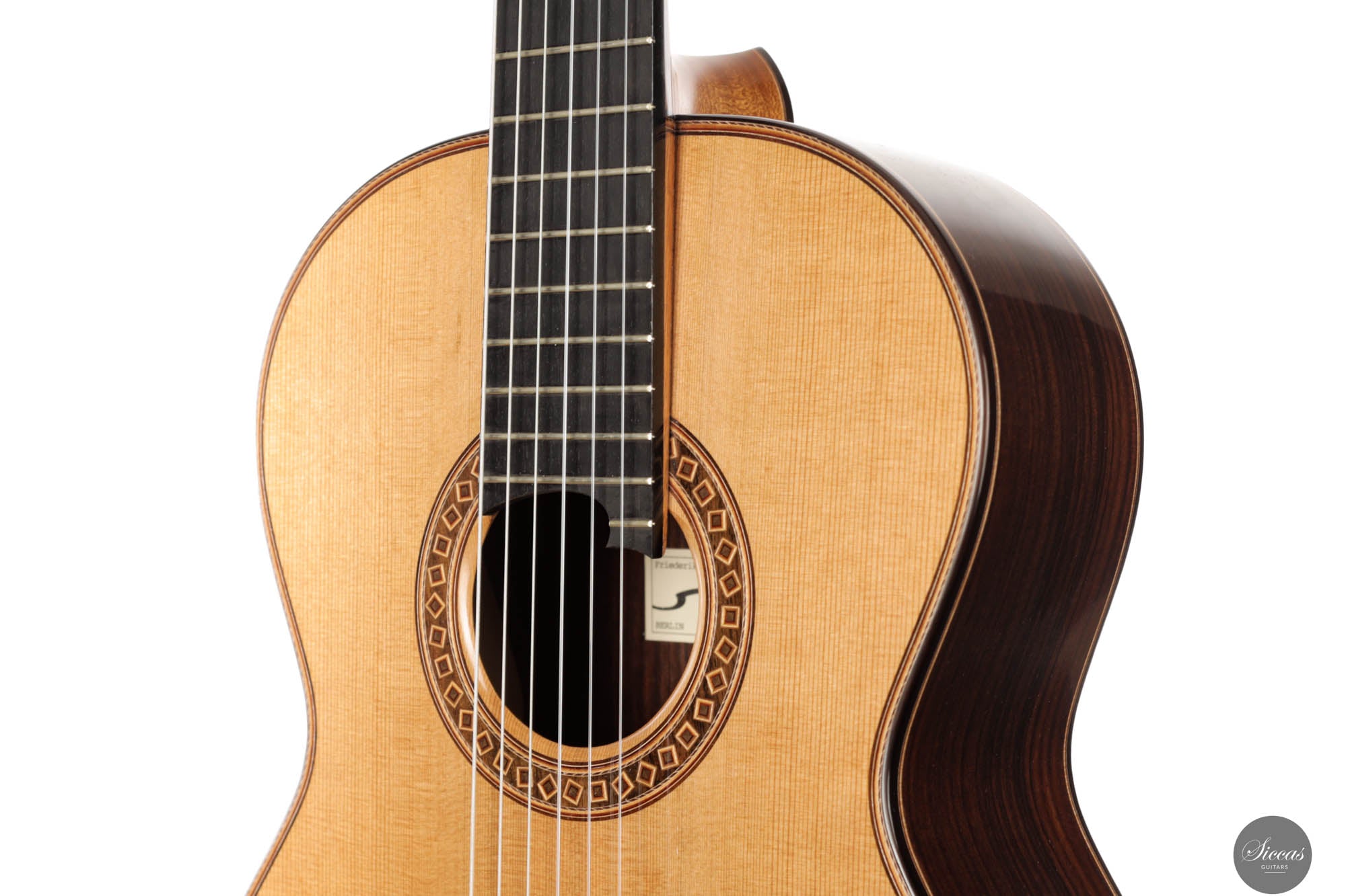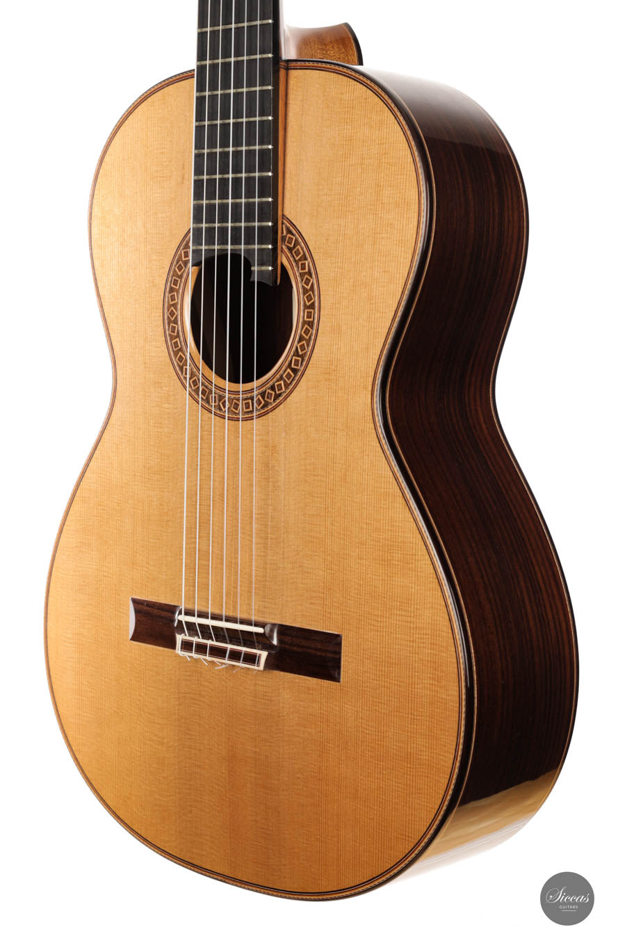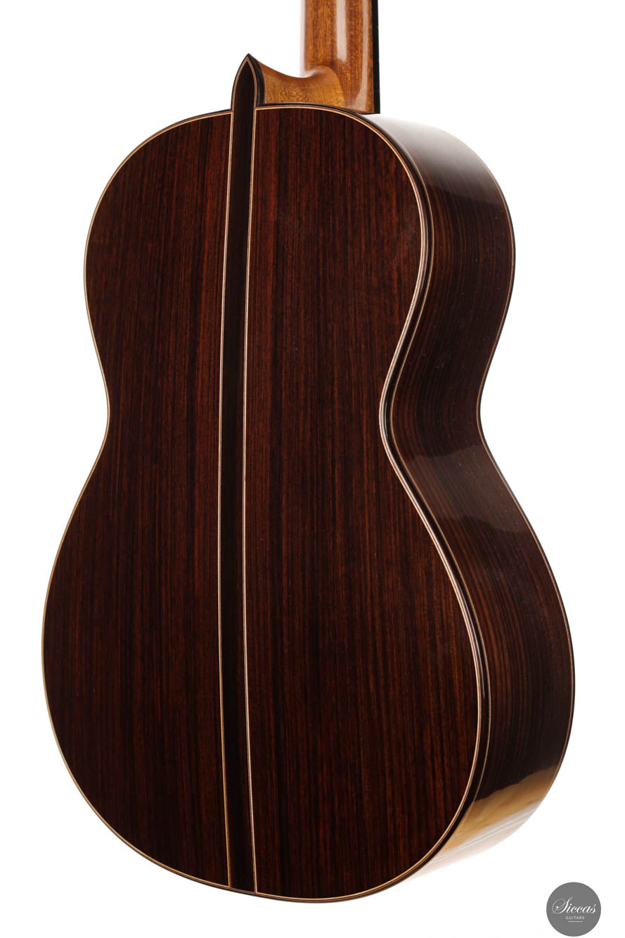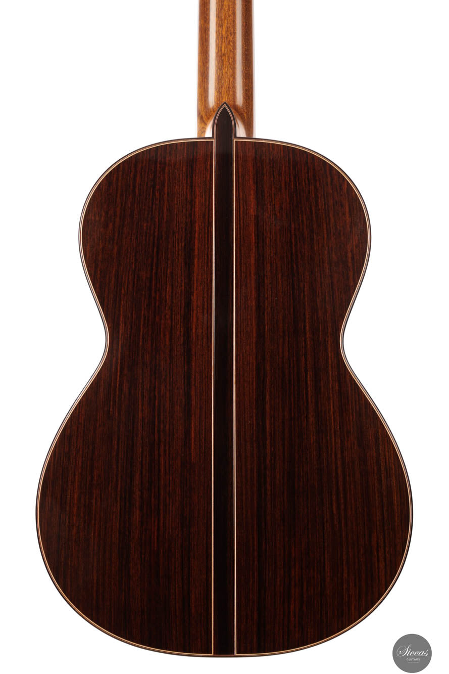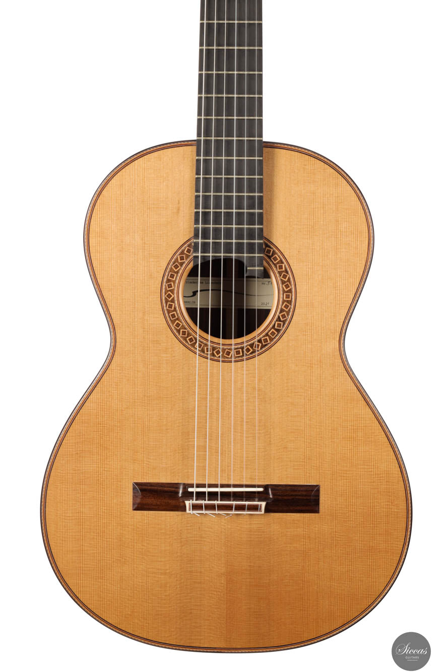 Friederike Linscheid's guitar, numbered 51, emerges from her workshop as a traditionally constructed marvel, designed to deliver unparalleled musical expression. The choice of a cedar top, complemented by spruce bracing inspired by Robert Bouchet, endows this instrument with a rich, full-bodied, and warm tone, distinguishing it in the realm of classical guitars. The incorporation of Indian rosewood sides, laminated with mahogany in a manner reminiscent of Daniel Friederich's craftsmanship, and reinforced with braces styled after Dominique Field, contributes to the guitar's robust character. This meticulous construction results in a guitar that not only produces an expressive sound but also showcases a wide spectrum of tonal colors, making it a treasure trove of musical possibilities. As a pre-loved instrument, this guitar is in excellent condition with superficial playing wears.