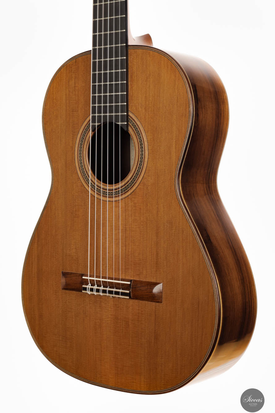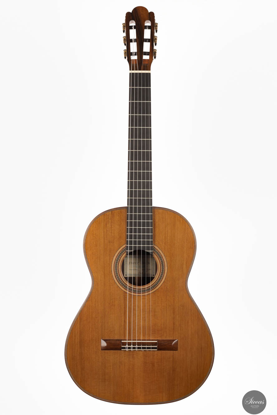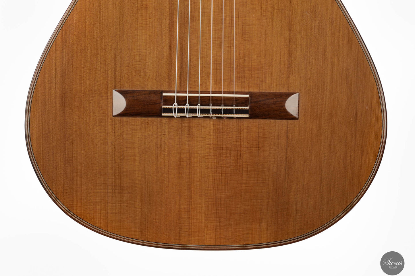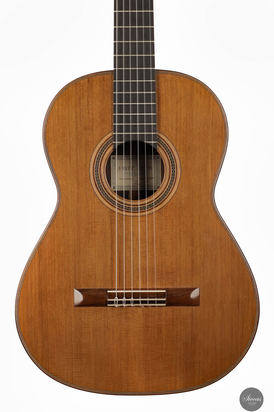 The 2006 Fritz Ober guitar stands as a paragon of expert luthiery, showcasing the pinnacle of craftsmanship in the realm of classical guitars. Maintained in excellent condition with only superficial playing marks, this guitar is as visually appealing as it is acoustically captivating. It features a cedar top, which is notably rare for Fritz Ober instruments, adding a unique richness and depth to its sound profile. The F main body resonance distinctly shapes the character of the basses, lending them a deep, dark, and somewhat mysterious quality. This careful structural engineering allows for a full spectrum of sounds, from the profound and refined bass notes to the trebles that echo with a melodious sweetness. The rounded tone of this guitar, coupled with its extensive range of sound-color possibilities, provides musicians with a unique opportunity to traverse various musical terrains, making it a genuinely versatile instrument.