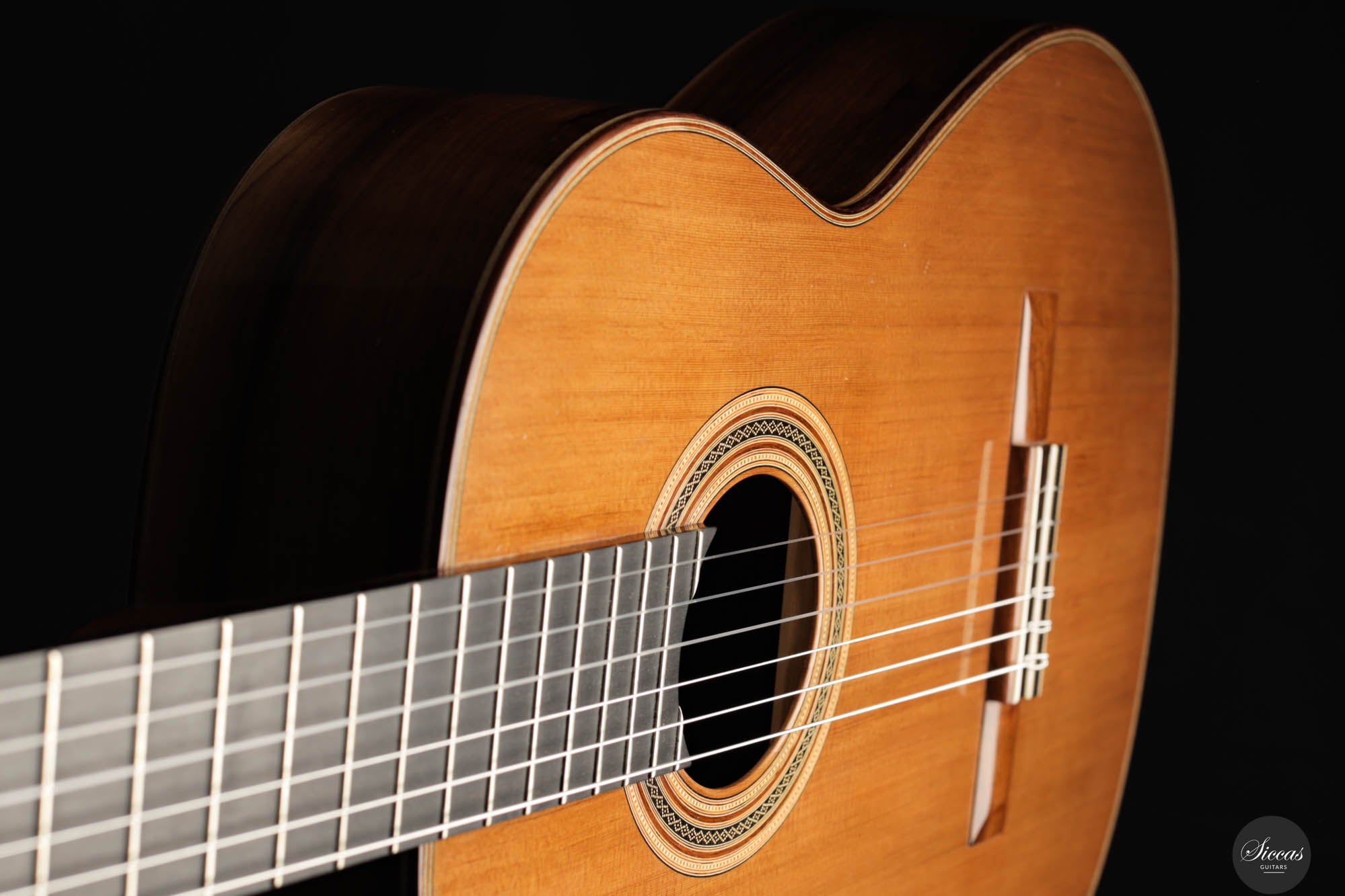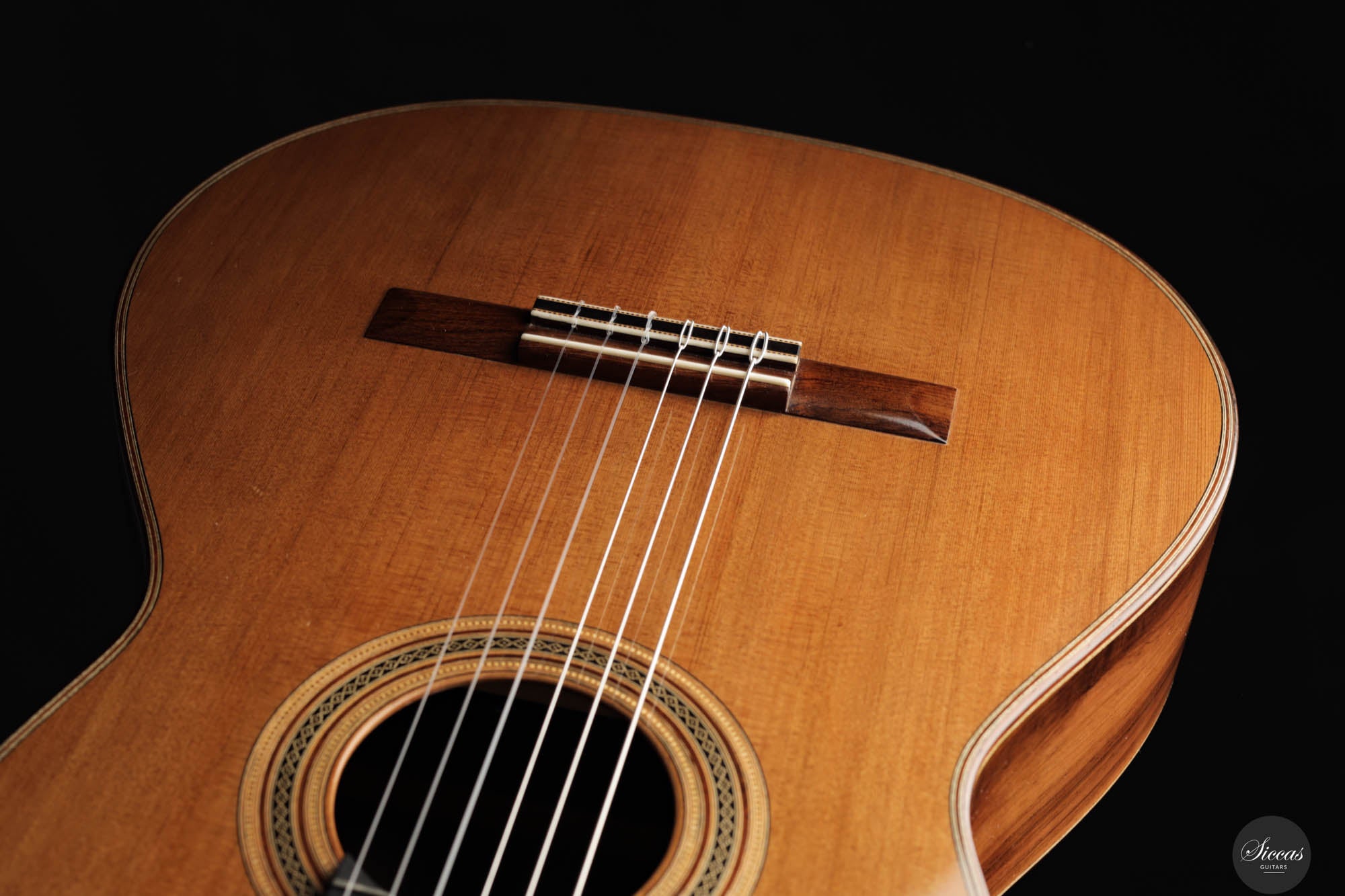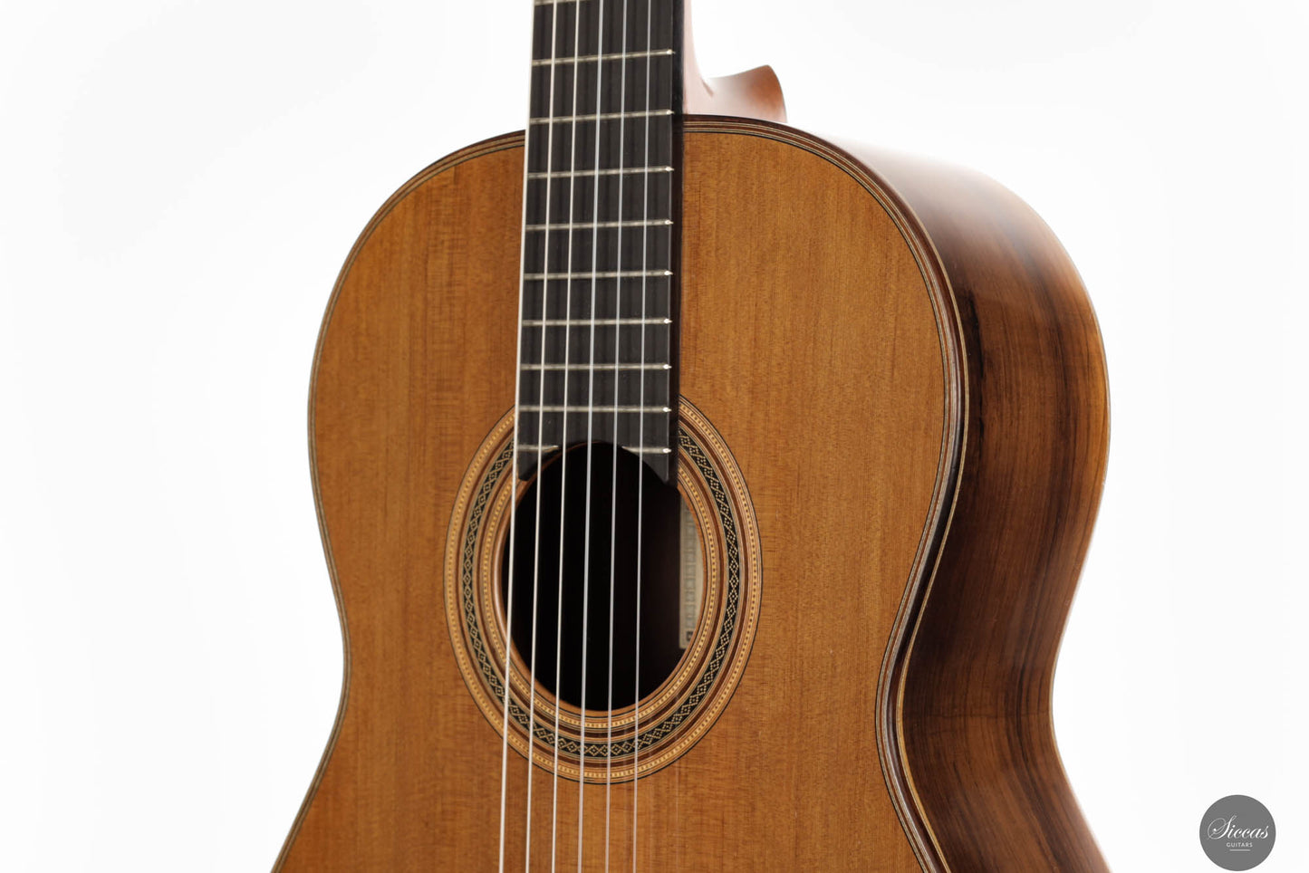 The 2006 Fritz Ober guitar stands as a paragon of expert luthiery, showcasing the pinnacle of craftsmanship in the realm of classical guitars. Maintained in excellent condition with only superficial playing marks, this guitar is as visually appealing as it is acoustically captivating. It features a cedar top, which is notably rare for Fritz Ober instruments, adding a unique richness and depth to its sound profile. The F main body resonance distinctly shapes the character of the basses, lending them a deep, dark, and somewhat mysterious quality. This careful structural engineering allows for a full spectrum of sounds, from the profound and refined bass notes to the trebles that echo with a melodious sweetness. The rounded tone of this guitar, coupled with its extensive range of sound-color possibilities, provides musicians with a unique opportunity to traverse various musical terrains, making it a genuinely versatile instrument.