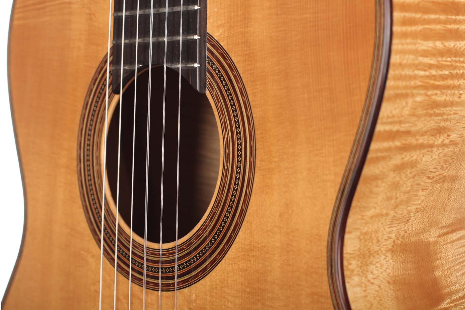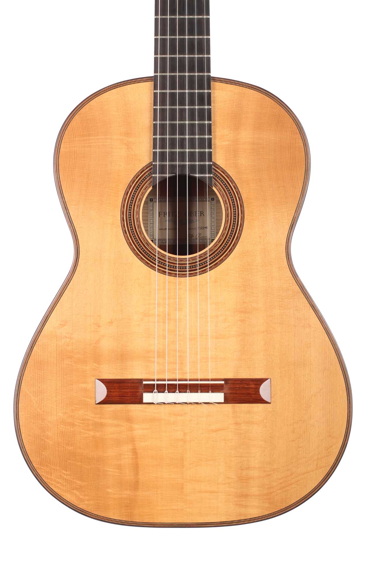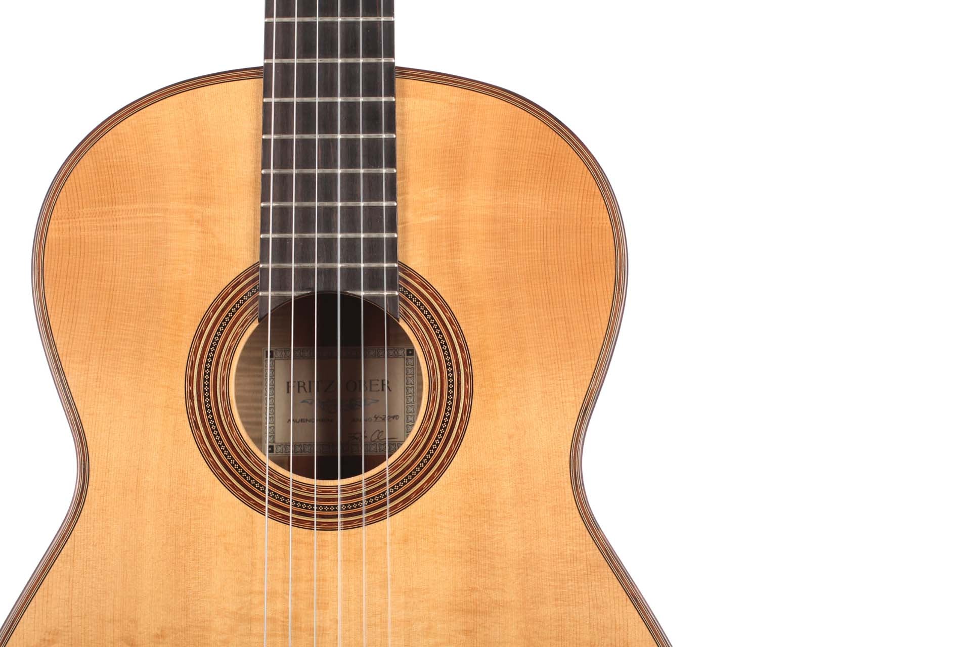 This Fritz Ober guitar was built in 2010. For Fritz Ober, old Masters such as Antonio de Torres are a source of inspiration when he builds his guitars and he complements their achievements with his own ideas and artistic skills. The top is made of European Spruce and back and sides are made of marvelously flamed maple. Due to the golden yellow French polish the wood obtains beautiful depth and liveliness. The rosette is a real master-piece and emphasizes the beauty of the instrument even more. Elements of snake wood on the back, the headstock and the binding round of the overall image in a harmonic way. The Instrument is wonderfully versatile and sounds terrific with a lot of colors and nuances. The basses are warm and the trebles lyric, colorful and clear. The maple, which is used for back and sides gives the sound a silvery and singing touch. The high-end tuners are made by Klaus Scheller. The condition can be described as excellent. A Hiscox Pro II case in included.