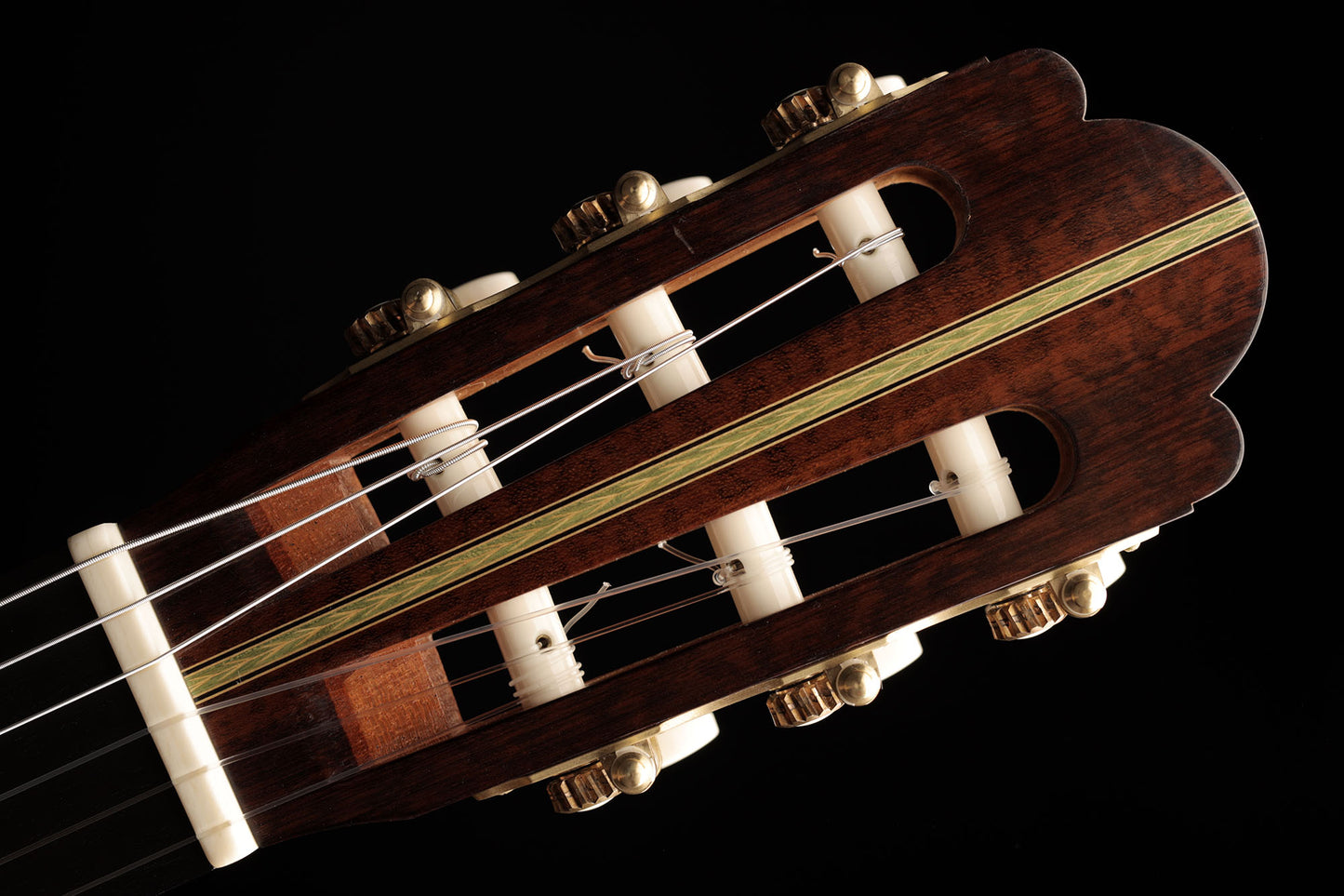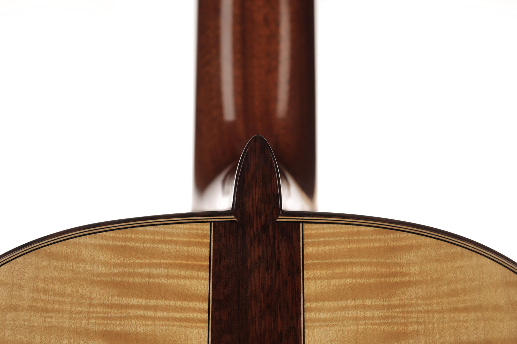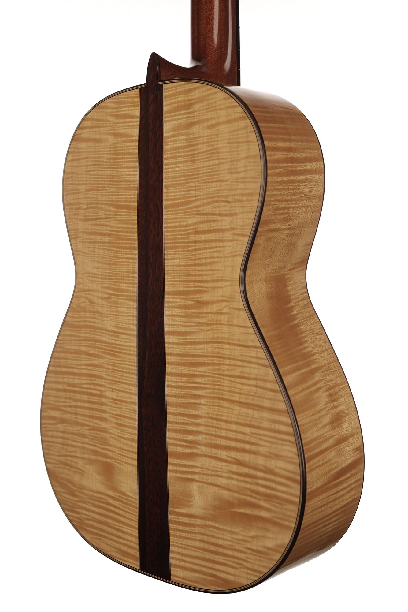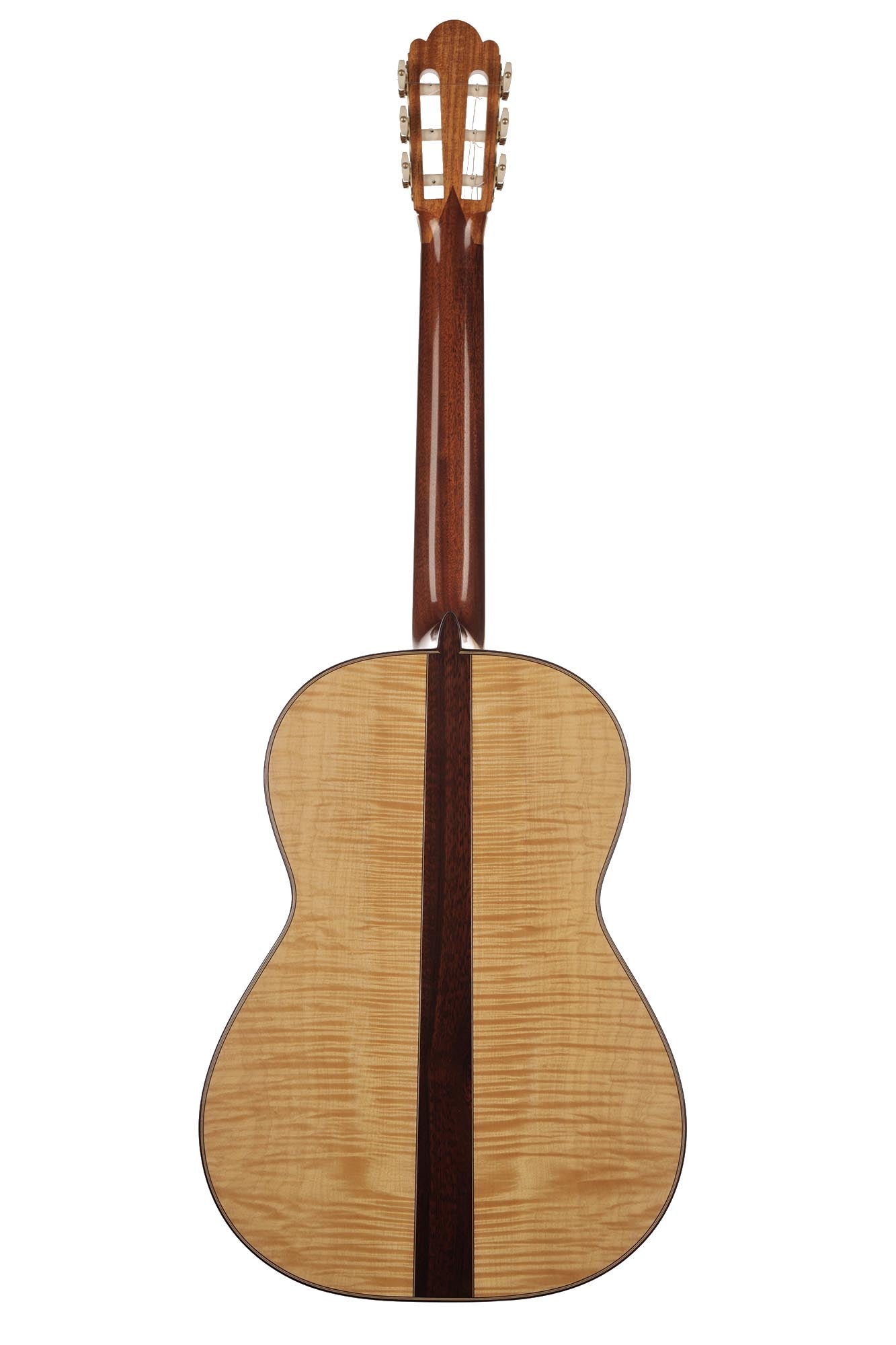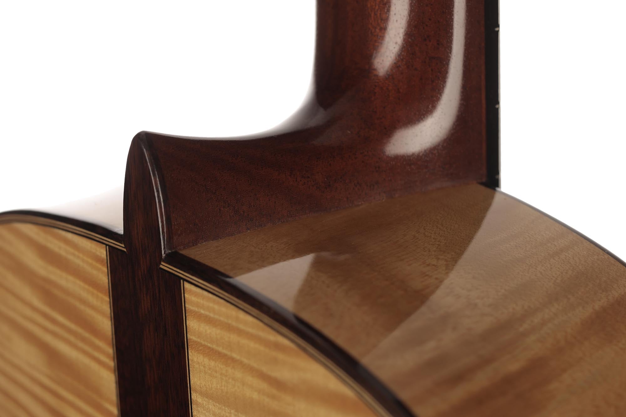 What a gorgeous guitar. It is a striking evidence of Fritz Ober's deep understanding of the instruments of Antonio de Torres as well as of his own artistic and aesthetic genius. Indeed, there are many construction details in this instrument that are reminiscent of the two masters. These combine with the unmistakable taste of Fritz Ober, symbolized for example by the 3-piece maple and snakewood back. The contrasts of shapes and colours make this instrument particularly captivating. For example, Fritz Ober chose two slightly different coloured woods for the neck and the head, underlining the geometric beauty of the "V"-shaped headjoint and proving once again the perfection of his work.
