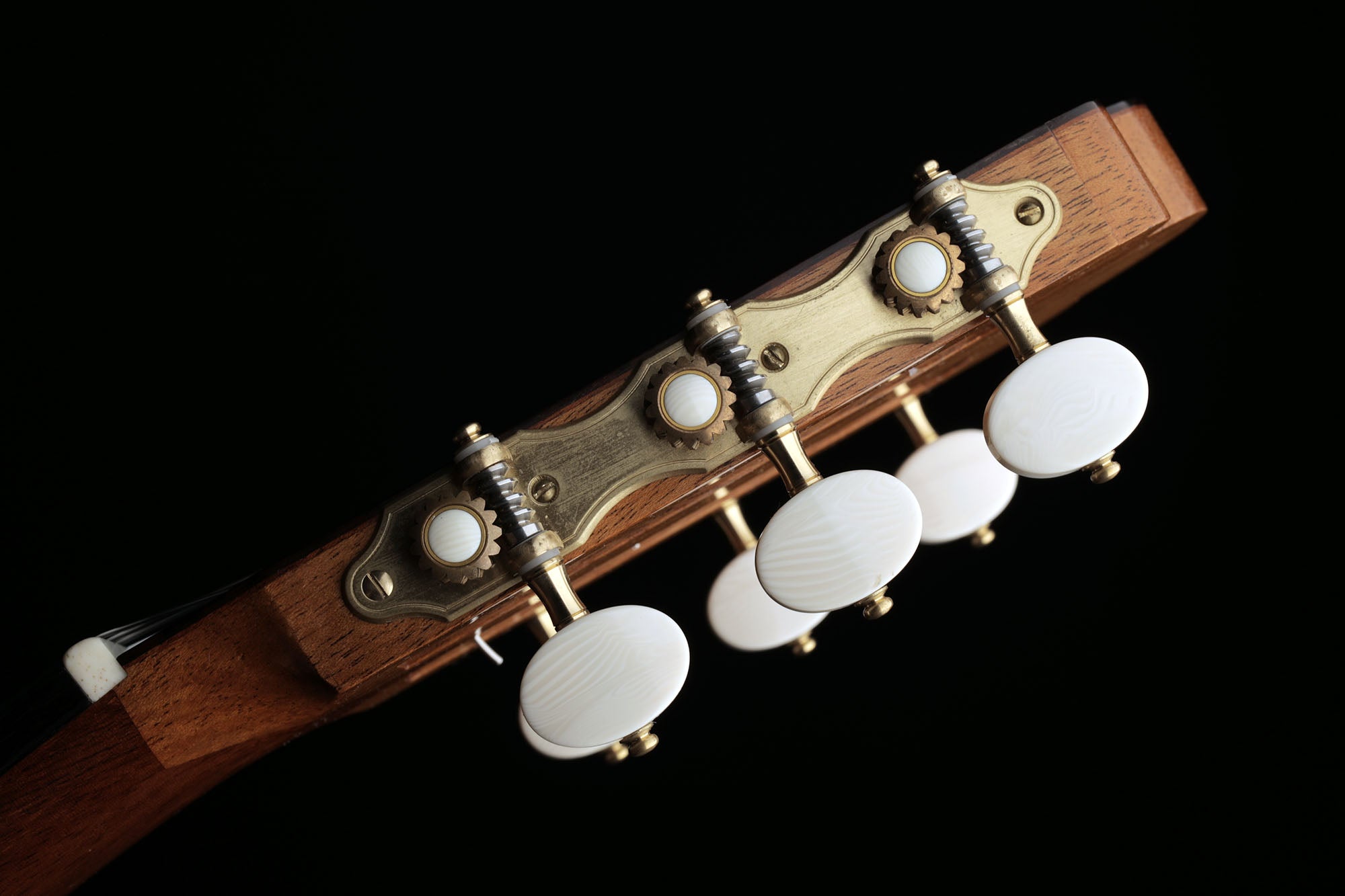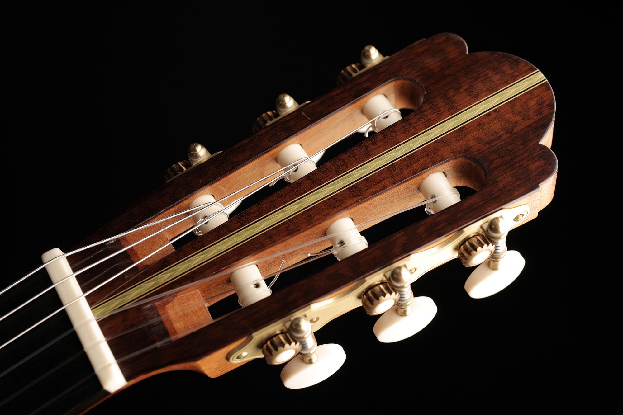 This guitar is in very good condition, without cracks and has only few traces of playing. A mother-of-pearl inlay has been inserted at the lower end of the sides, where an end pin was previously located. The tuners are handmade by the Italian manufacturer Nicoló Alessi.