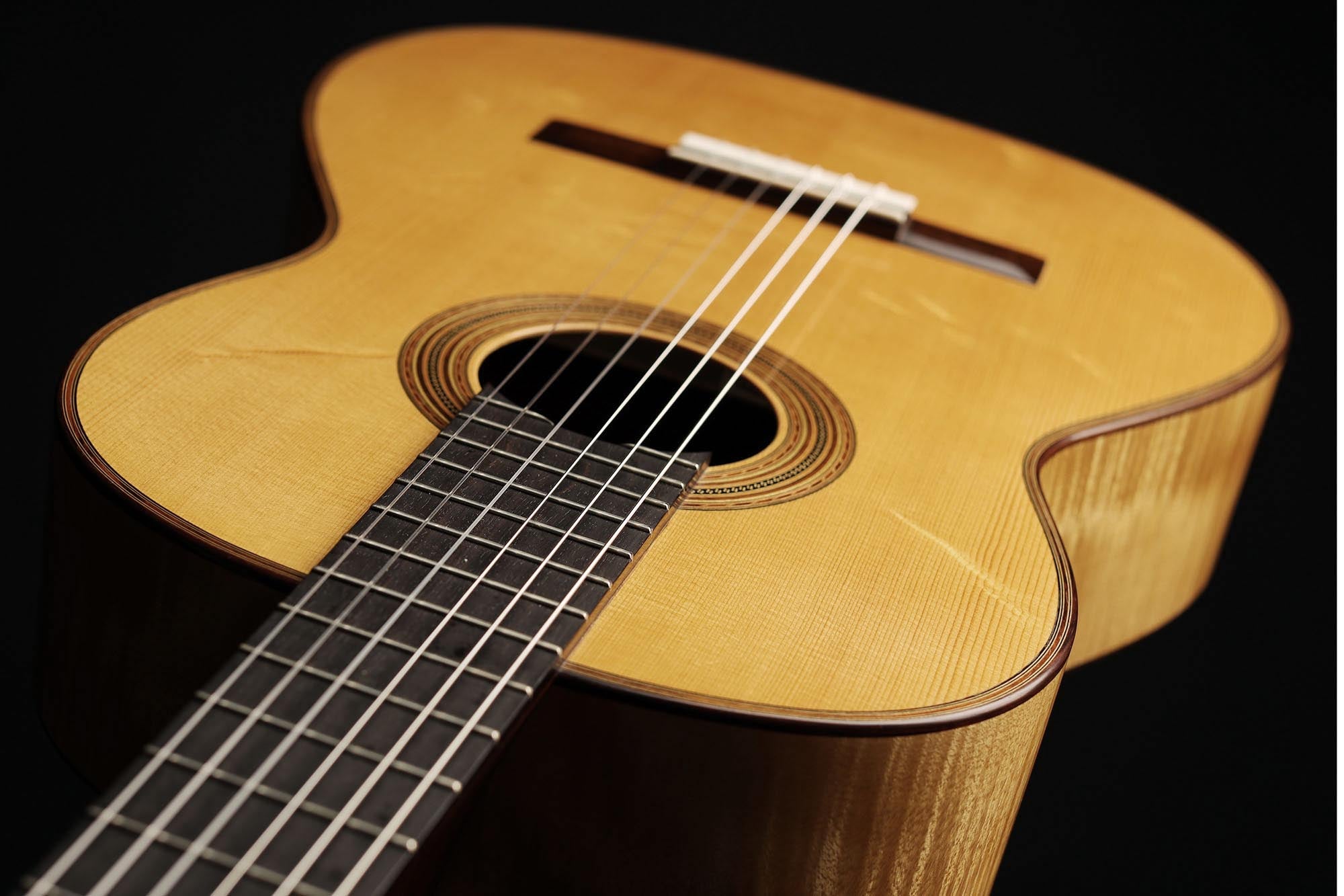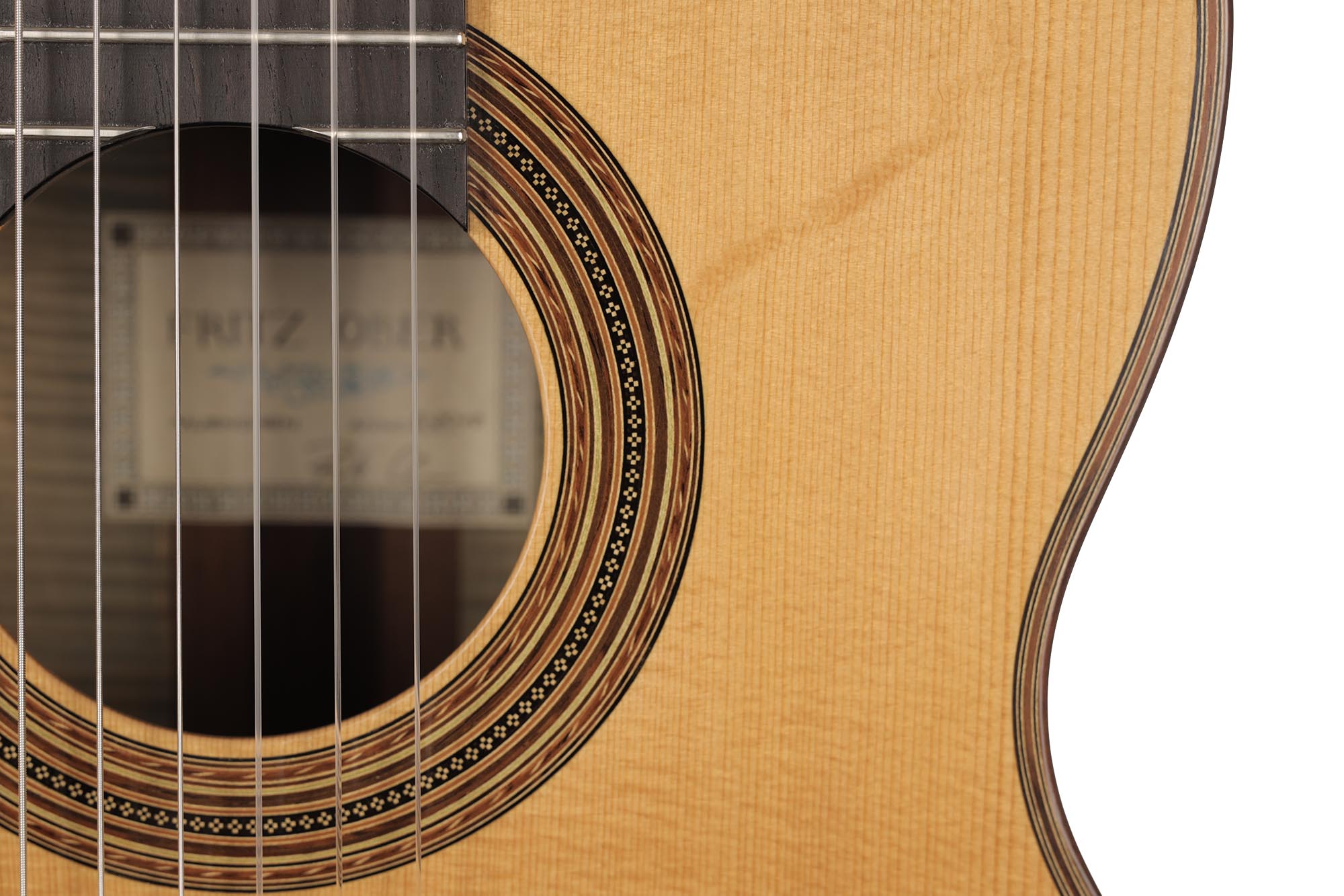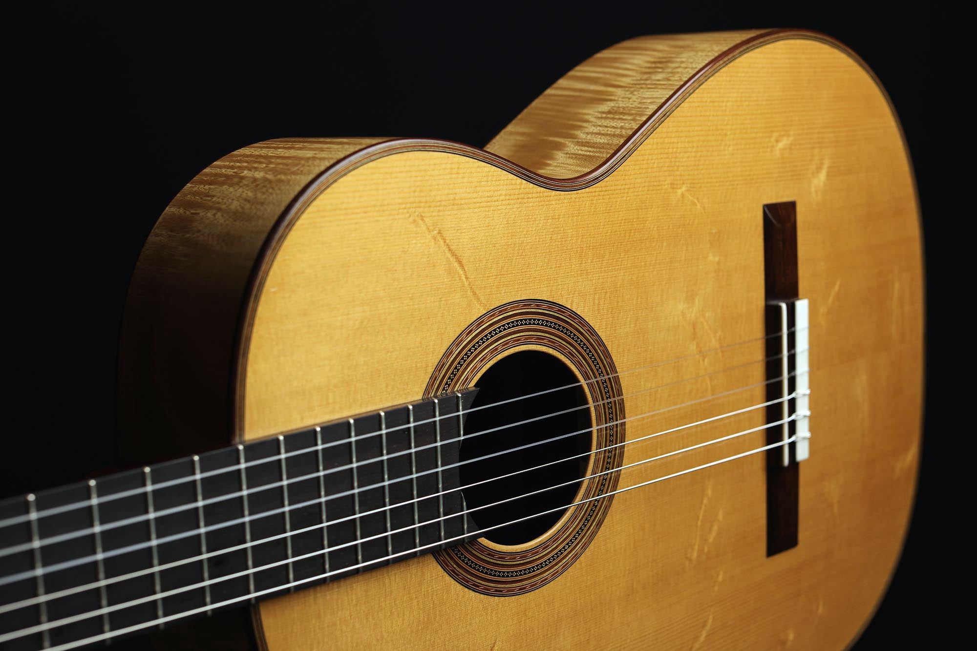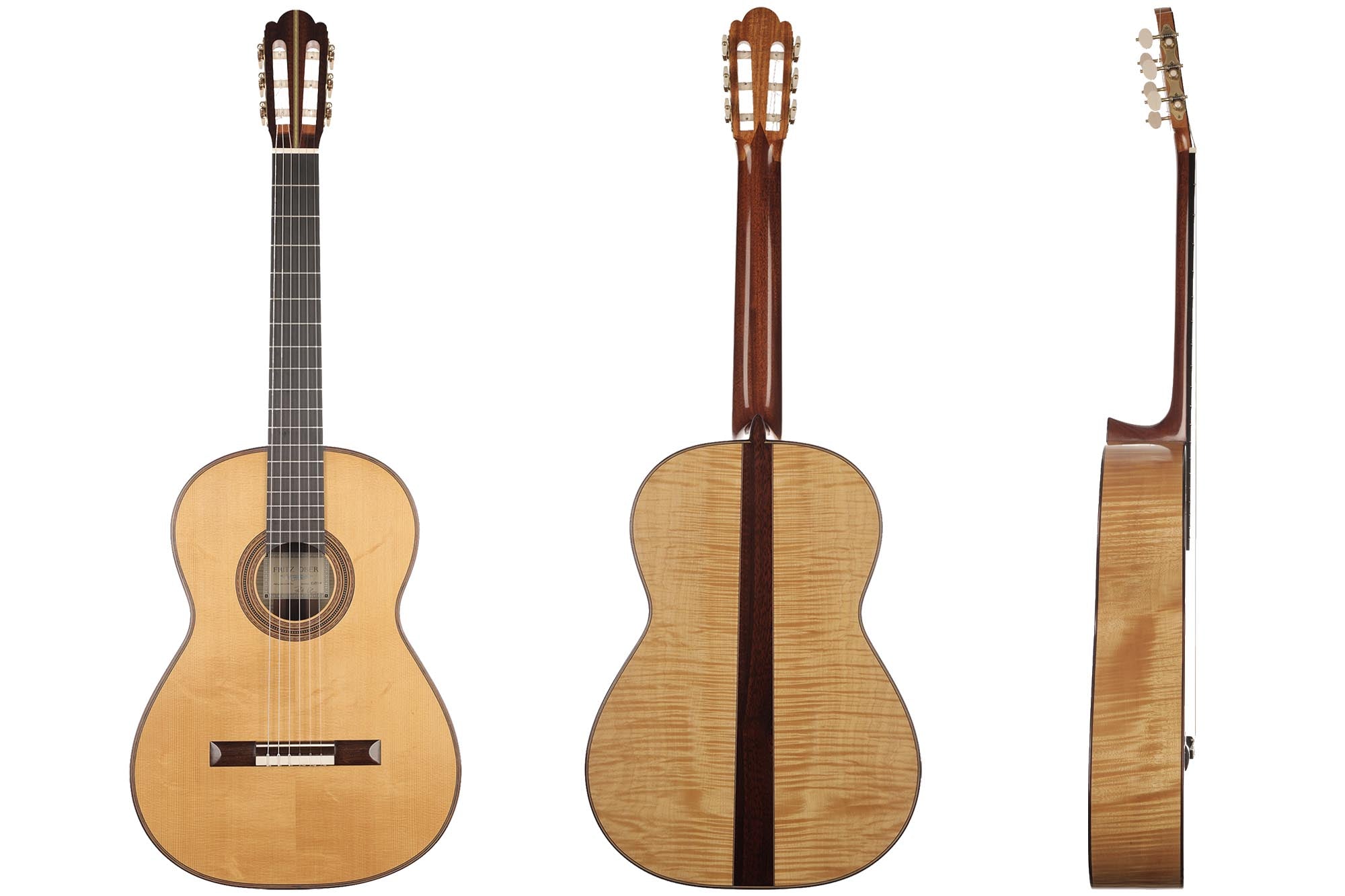 The beauty of this instrument is reflected in the elegance of its timbre. It is very light and has a spontaneous tone which shows the characteristic sound-colour of the maple used for the back and sides. The top made of German spruce responds very well, and the last ten years of playing have given this guitar a powerful and colourful voice. It really combines everything you would expect from a traditional guitar in the style of Antonio de Torres, and is one of the most beautiful Fritz Ober guitars we have experienced in recent years.