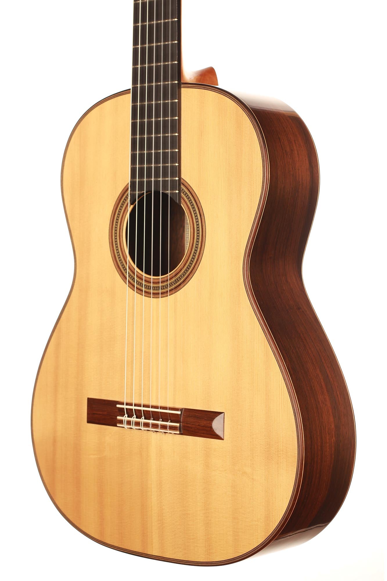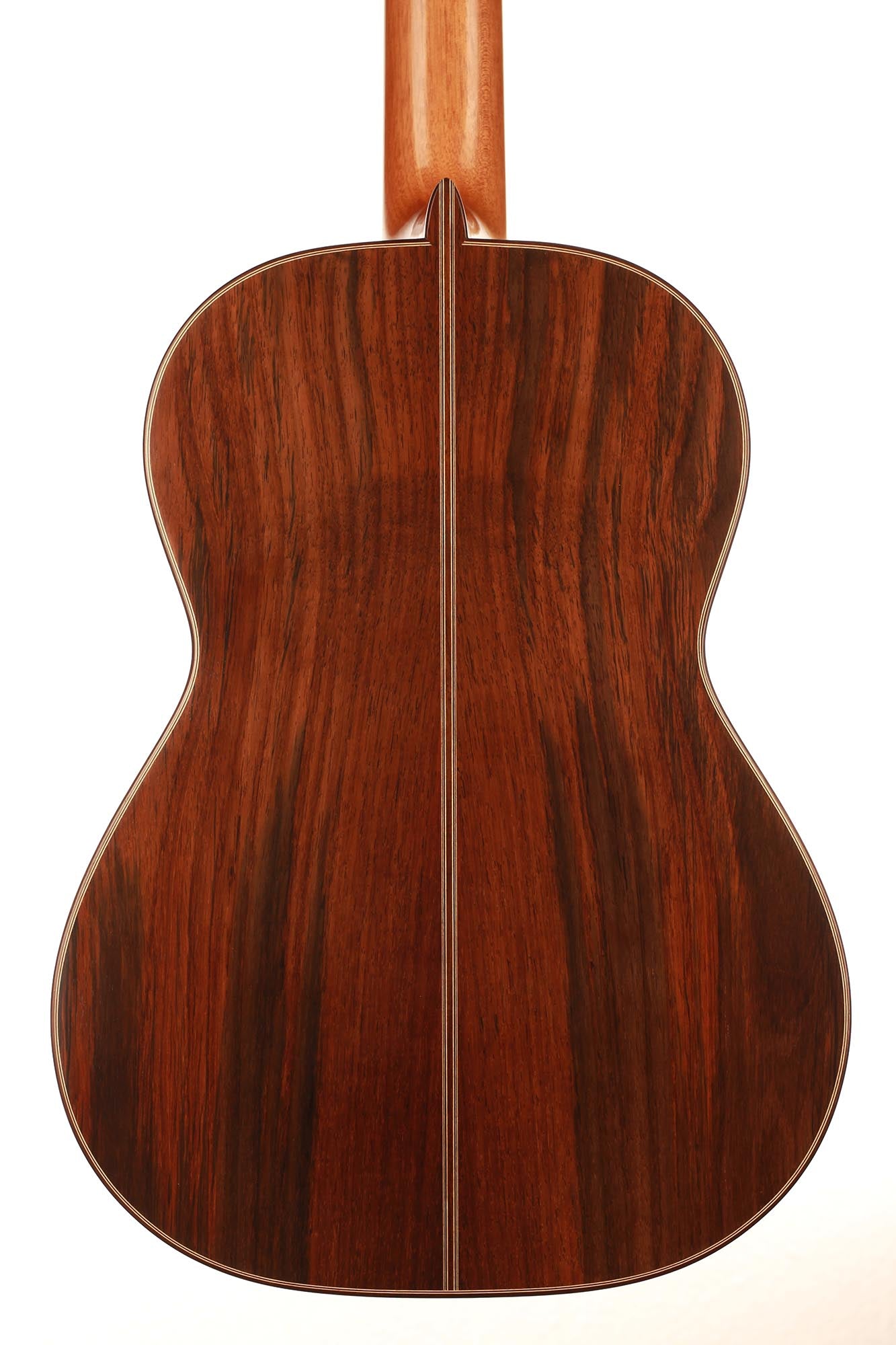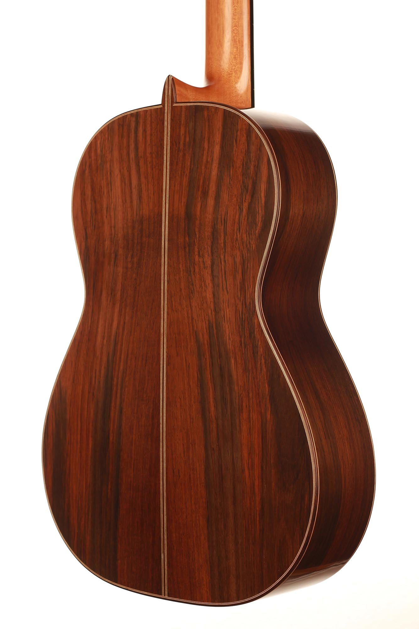 The timeless design of this elegant A. de Torres inspired model sums up perfectly the qualities of the Spanish classical guitar at its best. Fluid lines and slightly smaller body-size are this model’s signature. This guitar has an exceptional set of CITES-certified Brazilian rosewood as well as the finest engraved Scheller tuners. Moreover, this light-weighted instrument has a beautiful low E body air-resonance frequency. Such a deep voice instantly carries away the guitarist in a sound dimension that one usually almost only finds with century old original instruments.