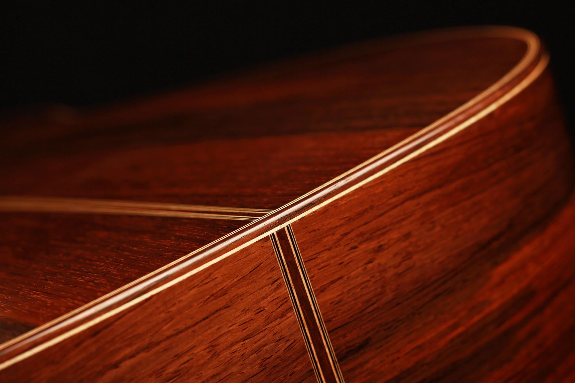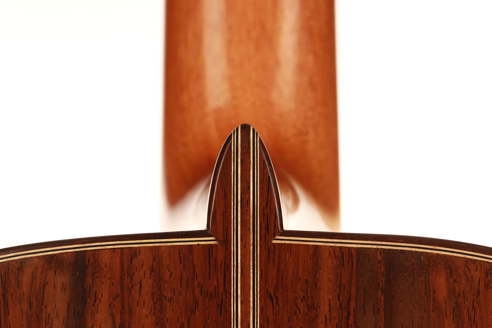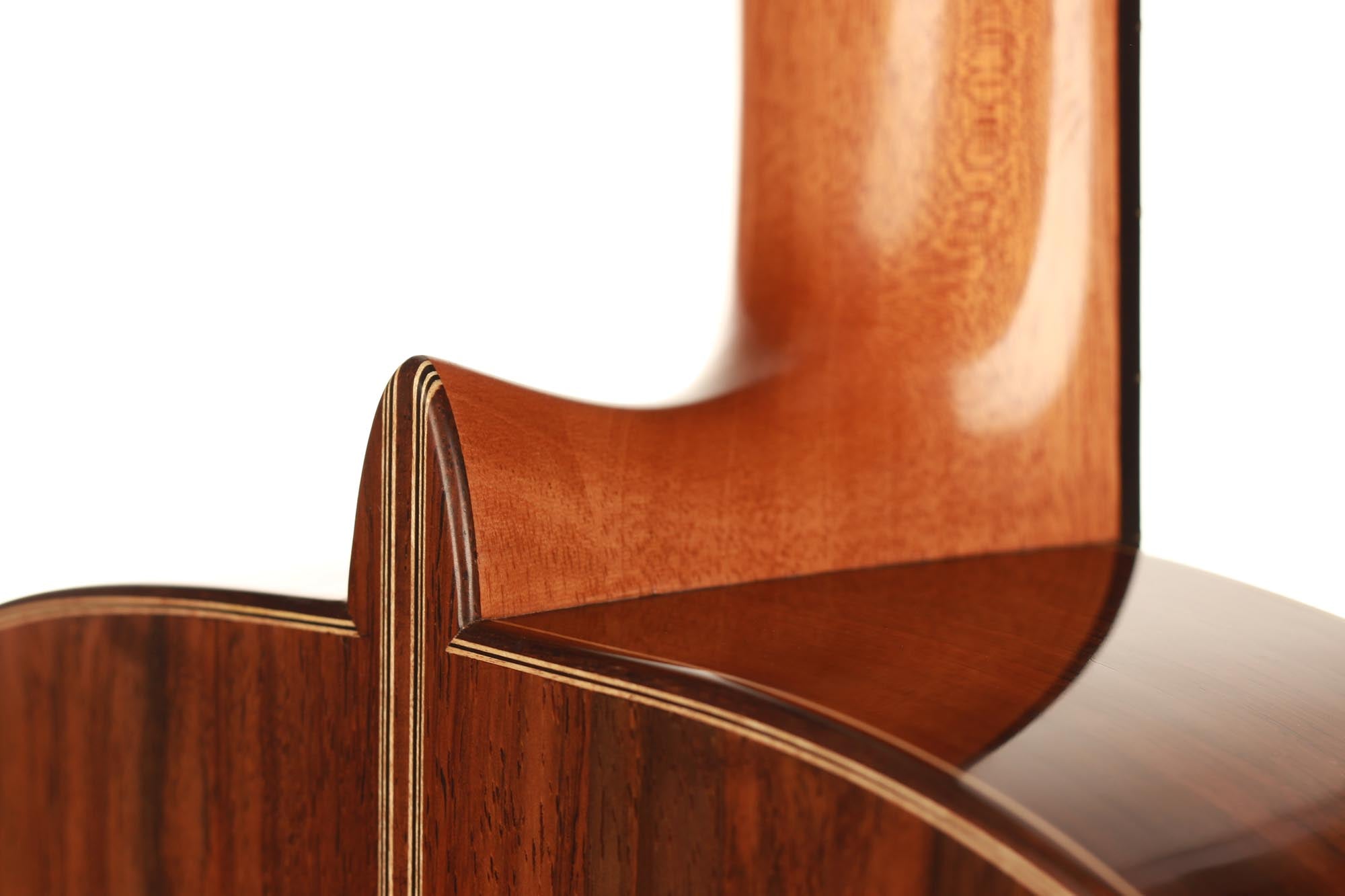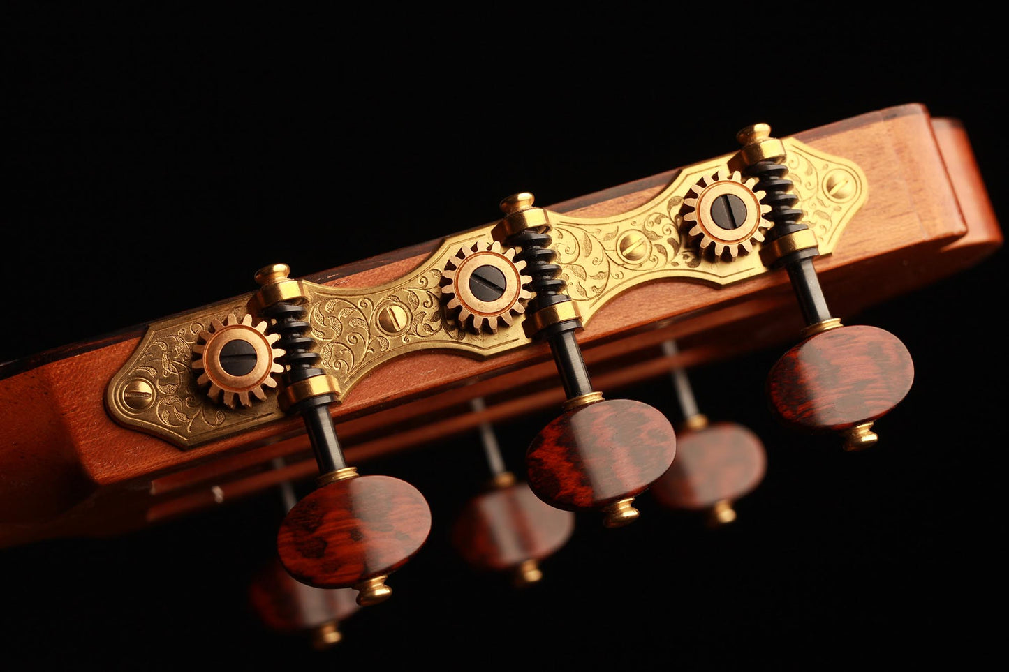 The timeless design of this elegant A. de Torres inspired model sums up perfectly the qualities of the Spanish classical guitar at its best. Fluid lines and slightly smaller body-size are this model’s signature. This guitar has an exceptional set of CITES-certified Brazilian rosewood as well as the finest engraved Scheller tuners. Moreover, this light-weighted instrument has a beautiful low E body air-resonance frequency. Such a deep voice instantly carries away the guitarist in a sound dimension that one usually almost only finds with century old original instruments.