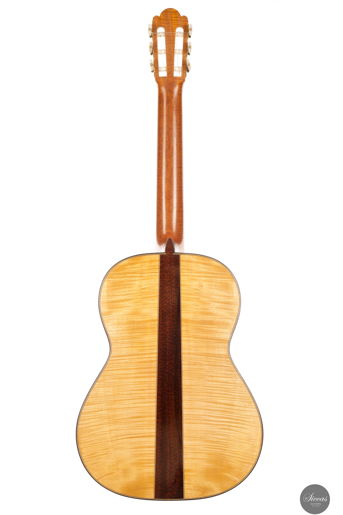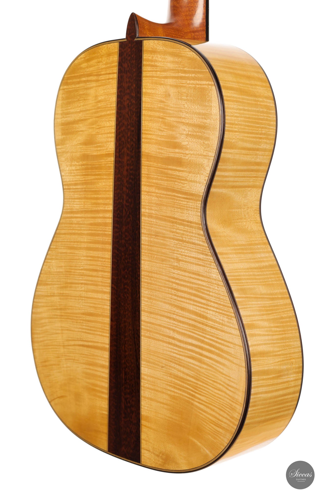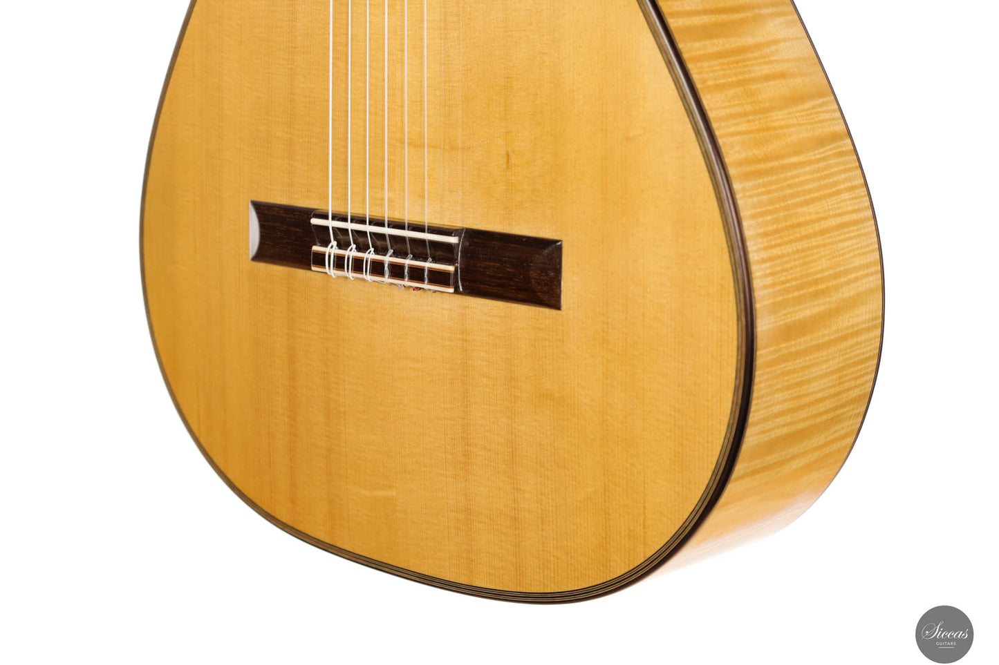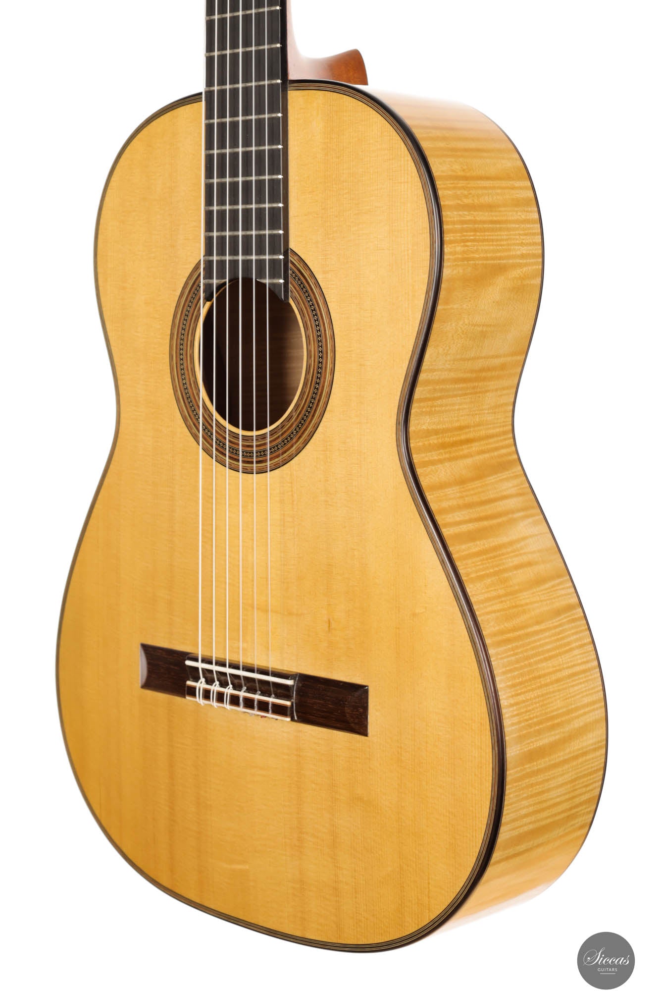 The 2016 Fritz Ober guitar is an exemplar of exquisite luthiery, a testament to the heights of craftsmanship in the world of classical guitars. This instrument, maintained in an impeccable condition, is as visually stunning as it is sonically enchanting. Its back, crafted from flamed Maple, is not just a visual delight but also plays a significant role in the guitar's tonal richness, adding depth and character to its sound. The guitar's air resonance ranges harmoniously between F to F#, a quality derived from its traditional seven fan bracing. This meticulous structural design orchestrates a spectrum of sounds, from the deep, elegant basses to the trebles that resonate with a singing sweetness. The rounded tone of this guitar, alongside its diverse sound-color possibilities, offers musicians a unique opportunity to explore an array of musical landscapes, making it a truly versatile instrument.