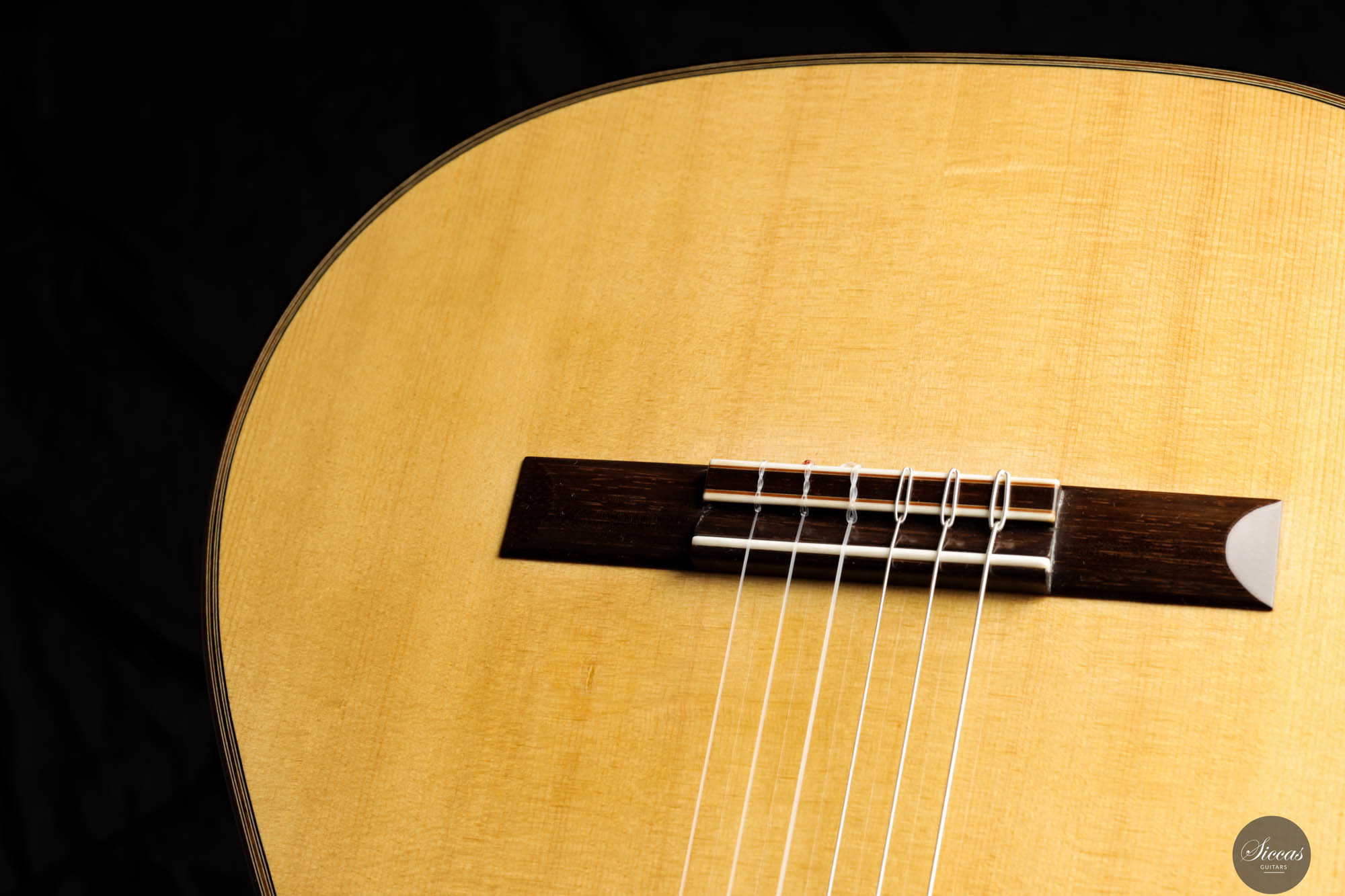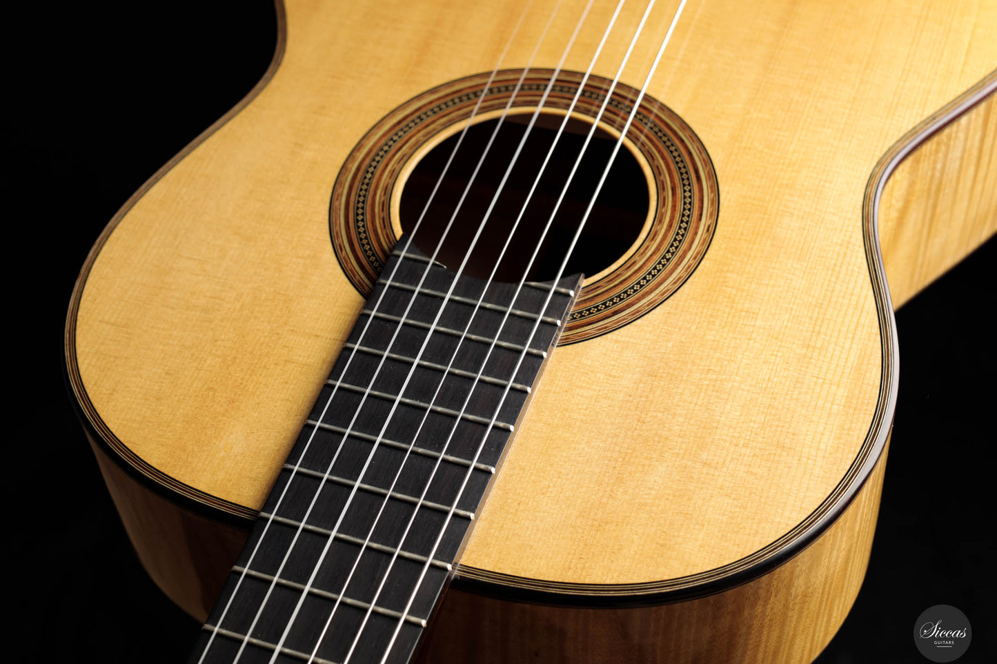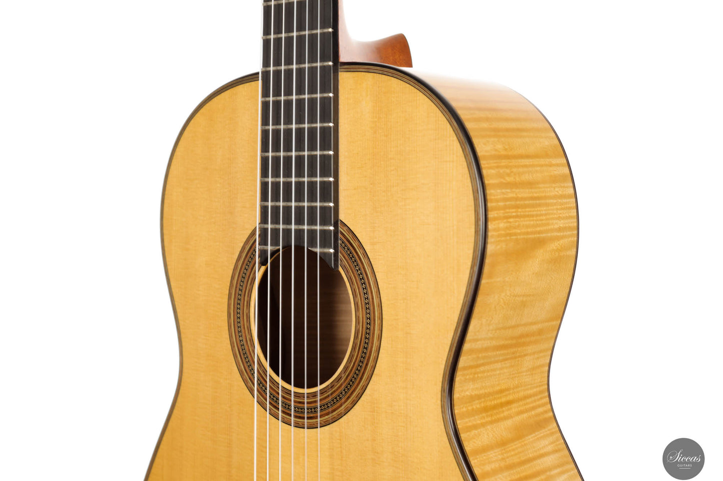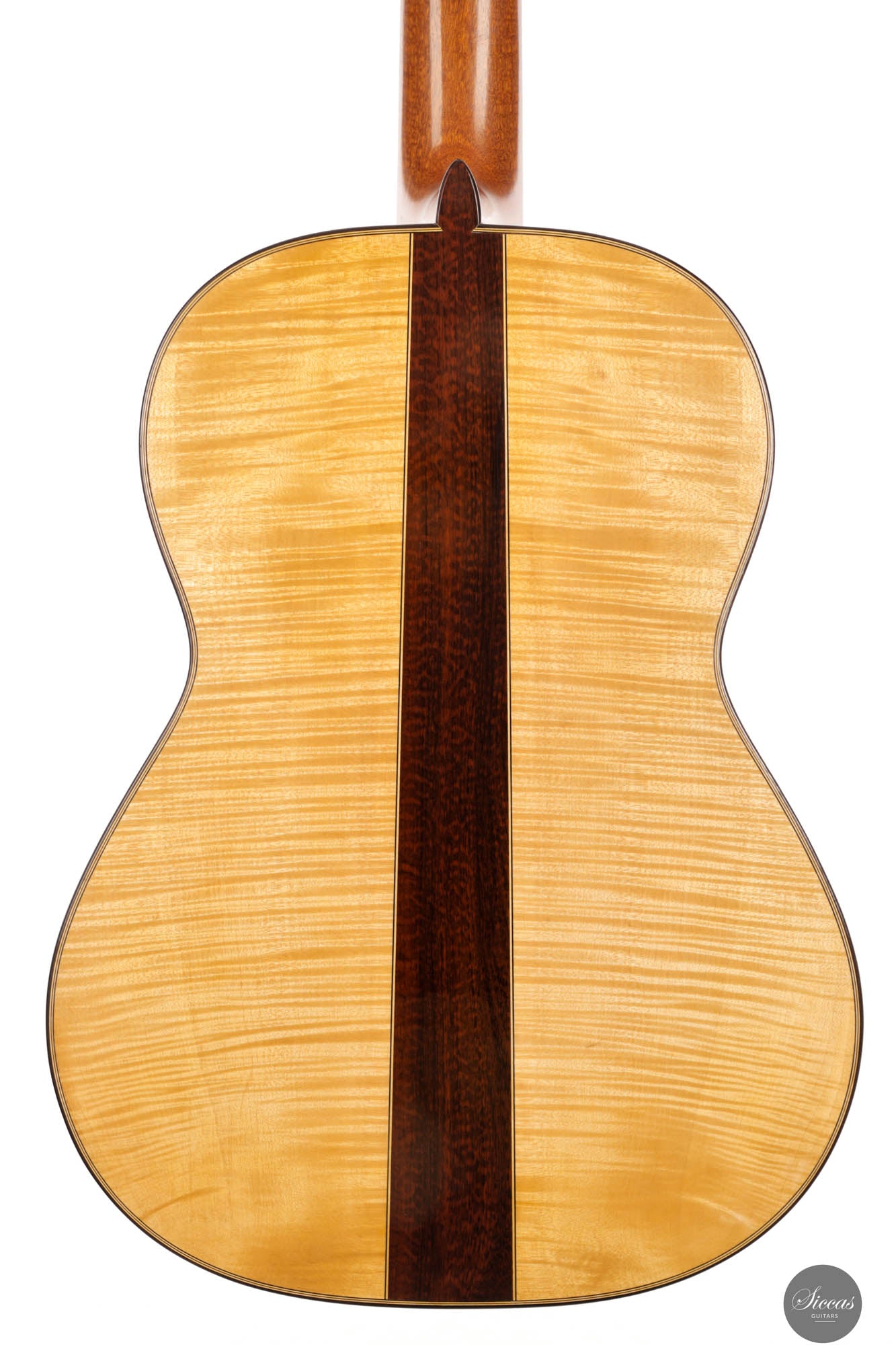 The 2016 Fritz Ober guitar is an exemplar of exquisite luthiery, a testament to the heights of craftsmanship in the world of classical guitars. This instrument, maintained in an impeccable condition, is as visually stunning as it is sonically enchanting. Its back, crafted from flamed Maple, is not just a visual delight but also plays a significant role in the guitar's tonal richness, adding depth and character to its sound. The guitar's air resonance ranges harmoniously between F to F#, a quality derived from its traditional seven fan bracing. This meticulous structural design orchestrates a spectrum of sounds, from the deep, elegant basses to the trebles that resonate with a singing sweetness. The rounded tone of this guitar, alongside its diverse sound-color possibilities, offers musicians a unique opportunity to explore an array of musical landscapes, making it a truly versatile instrument.