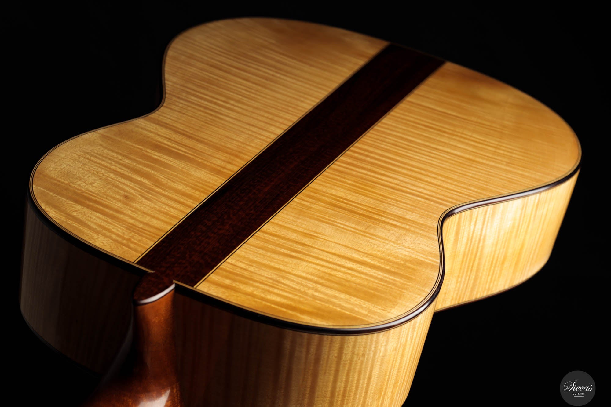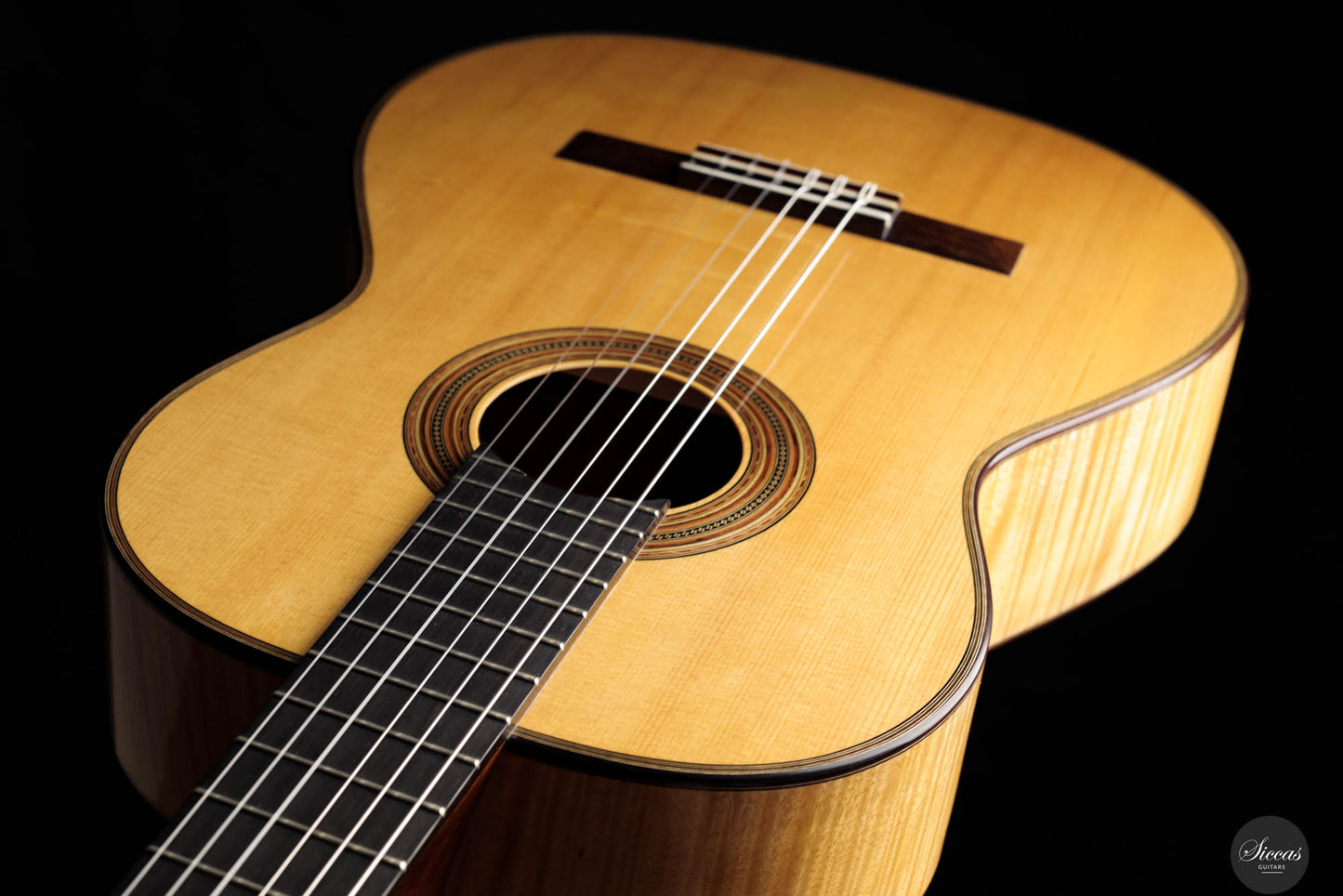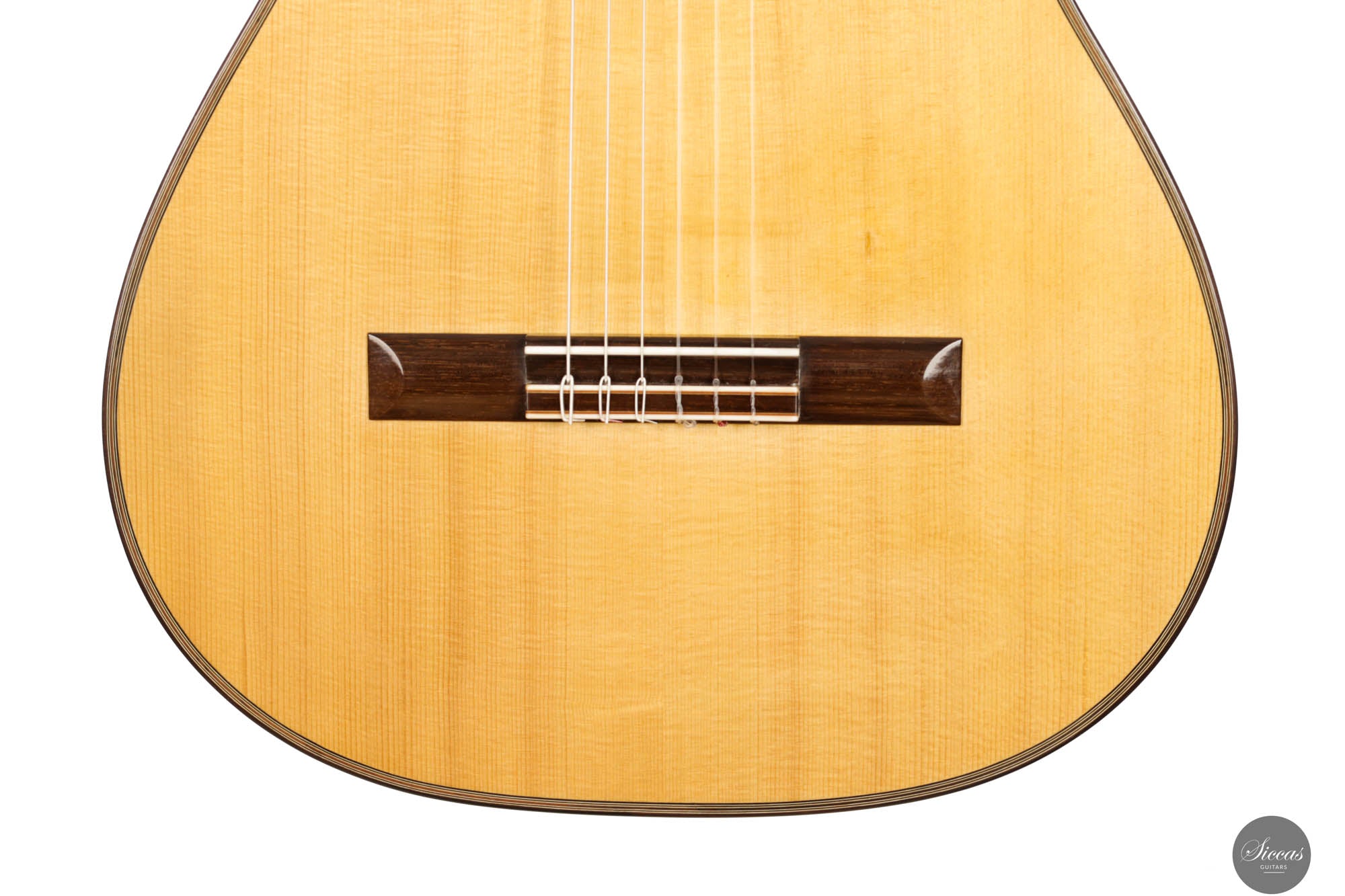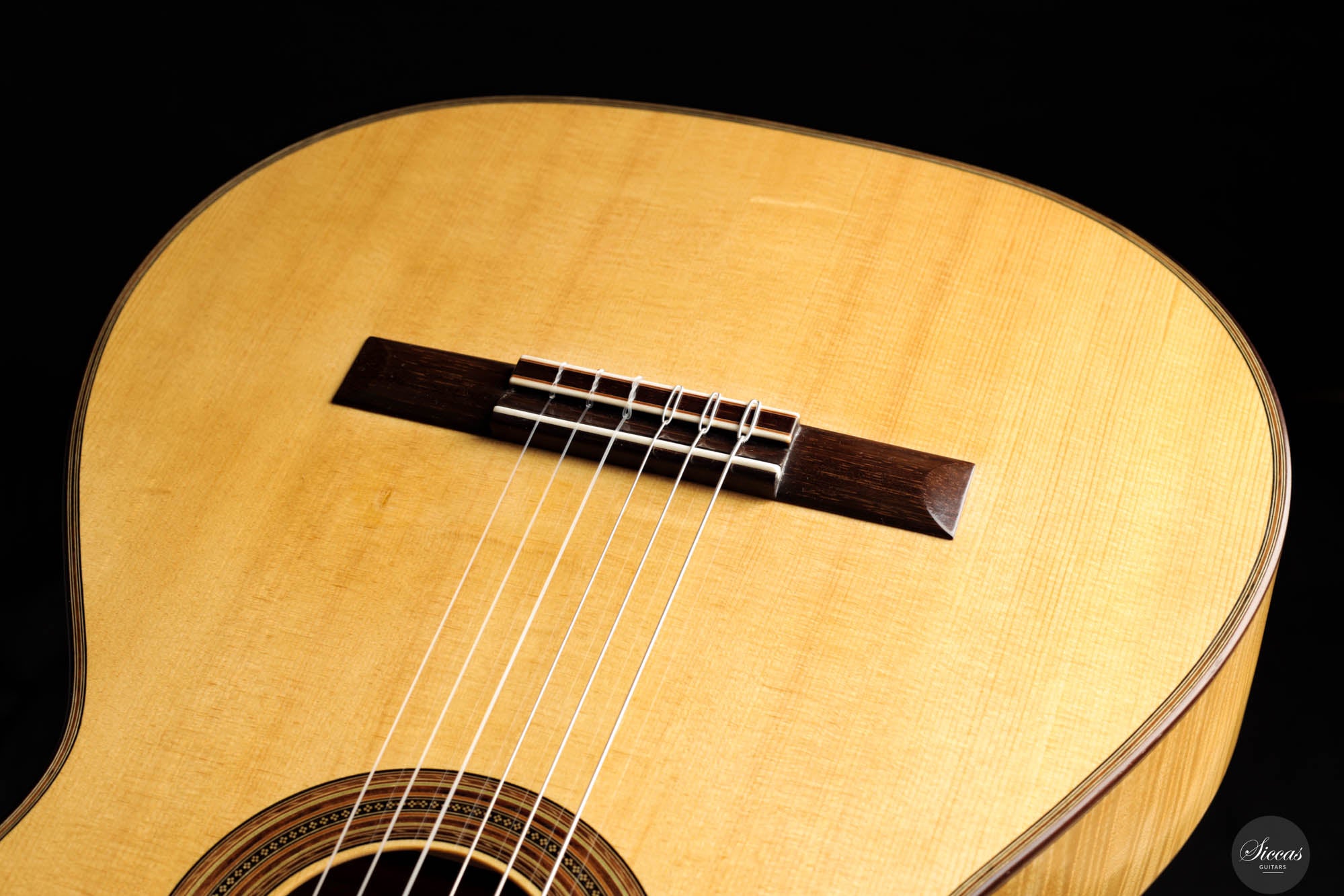The 2016 Fritz Ober guitar is an exemplar of exquisite luthiery, a testament to the heights of craftsmanship in the world of classical guitars. This instrument, maintained in an impeccable condition, is as visually stunning as it is sonically enchanting. Its back, crafted from flamed Maple, is not just a visual delight but also plays a significant role in the guitar's tonal richness, adding depth and character to its sound. The guitar's air resonance ranges harmoniously between F to F#, a quality derived from its traditional seven fan bracing. This meticulous structural design orchestrates a spectrum of sounds, from the deep, elegant basses to the trebles that resonate with a singing sweetness. The rounded tone of this guitar, alongside its diverse sound-color possibilities, offers musicians a unique opportunity to explore an array of musical landscapes, making it a truly versatile instrument.