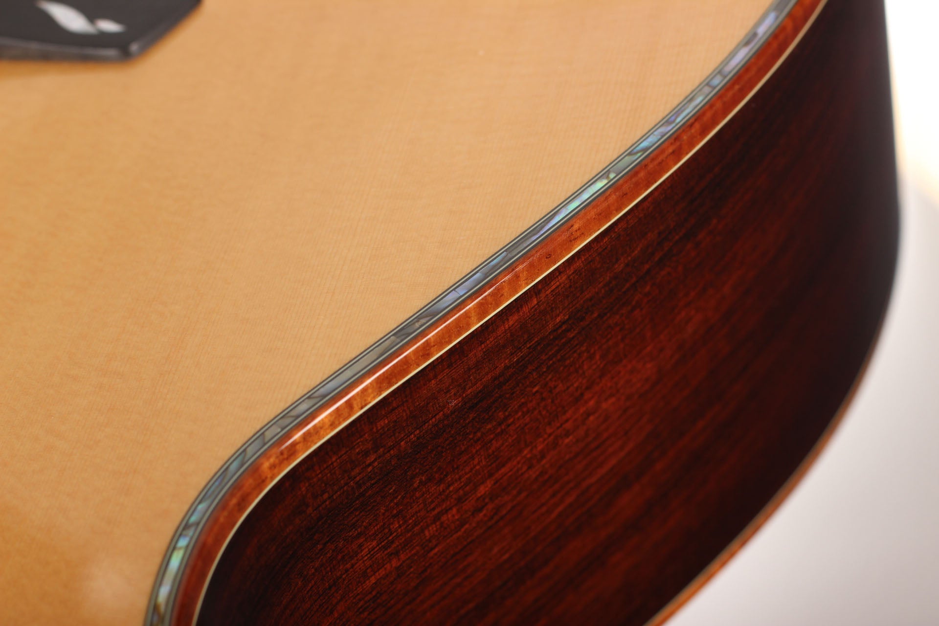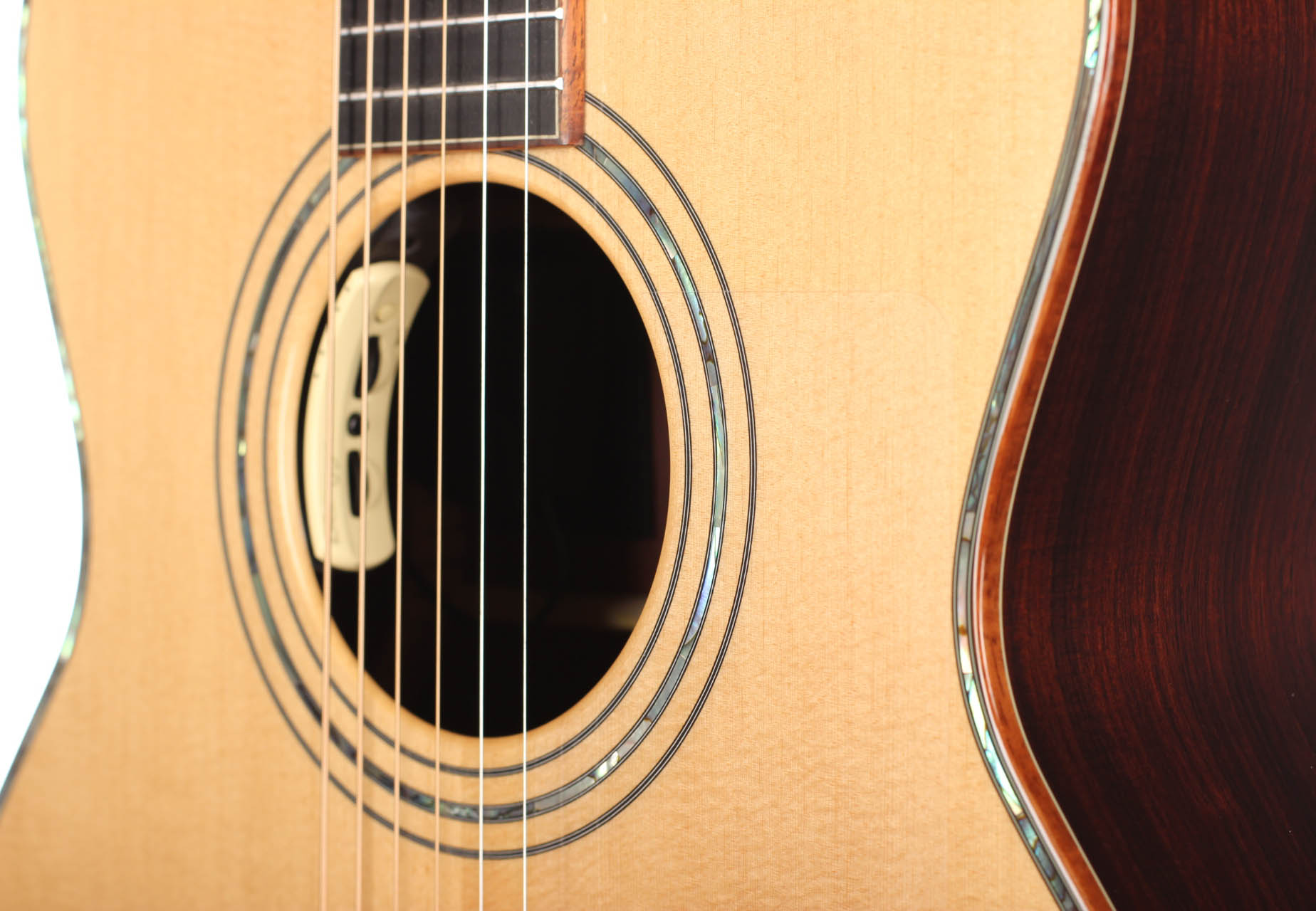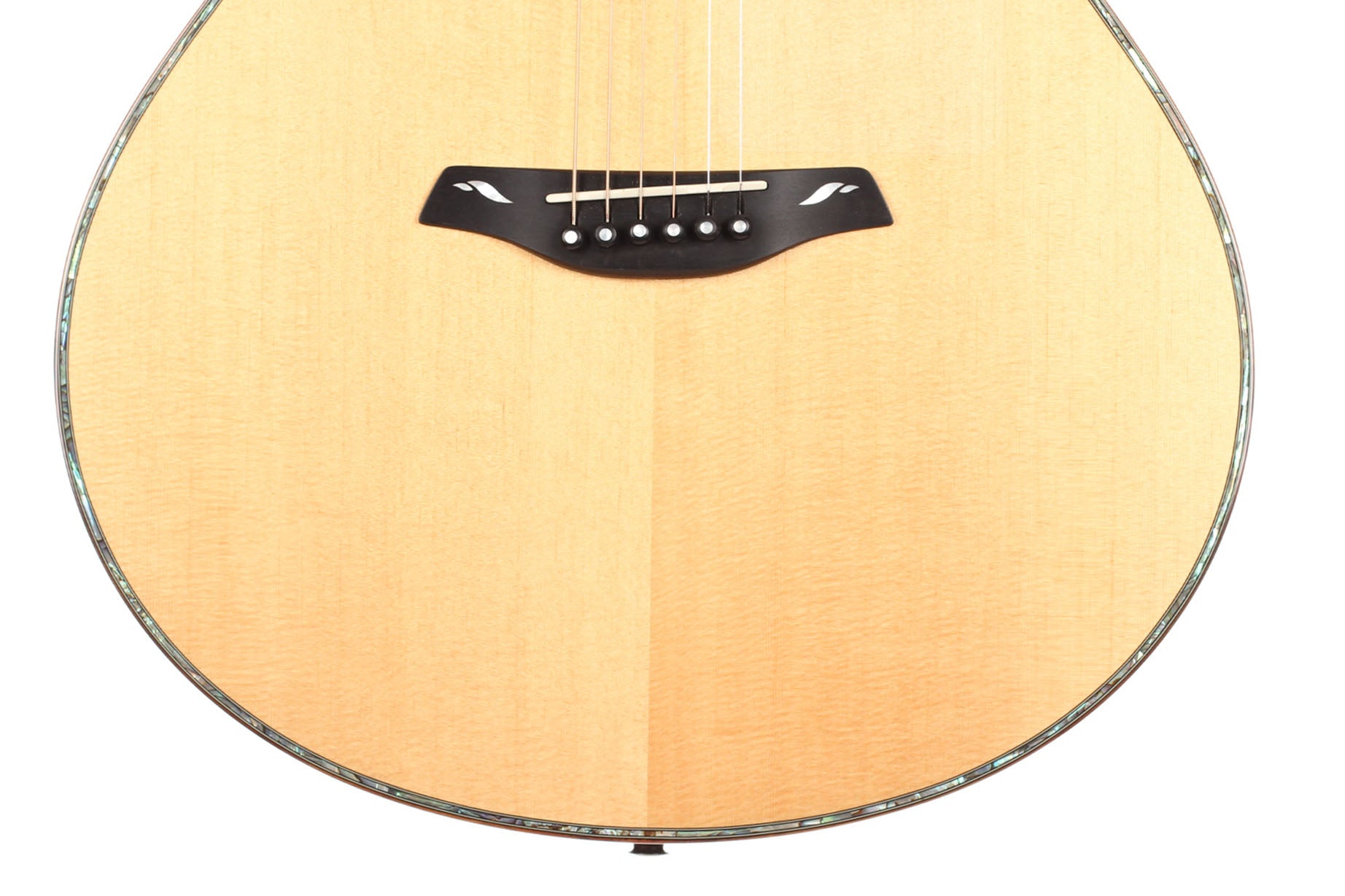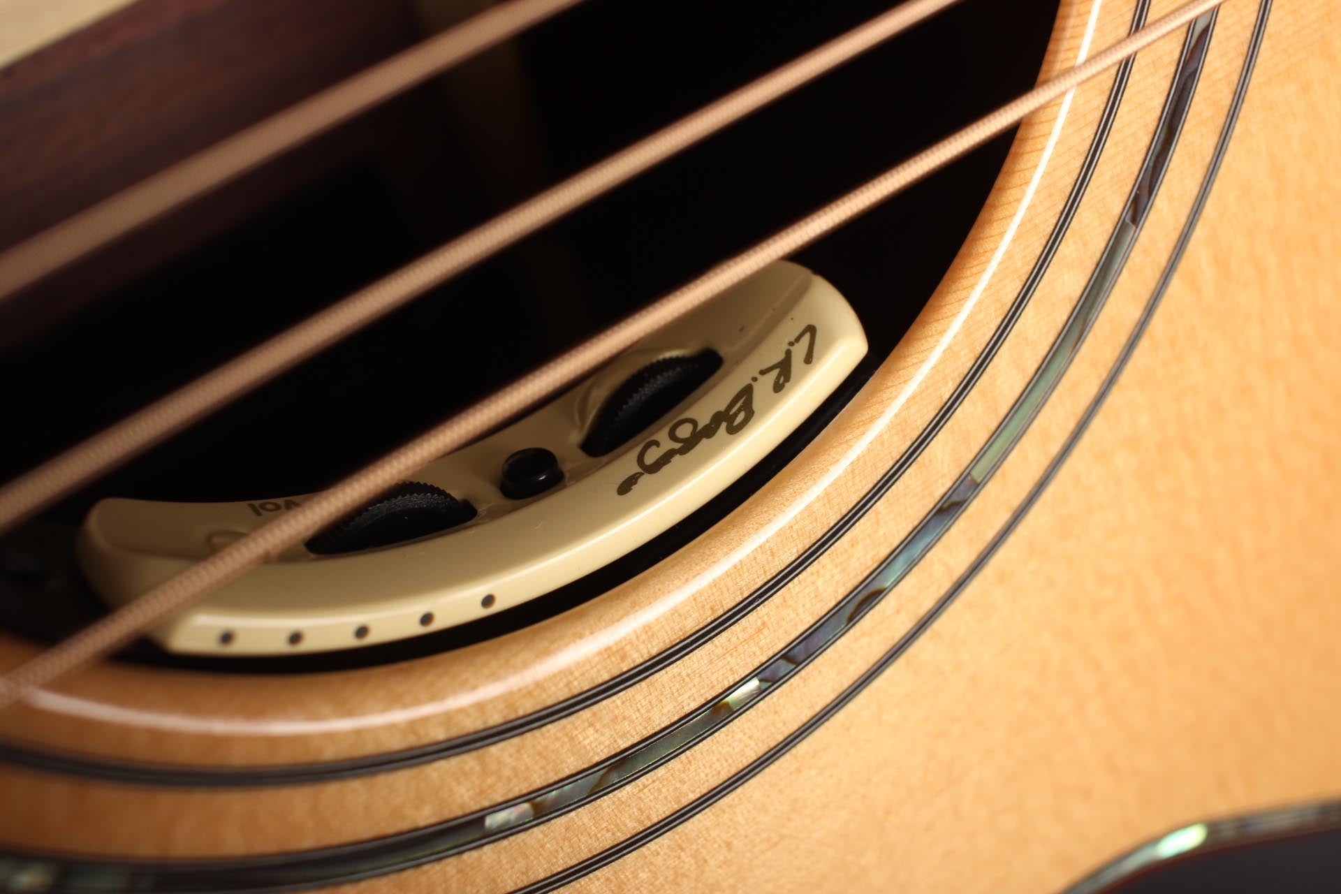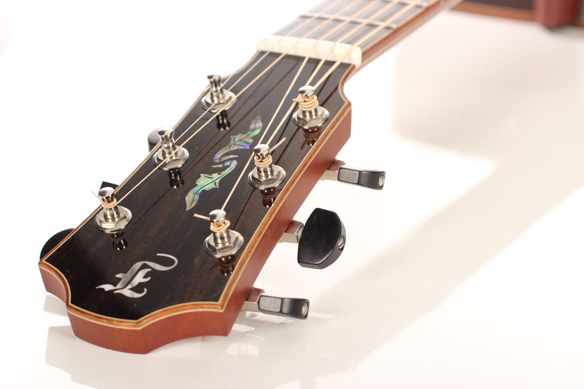 Furch Guitars is a Czech guitar manufacturer founded in 1981 by Frantisek Furch. Furch began to make his own instruments as he had no access to quality ones. Starting under Czechoslovakian socialist rule, he originally hid his craft from officials. As restrictions eased in 1987, his instruments became available publicly. Furch guitars have an excellent reputation and are also played by great artists such as Suzanne Vega. This G25SR is a Grand Auditorium from 2016 and in pristine condition. The top is made of fine Sitka Spruce and back and sides are made of Indian Rosewood. The beautiful inlaid work on fingerboard, headstock, and bridge are particularly striking. The sound is very direct with crisp trebles and “woody” mids and basses which unite into a powerful sound when strummed. The guitar is marvelously adjusted and is also easy to play on the higher frets. The thick neck profile and the taut stringing invite to strong and expressive playing, but the guitar responds directly to soft picking as well and gives a long sustain. The L.R. Baggs Anthem pickup provides a beautifully natural sound on stage. An original Hiscox case is included.