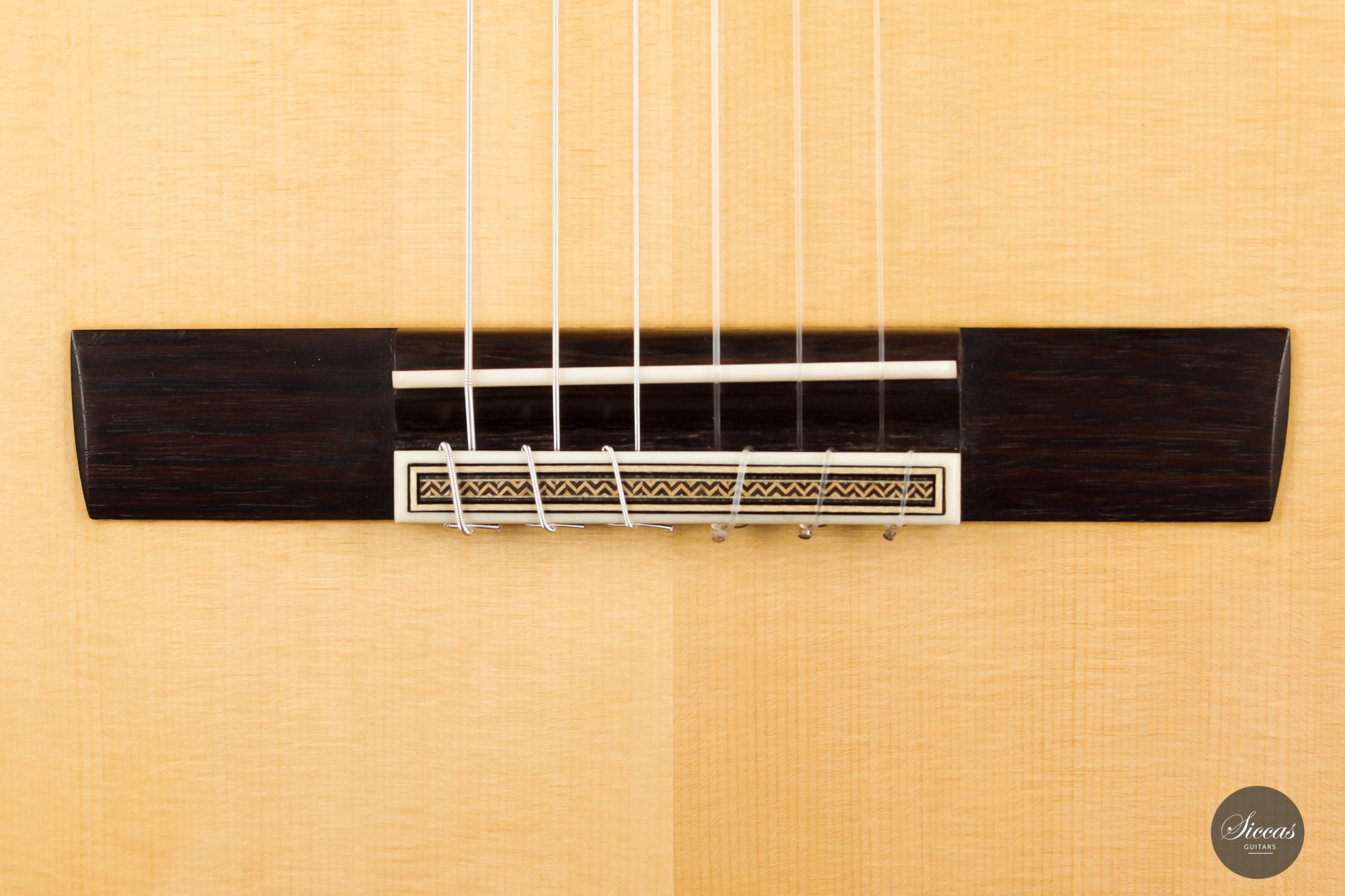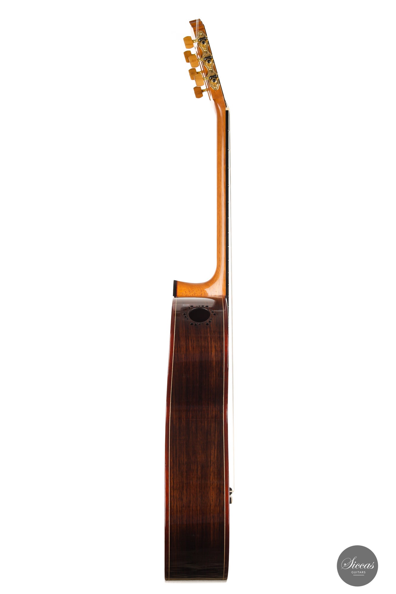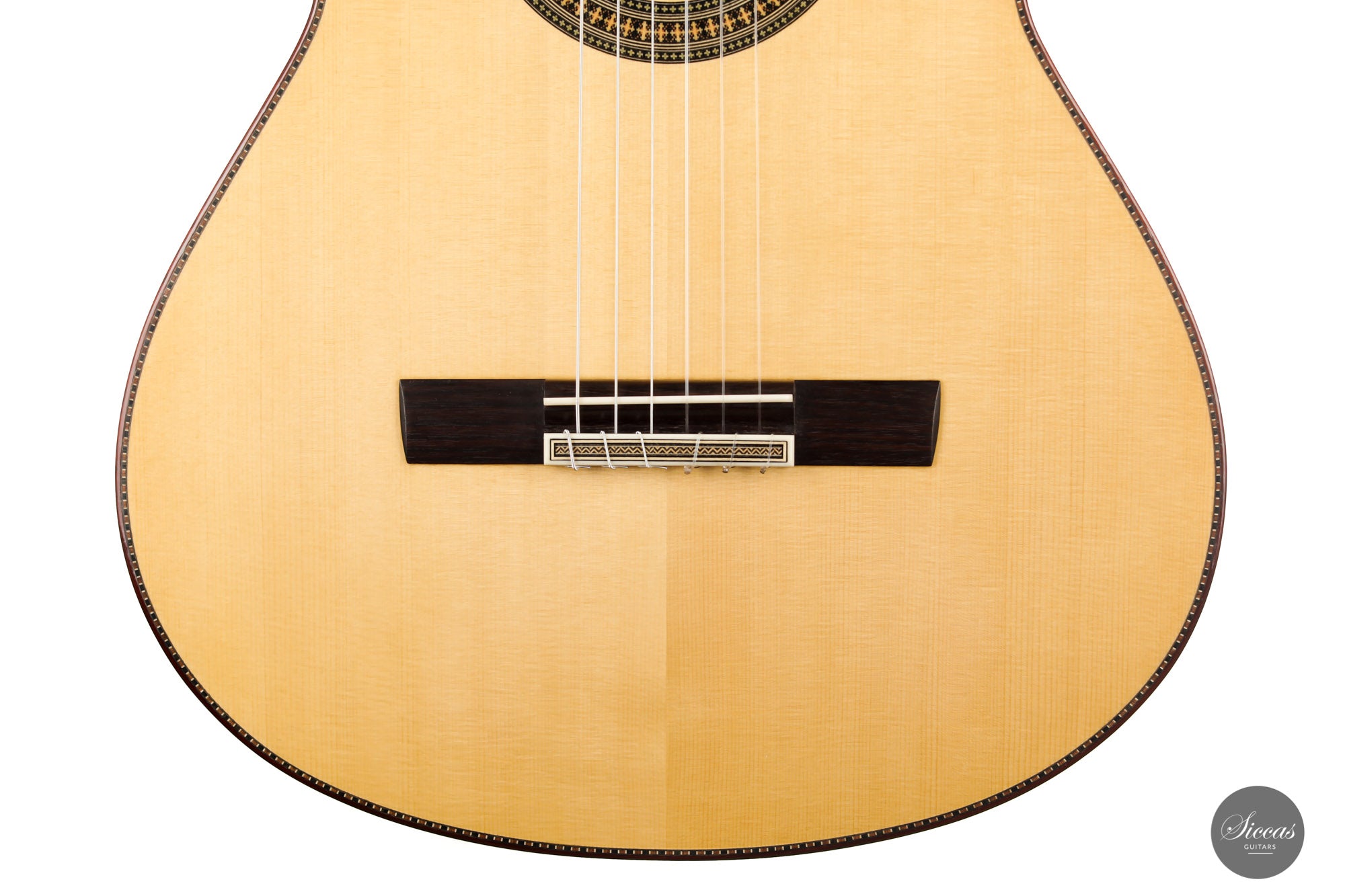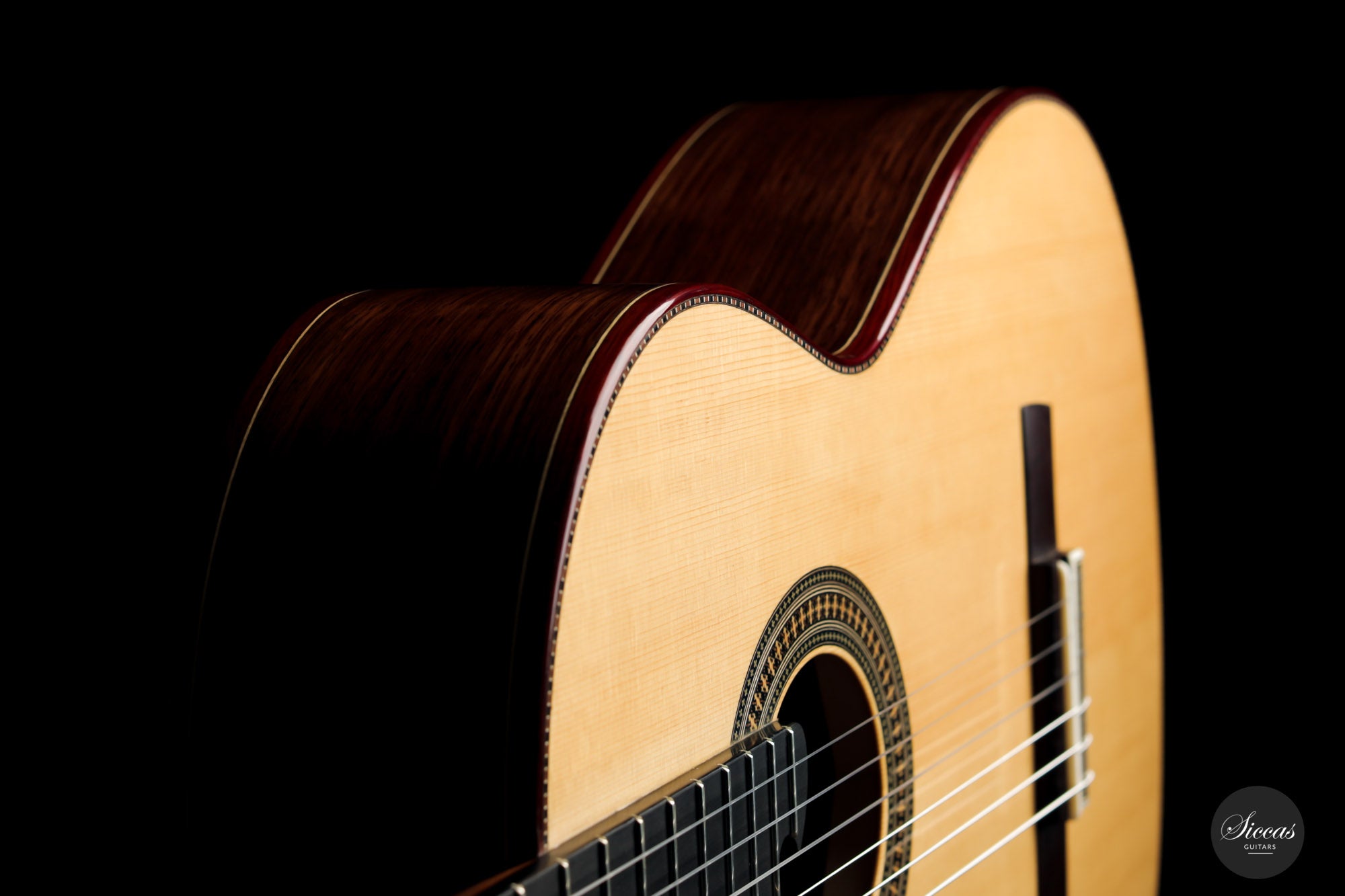 What an impressive volume for a traditionally built fan-braced guitar. The tone production feels similar to that of a grand piano, and each note develops with clarity, volume, and confidence. The voicing is very easy to define, and excellent tone separation combined with a reliable, well-balanced tone offers fantastic intelligibility in the polyphony. Finally, the future owner of this charming instrument will enjoy a top-notch left-hand comfort and refined chamber music playing experience thanks to the extra sound port on the side.