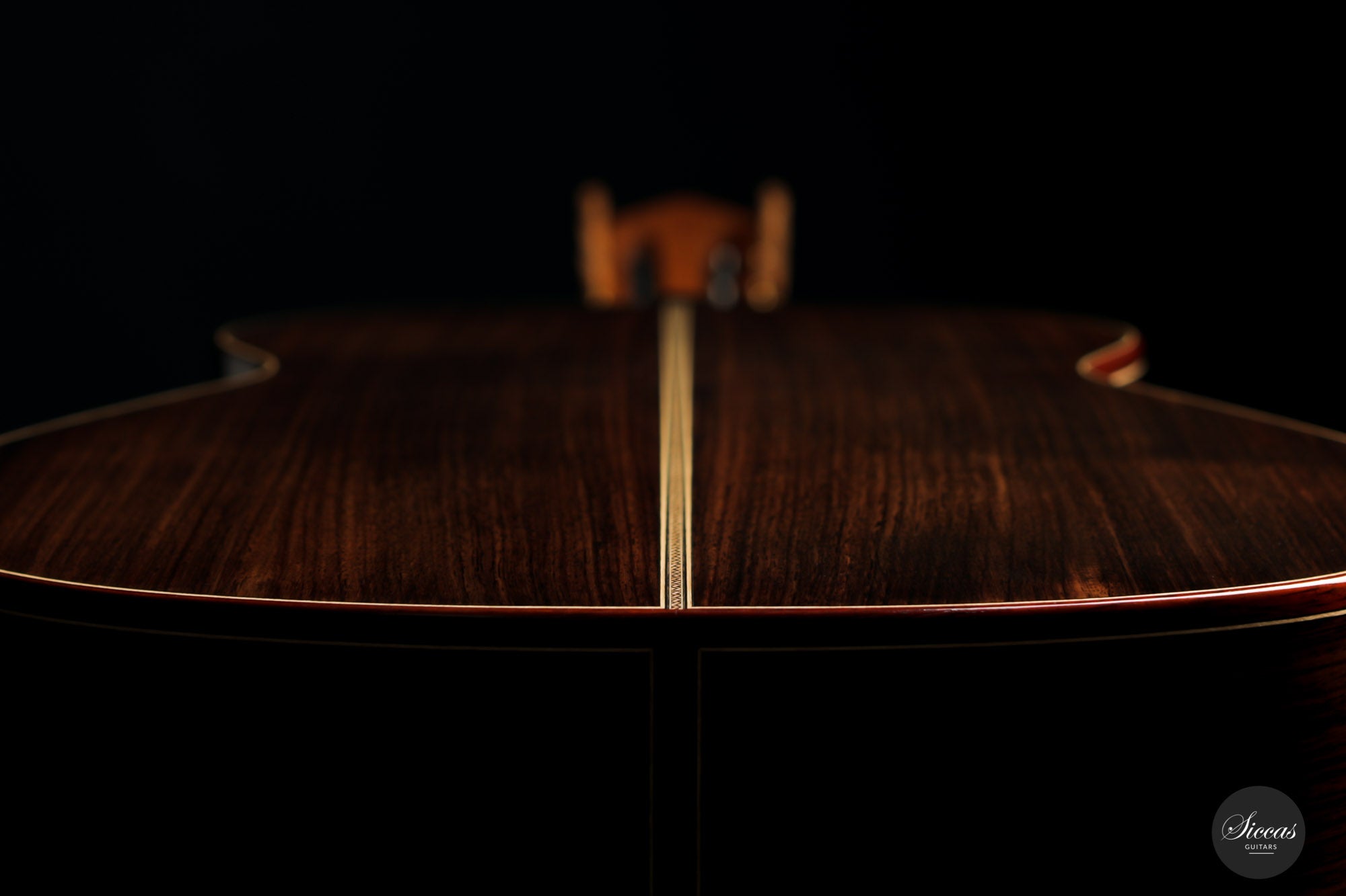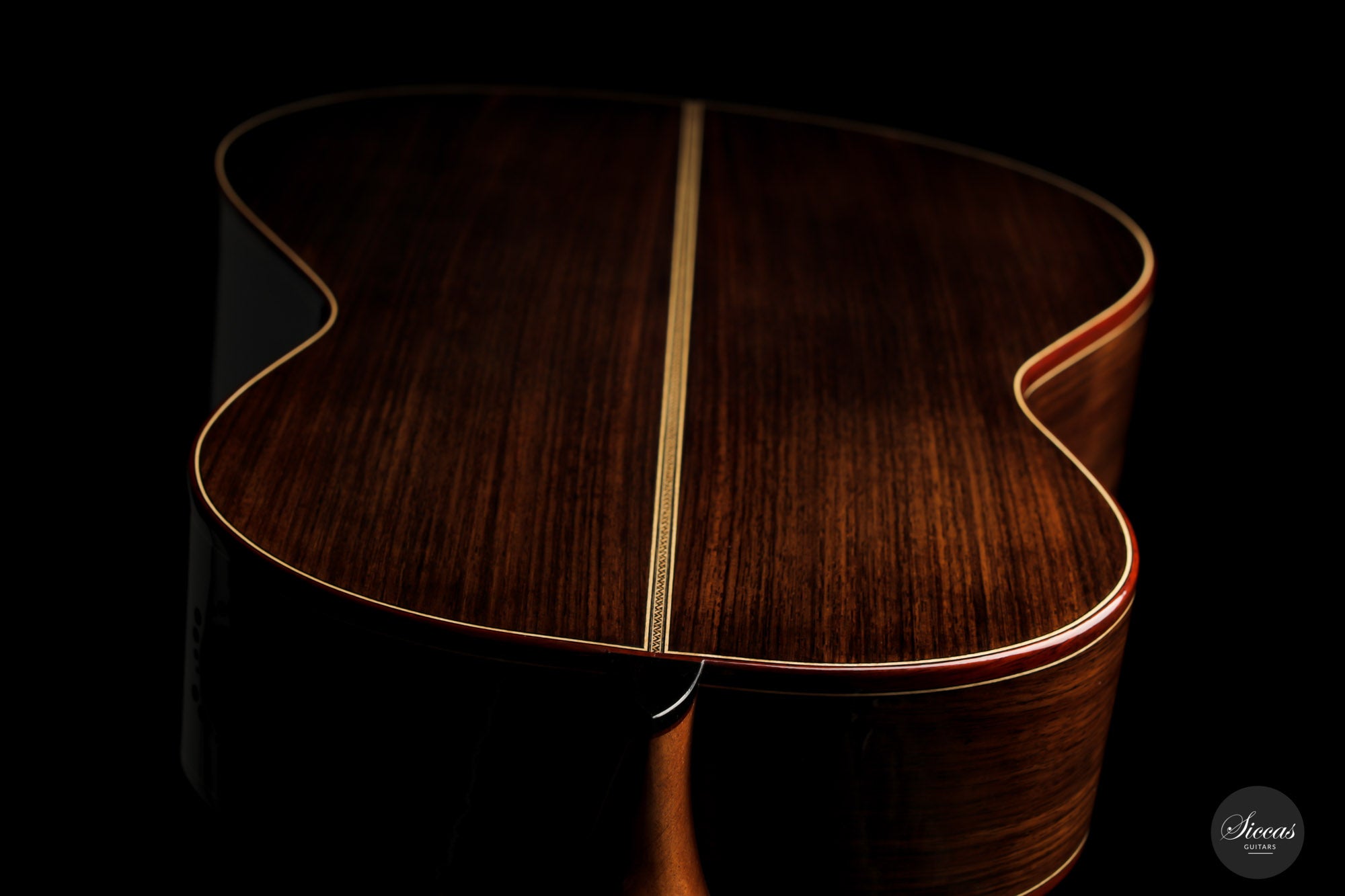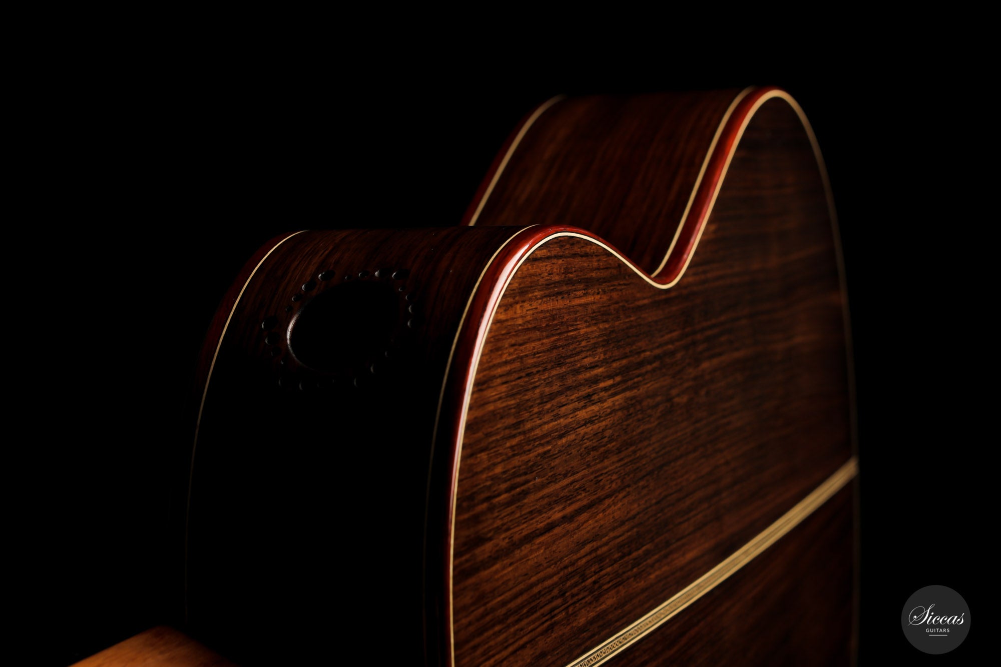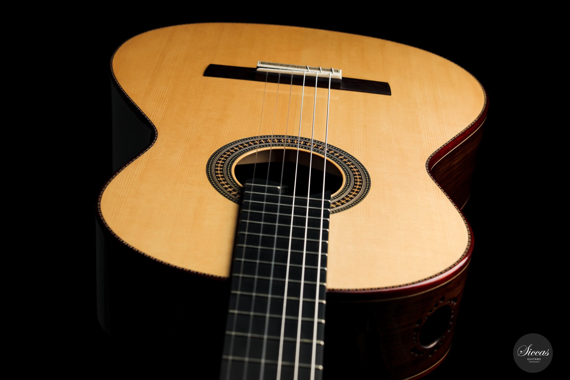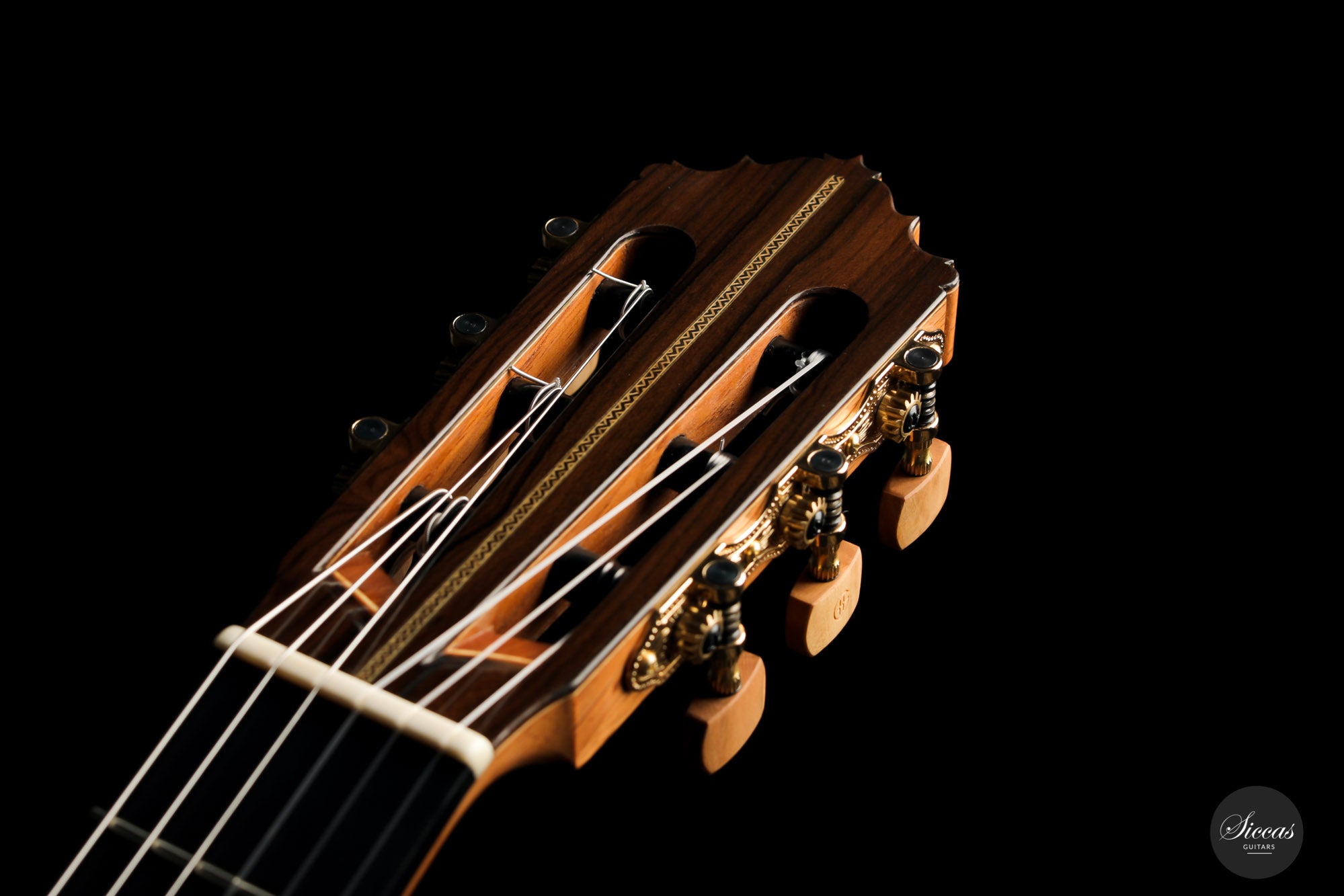 What an impressive volume for a traditionally built fan-braced guitar. The tone production feels similar to that of a grand piano, and each note develops with clarity, volume, and confidence. The voicing is very easy to define, and excellent tone separation combined with a reliable, well-balanced tone offers fantastic intelligibility in the polyphony. Finally, the future owner of this charming instrument will enjoy a top-notch left-hand comfort and refined chamber music playing experience thanks to the extra sound port on the side.