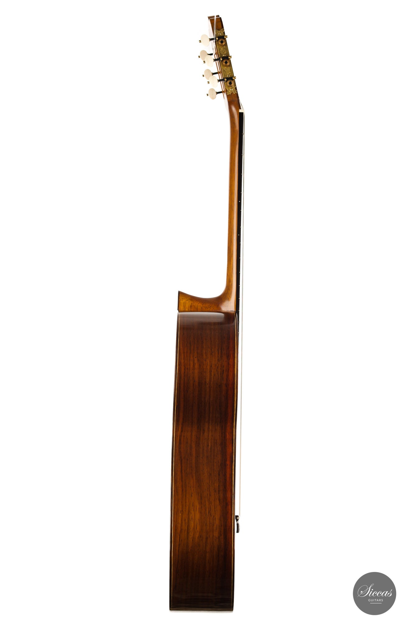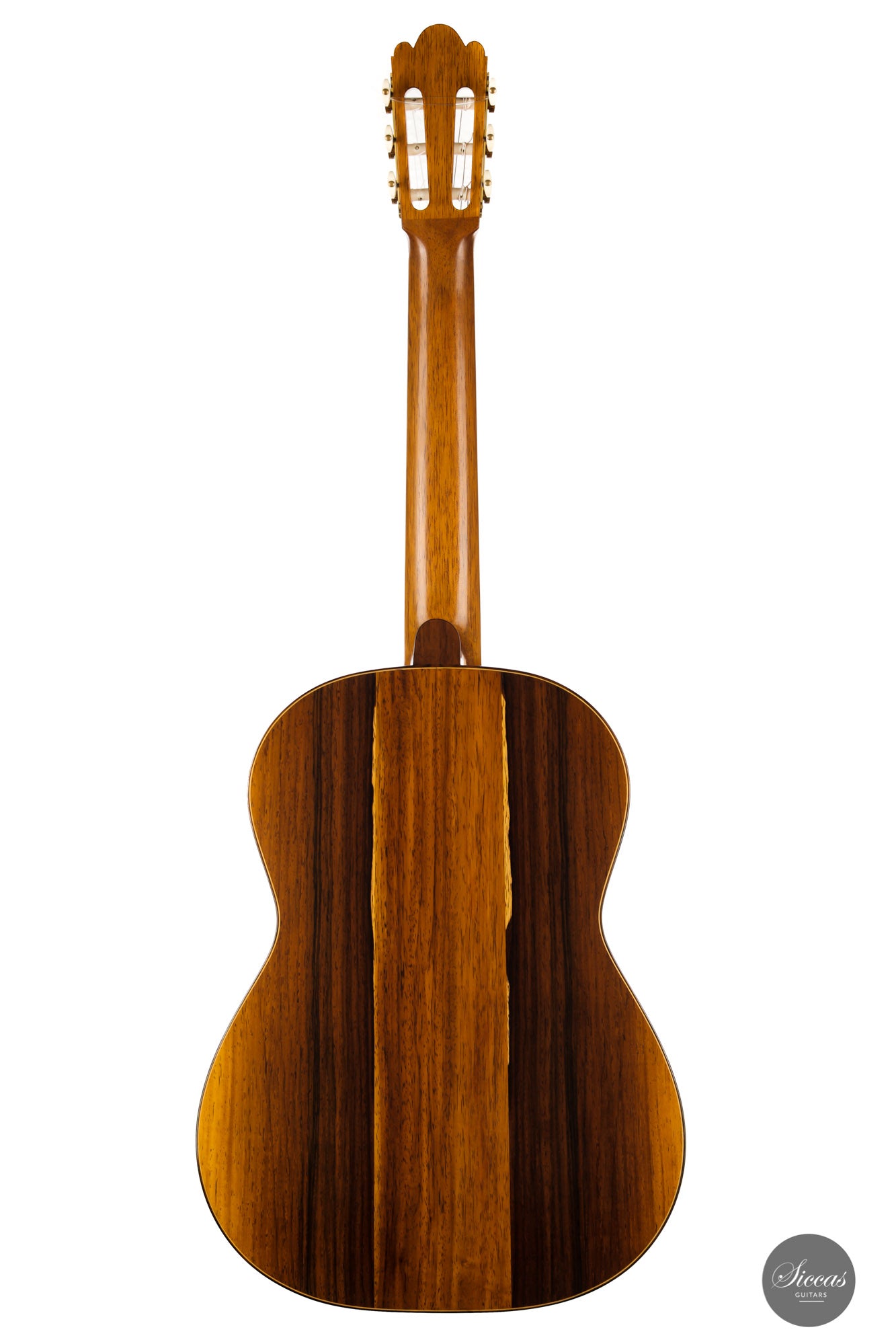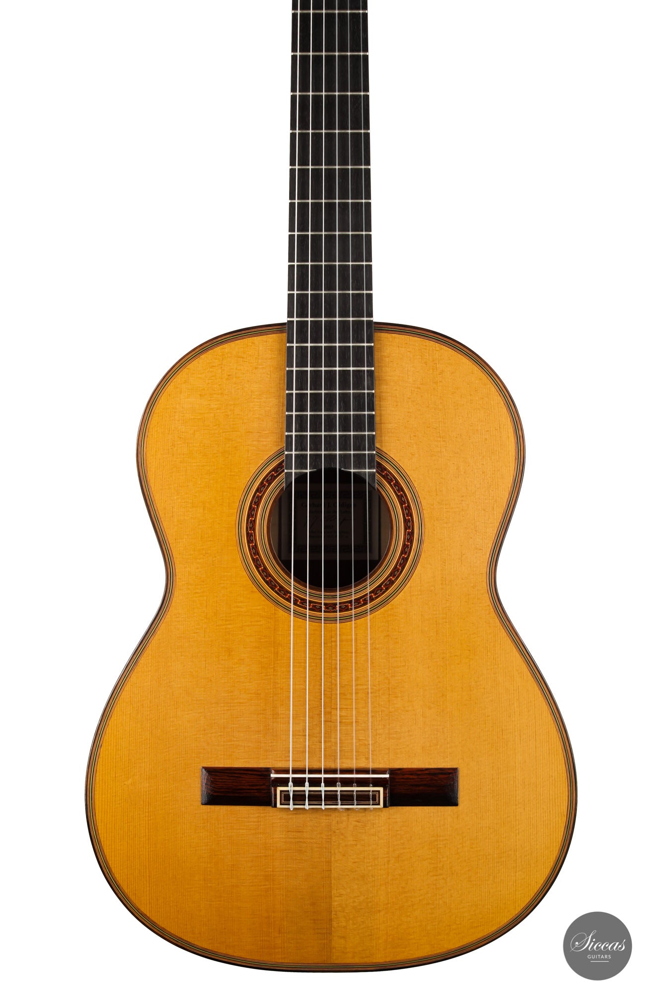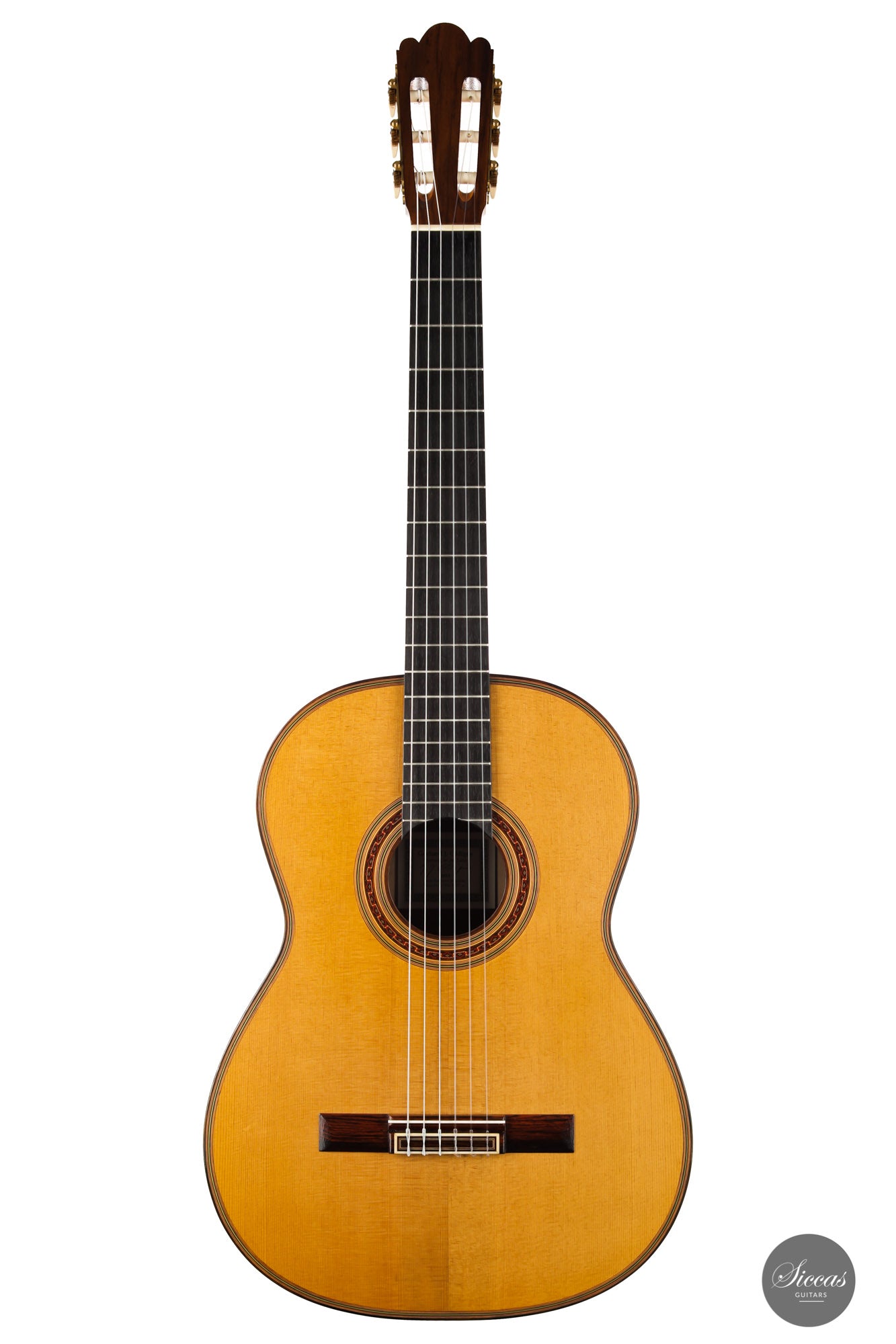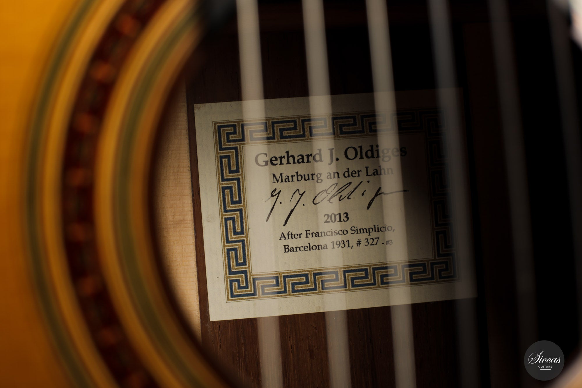 What a wonderful instrument inspired by one of the very last guitars made by the great luthier Francisco Simplicio (1874-1932) from Barcelona. Many details of the appearance and construction of the 1931 Francisco Simplicio guitar, bearing the number 327, have been faithfully reproduced, while Gérhard Oldiges also took the liberty of adding his own personal touch. The three-piece back made of the finest Brazilian rosewood is simply outstanding and presents an unmistakable color pattern. The soundboard, made of torrefied spruce, has furthermore developed a gorgeous honey color. Torrefaction reproduces the dryness and thus the response of a wood that has been dried for decades, offering a special response and excellent tone. Last but not least, this instrument is in perfect condition and is fitted with high-end Scheller tuning machines that have been intricately engraved by hand in Germany.