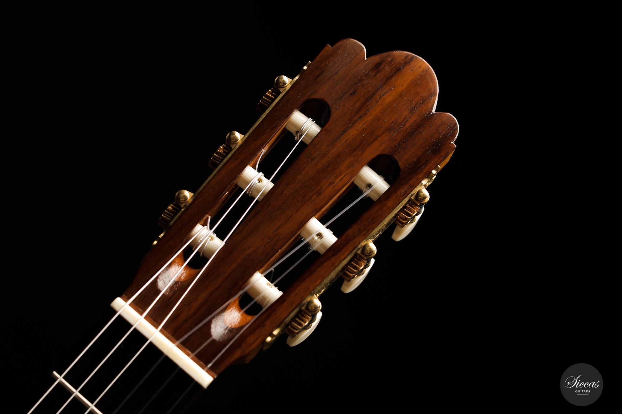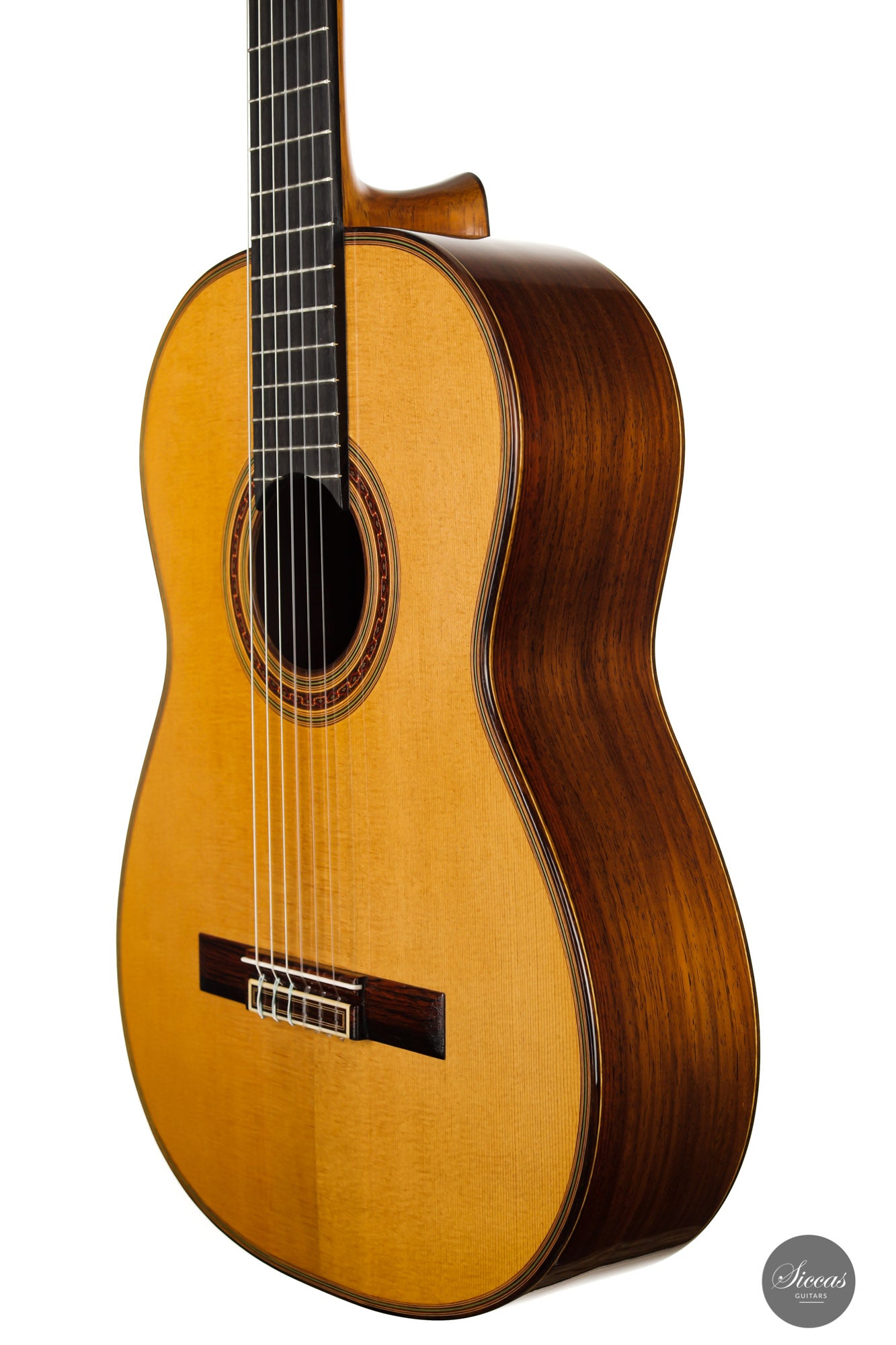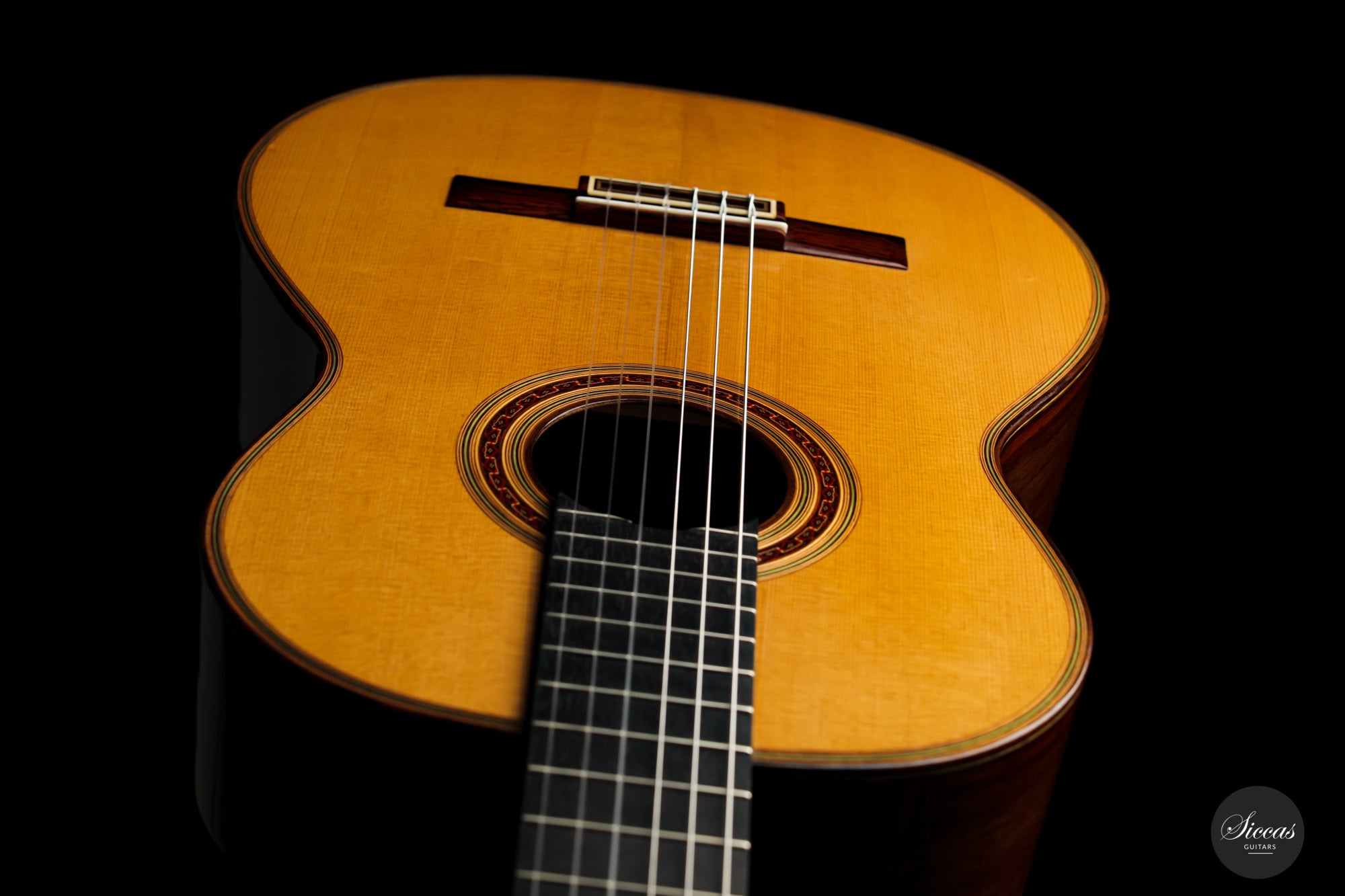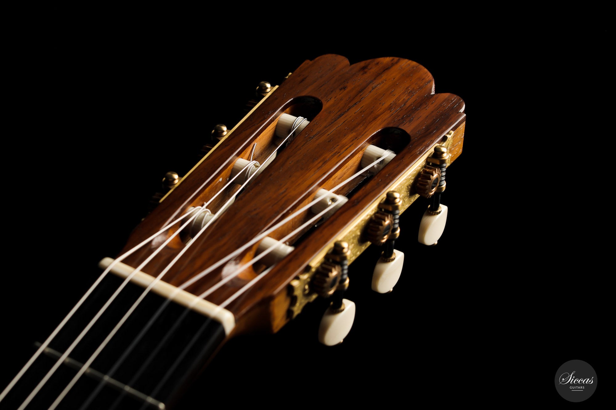 What a wonderful instrument inspired by one of the very last guitars made by the great luthier Francisco Simplicio (1874-1932) from Barcelona. Many details of the appearance and construction of the 1931 Francisco Simplicio guitar, bearing the number 327, have been faithfully reproduced, while Gérhard Oldiges also took the liberty of adding his own personal touch. The three-piece back made of the finest Brazilian rosewood is simply outstanding and presents an unmistakable color pattern. The soundboard, made of torrefied spruce, has furthermore developed a gorgeous honey color. Torrefaction reproduces the dryness and thus the response of a wood that has been dried for decades, offering a special response and excellent tone. Last but not least, this instrument is in perfect condition and is fitted with high-end Scheller tuning machines that have been intricately engraved by hand in Germany.