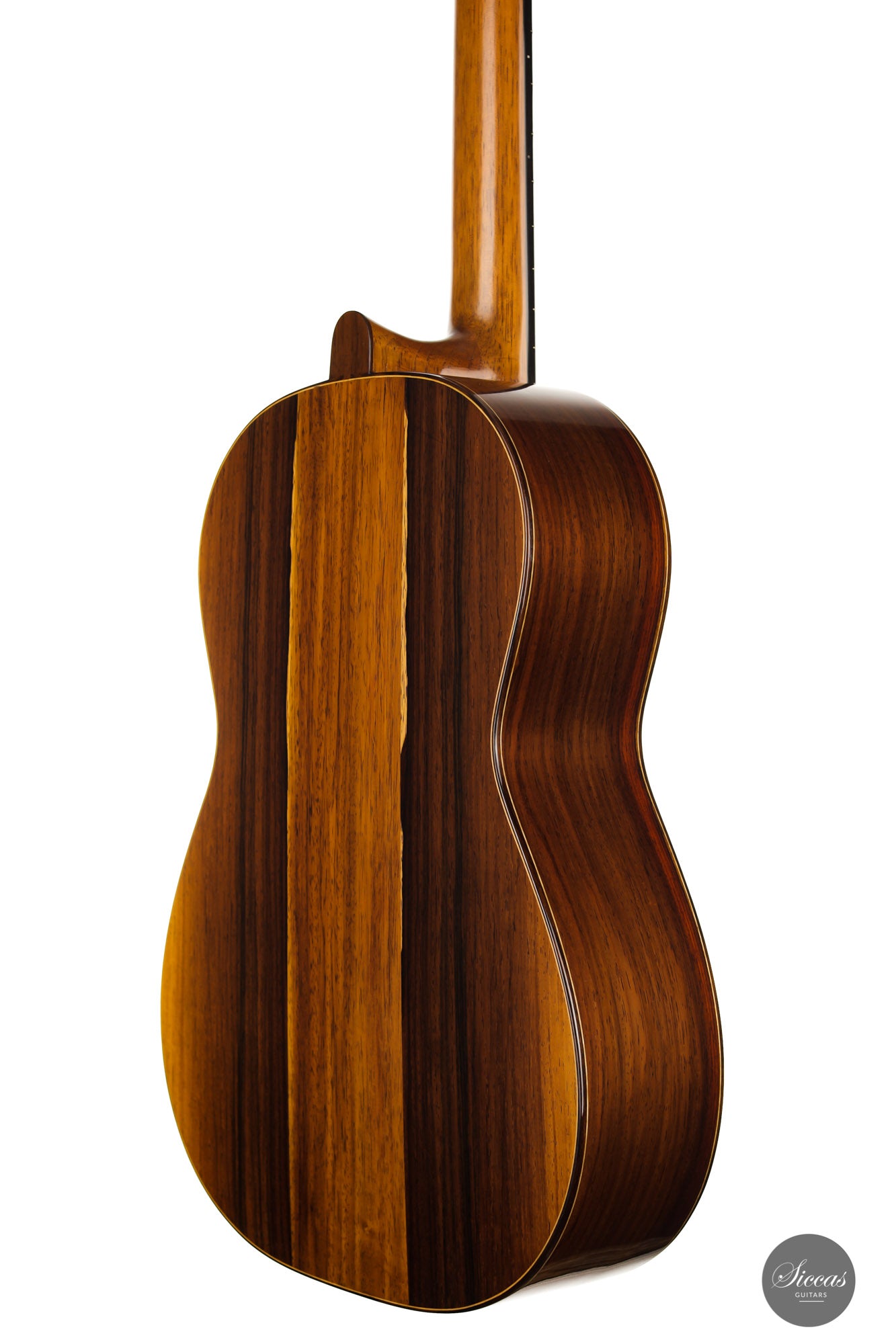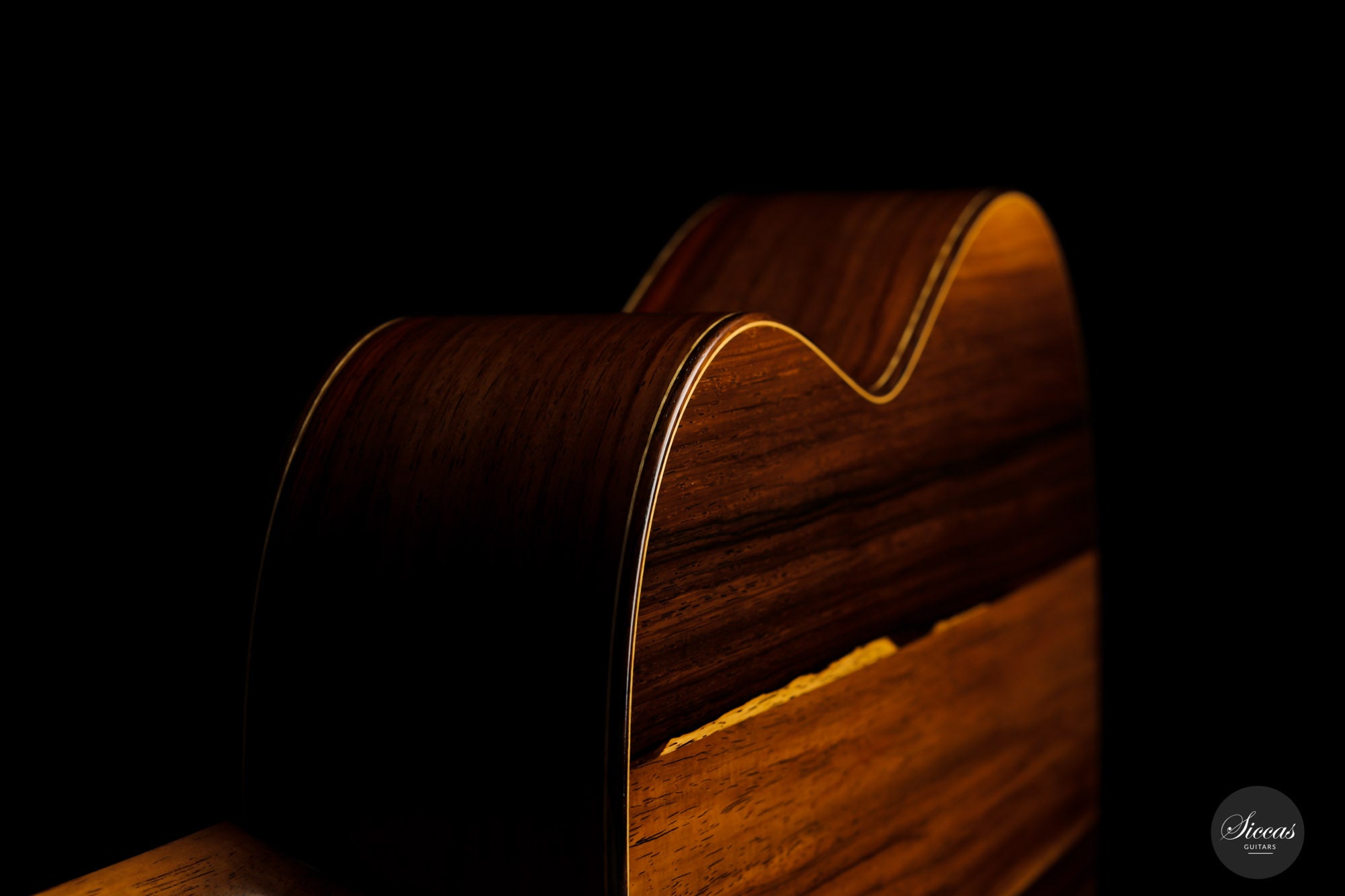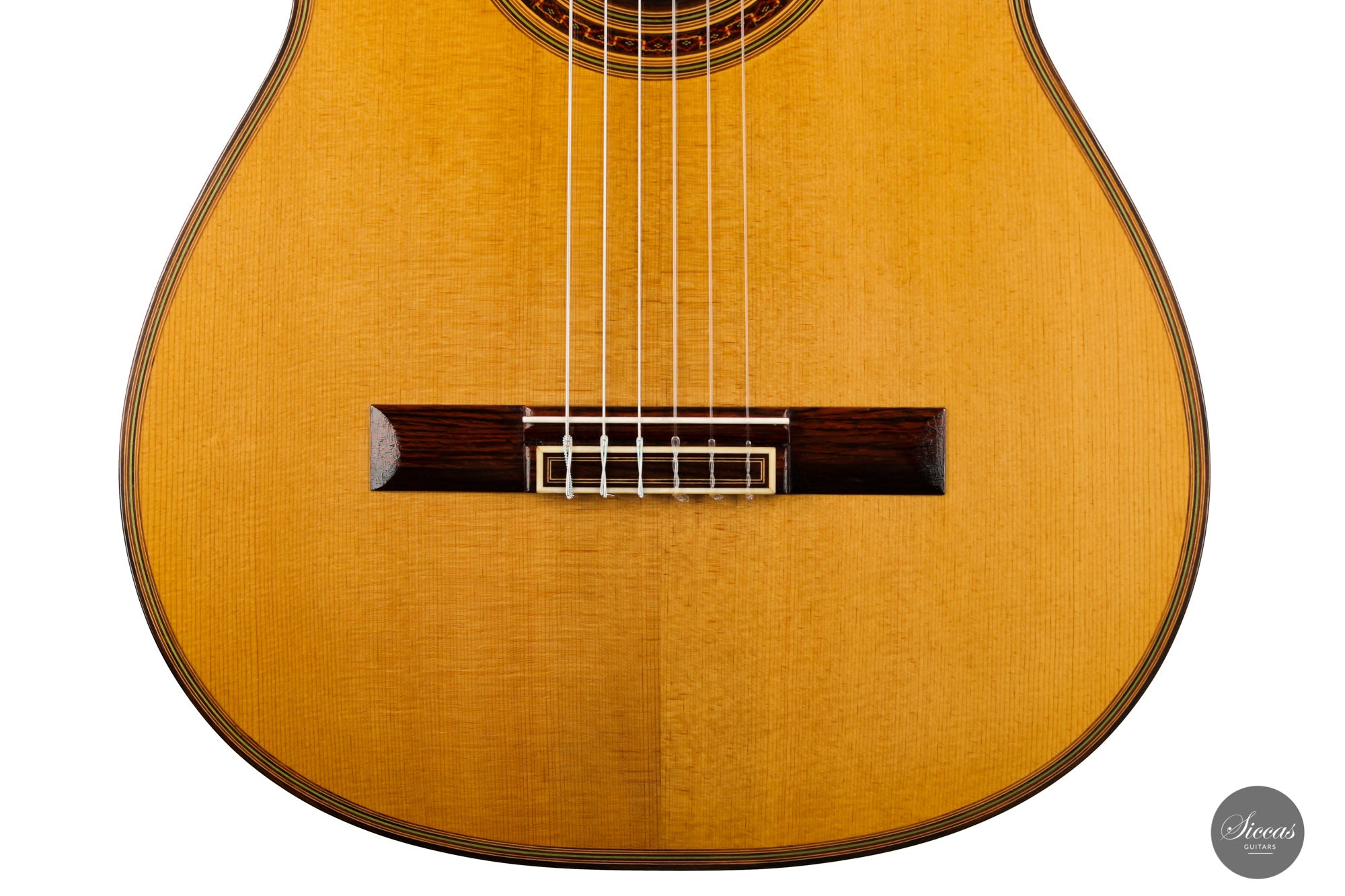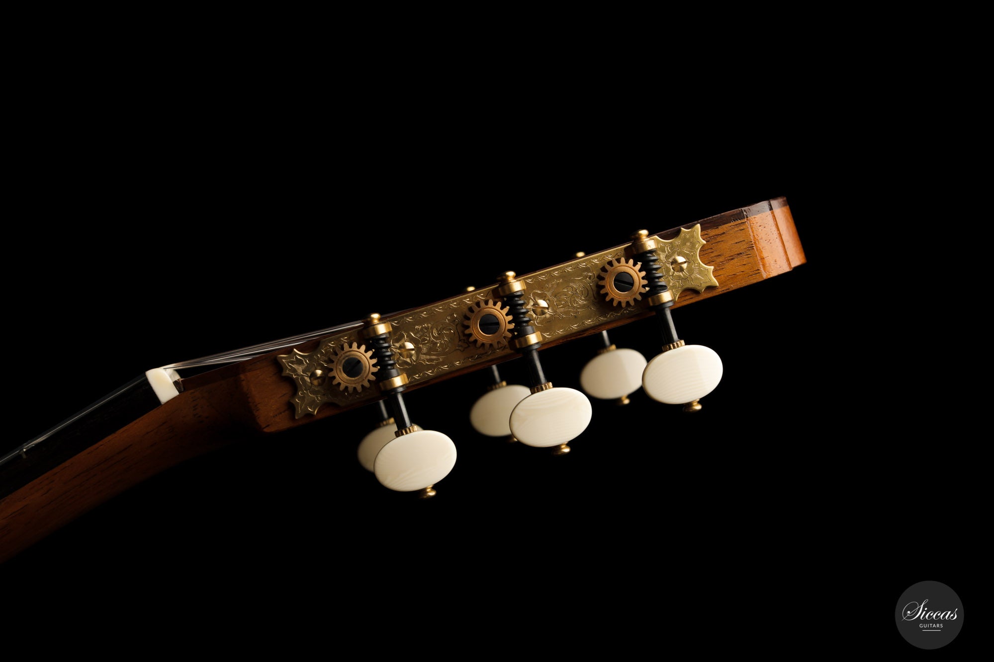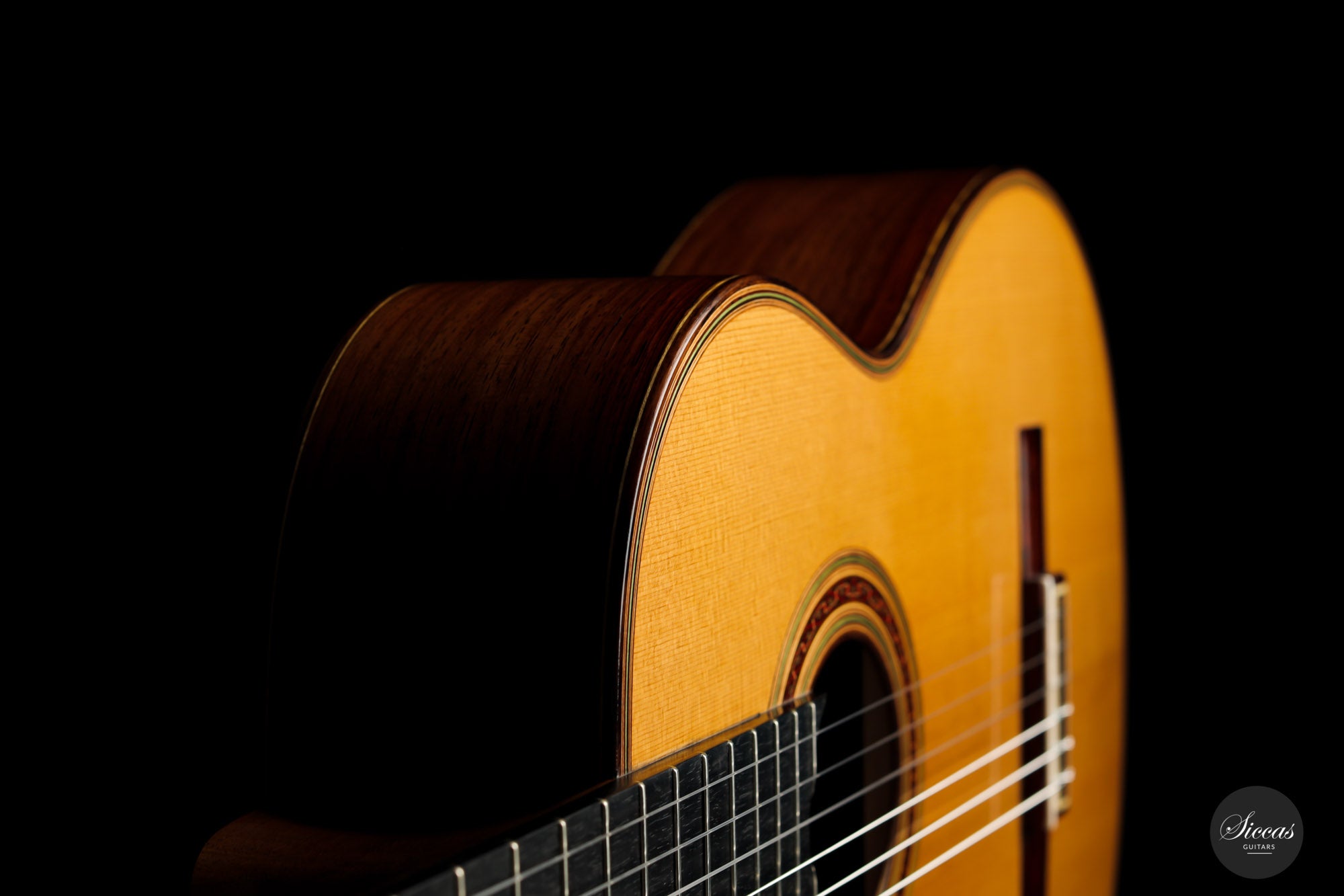 What a wonderful instrument inspired by one of the very last guitars made by the great luthier Francisco Simplicio (1874-1932) from Barcelona. Many details of the appearance and construction of the 1931 Francisco Simplicio guitar, bearing the number 327, have been faithfully reproduced, while Gérhard Oldiges also took the liberty of adding his own personal touch. The three-piece back made of the finest Brazilian rosewood is simply outstanding and presents an unmistakable color pattern. The soundboard, made of torrefied spruce, has furthermore developed a gorgeous honey color. Torrefaction reproduces the dryness and thus the response of a wood that has been dried for decades, offering a special response and excellent tone. Last but not least, this instrument is in perfect condition and is fitted with high-end Scheller tuning machines that have been intricately engraved by hand in Germany.