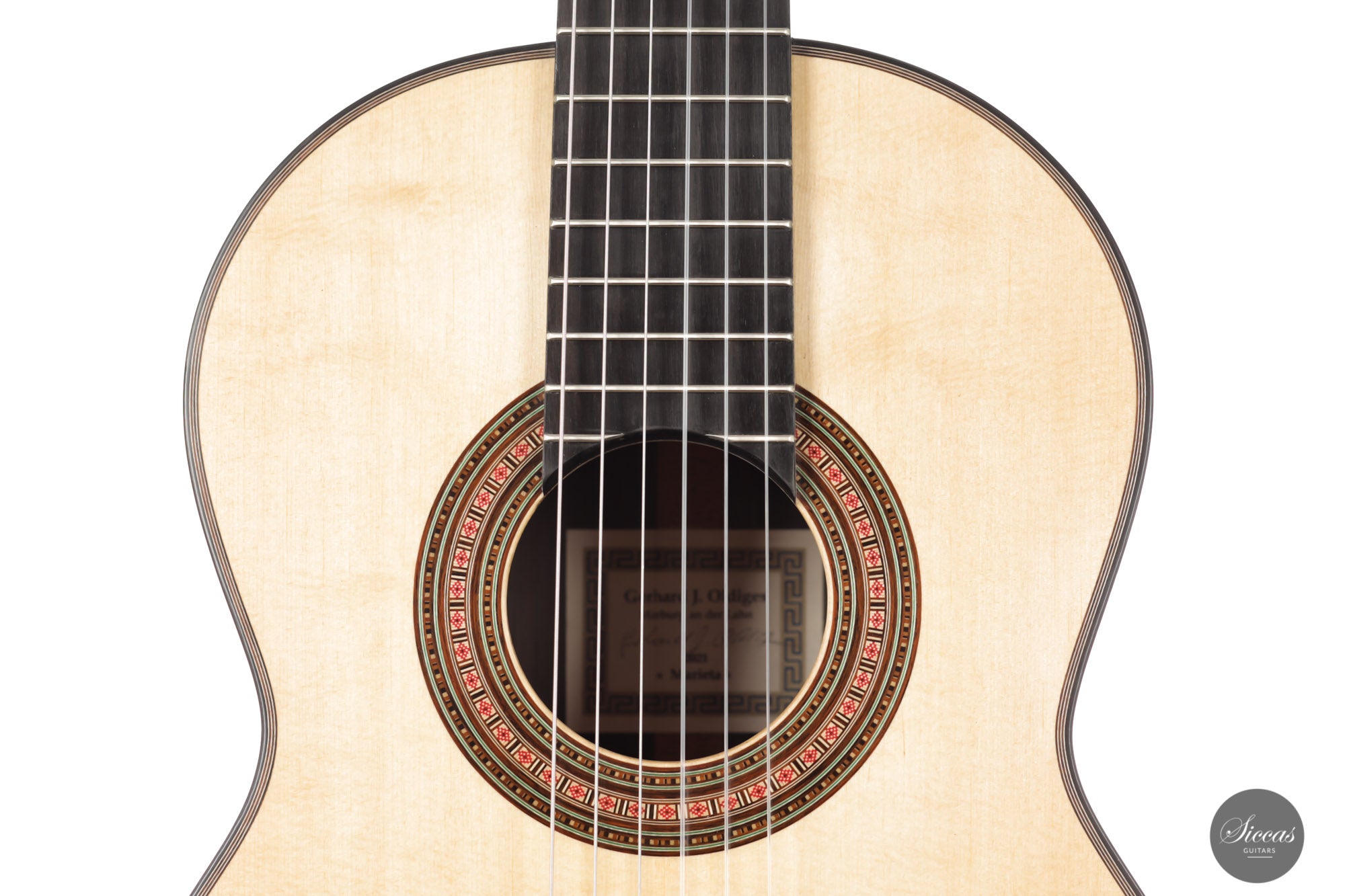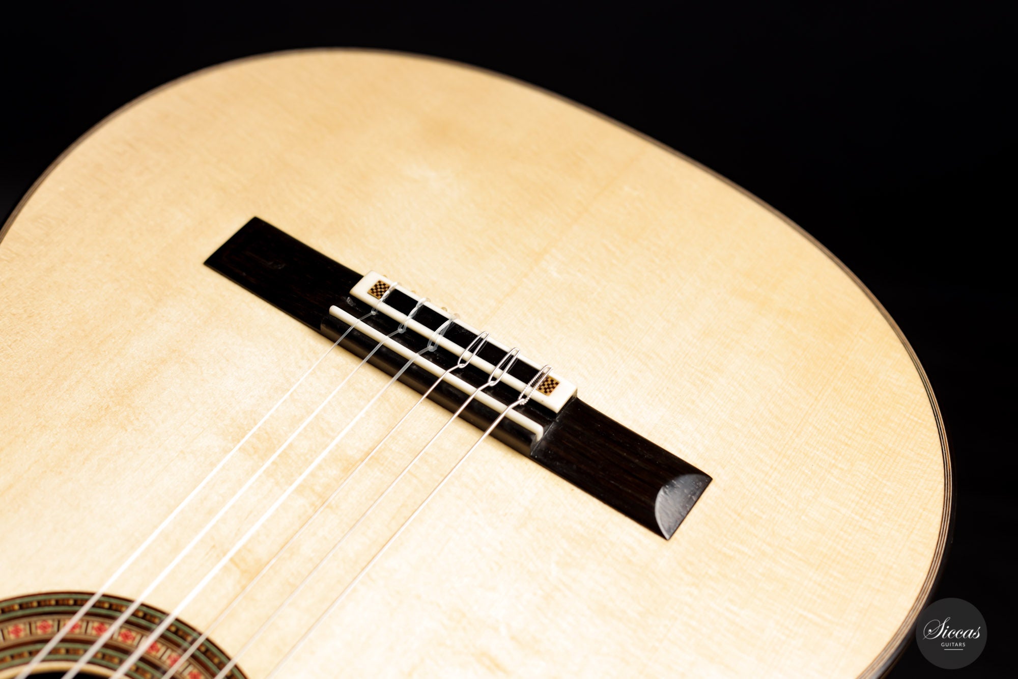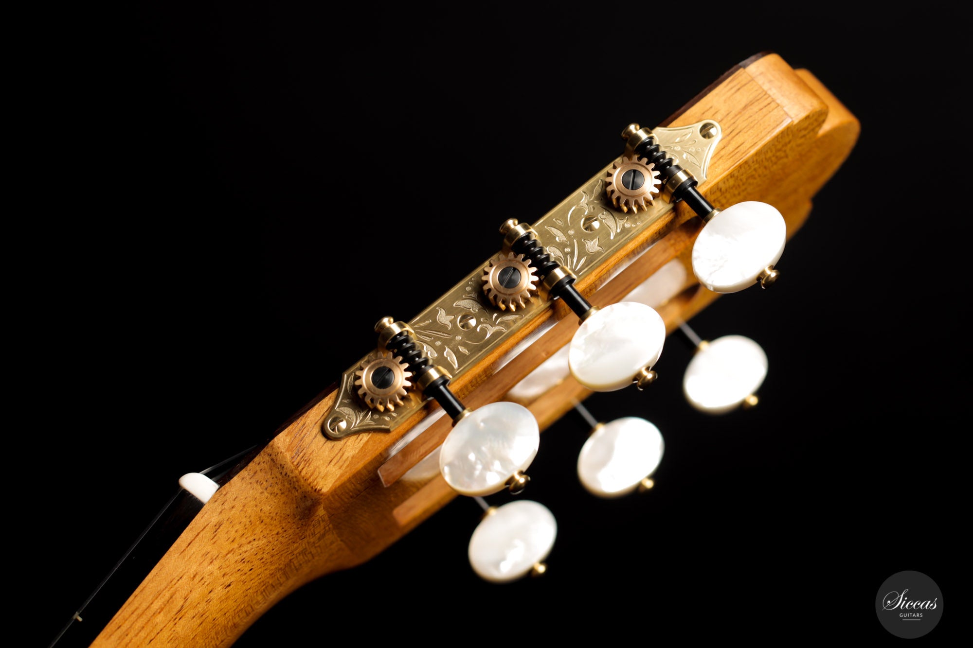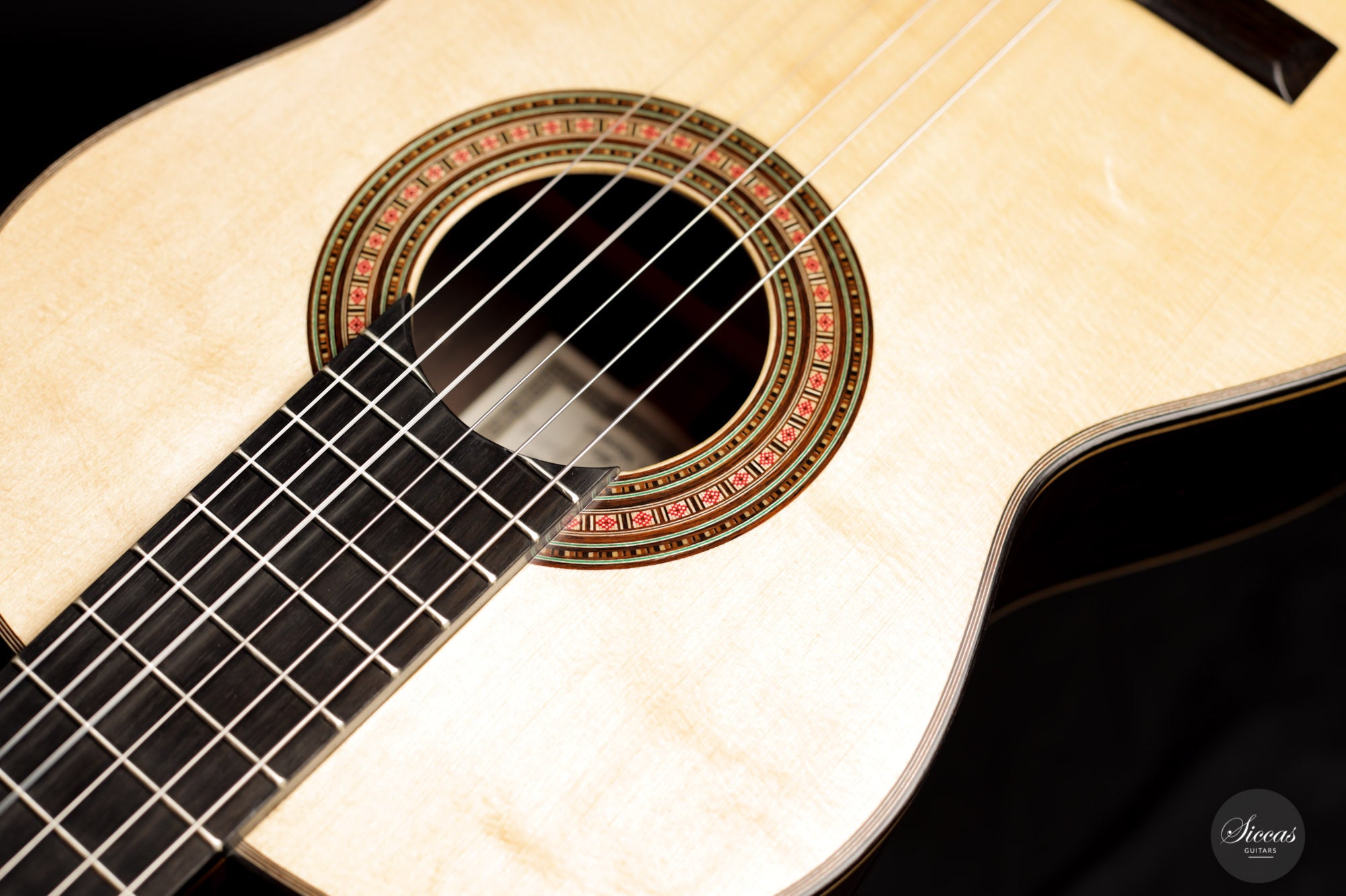 This Margherita special model by Gerhard Oldiges is called "Marieta". Very accurate attention to detail went into the construction and, as always with Gerhard, the result is a true masterpiece. The entire plantilla is reminiscent of Torres' more compact guitars, and a particularly fine set of CITES-certified Rio rosewood was chosen for the back and sides. The latter has a particularly dark color with bright orange veins, making it a true showpiece. For the top, Gerhard Oldiges chose delightful bear claw spruce, and some gorgeous hand-engraved German Scheller tuners perfectly set the mood. The marquetry work is also of great elegance. The checkerboard pattern is found on both the bridge and the central ebony part of the back, and the remarkable rosette is proof of the highest craftsmanship.